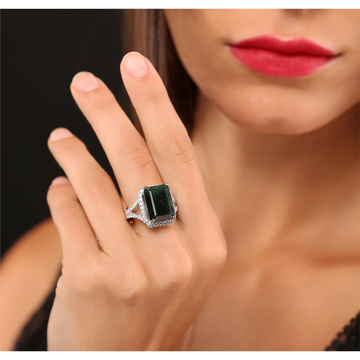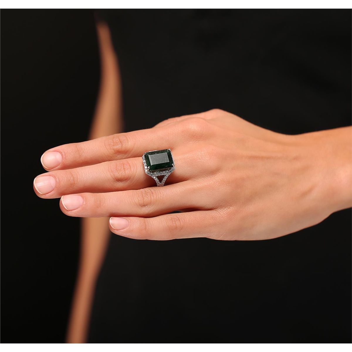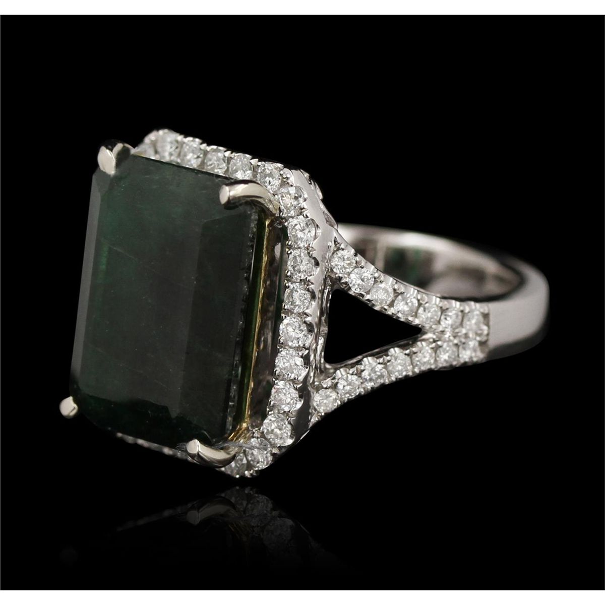 One electronically tested 14KT white ladies cast emerald and diamond ring with a bright polish finish. Condition is new, good workmanship. The featured emerald is set within a diamond bezel supported by diamond set split shoulders, completed by a four millimeter wide band. Identified with markings of "14K". Containing: One prong set rectangular step cut natural emerald, measuring 15.00 x 11.10 x 5.70mm, 5% bulge factor, approximate weight of 8.01ct., clarity is heavily included, type III, dark, very slightly grayish, very strongly bluish green color, (GIA vstbG 7/3), cut is good. Transmitting light somewhat diffusely, translucent. Naturally occurring internal & external characteristics are present. Indications of oil, & opticon residue. Colored Stone Grading Report attached. Graded in the setting. Fifty-six prong set round brilliant cut diamonds, measuring 1.70 - 1.40 x 0.93mm (depth est.) approximate total weight of 56 Stones = 0.89ct. Graded in the setting. Clarity I-1 to 1-2. Color G - I. Total Weight of Colored Stones 8.01ct. Total Weight of Diamonds 0.89ct. Total Weight of Ring 9.21gm. AIG Appraised at $6,165.00.