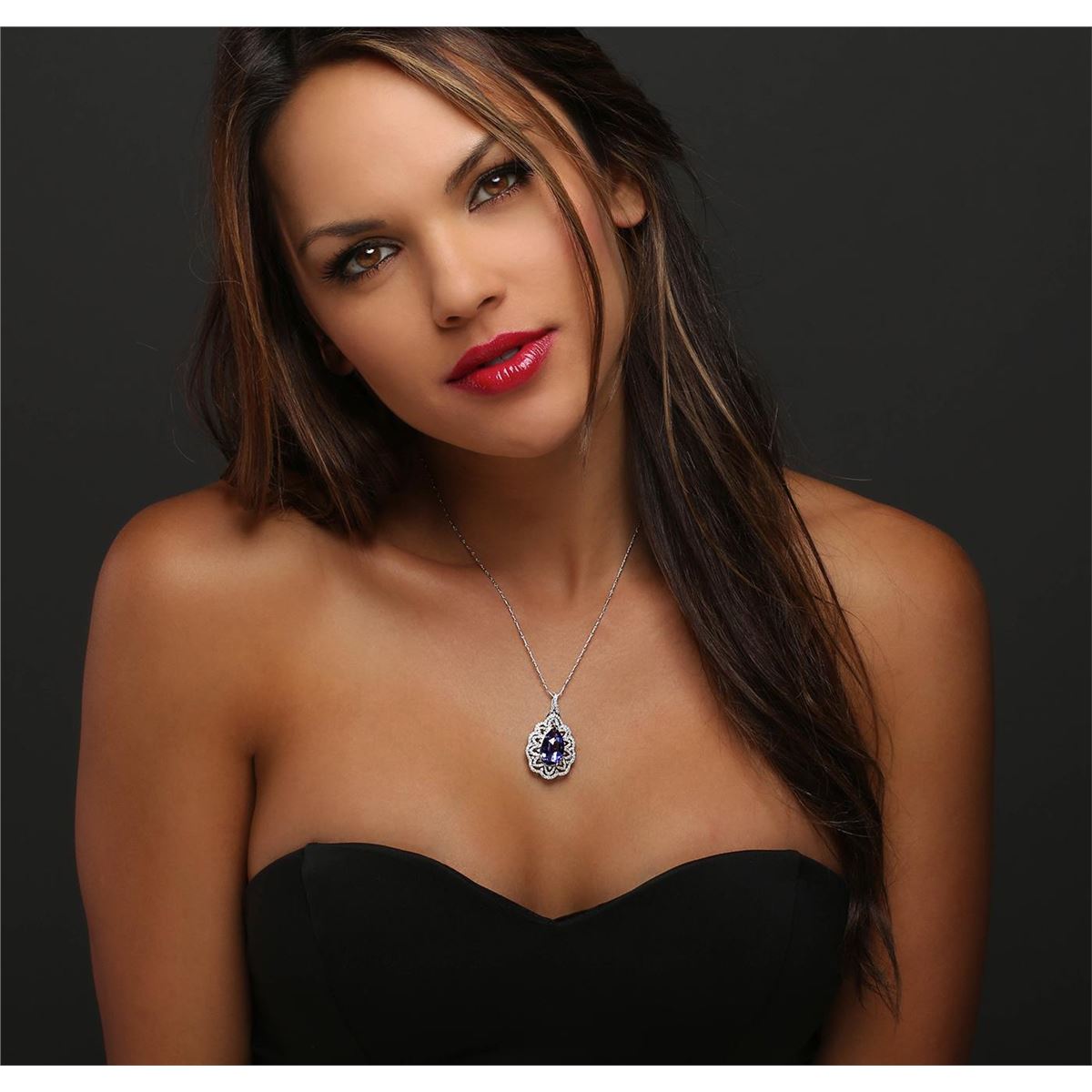 One electronically tested 14KT white gold ladies cast & assembled tanzanite and diamond pendant with chain. The pendant features a tanzanite set within a diamond lattice, completed by a diamond set bail. The pendant is supported by an eighteen inch length 14KT white gold designer style chain, terminating in a lobster claw clasp. Bright polish finish. Trademark is PMI. Identified with markings of "14K". Condition is new, good workmanship. Containing: One prong set pear mixed cut natural tanzanite, measuring 16.80 x 10.30 x 6.40mm, 8% bulge factor, approximate weight of 8.01ct., clarity is eye clean, type I, medium dark, very slightly grayish, bluish violet color, (GIA bV 6/3), cut is good. Transmitting light with no distortion, transparent. Colored Stone Grading Report attached. Graded in the setting. Tanzanite is a very rare gemstone that is only found in the country of Tanzania. Originally discovered in 1967. Tiffany & Company, named the stone Tanzanite. It is found in the Usumburu Mountains that border the Umba Valley of northern Tanzania. Tanzanite occurs in gray, brown, violet, blue, reddish-purple, & green. The gem is interesting because of its exceptional pleochroism. Rotated in different directions a tanzanite will exhibit multiple changes of color. Tanzanite has a low tolerance to ultrasonic cleaning, and should not be cleaned using this method. One Hundred Sixty-Two prong set round brilliant cut diamonds, measuring 1.20 - 1.10 x 0.69mm (depth est.) approximate total weight of 162 Stones = 1.00ct. Graded in the setting. Clarity: I-1 to I-2. Color: G - I. Total Weight of Colored Stones 8.01ct. Total Weight of Diamonds 1.00ct. Total Weight of Pendant With Chain 11.92 grams. AIG Appraised at $25,040.00.