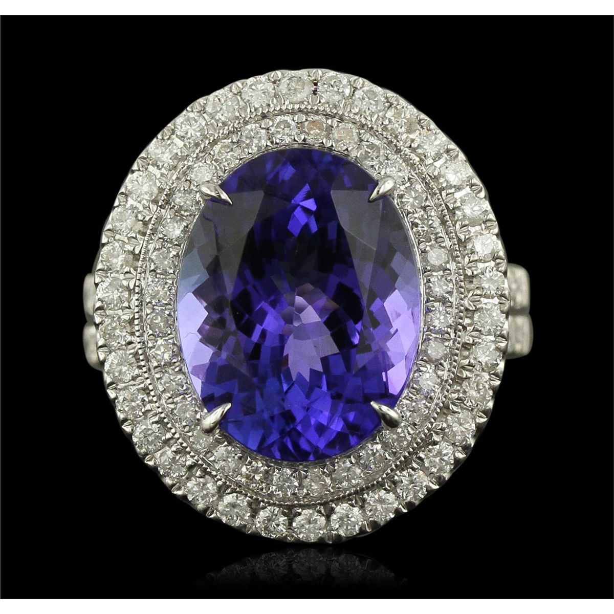 One electronically tested 14KT white gold ladies cast tanzanite and diamond ring. Condition is new, good workmanship. The featured tanzanite is set within a two tiered diamond lattice gallery, supported by diamond set split shoulders and completed by a four millimeter wide band. Bright polish finish with milgrain detailing throughout. Trademark is UCG. Identified with markings of "14K 585". Containing: One prong set oval mixed cut natural tanzanite, measuring 13.85 x 10.85 x 7.20mm, 8%. bulge factor, approximate weight of 8.01ct., clarity is eye clean, type I, medium dark, moderately strong, bluish violet color, (GIA bV 6/4), cut is good. Transmitting light with no distortion, transparent. Colored Stone Grading Report attached. Graded in the setting. Tanzanite is a very rare gemstone that is only found in the country of Tanzania. Originally discovered in 1967. Tiffany & Company, named the stone Tanzanite. It is found in the Usumburu Mountains that border the Umba Valley of northern Tanzania. Tanzanite occurs in gray, brown, violet, blue, reddish-purple, & green. The gem is interesting because of its exceptional pleochroism. Rotated in different directions a tanzanite will exhibit multiple changes of color. Tanzanite has a low tolerance to ultrasonic cleaning, and should not be cleaned using this method. Forty-Four prong set round brilliant cut diamonds, measuring 1.40 - 1.30 x 0.81mm (depth est.) approximate. Total Weight of 44 Stones = 0.49ct. Graded in the setting. Clarity: SI-2 to I-2. Color: F - H Fifty-Four prong set round brilliant cut diamonds, measuring 1.60 - 1.50 x 0.93mm (depth est.) approximate. Total Weight of 54 Stones = 0.83ct. Graded in the setting. Clarity: SI-2 to I-2. Color: F - H. Total Weight of Colored Stones 8.01ct. Total Weight of Diamonds 1.32ct. Total Weight of Ring 8.70 grams. AIG Appraised at $25,525.00.