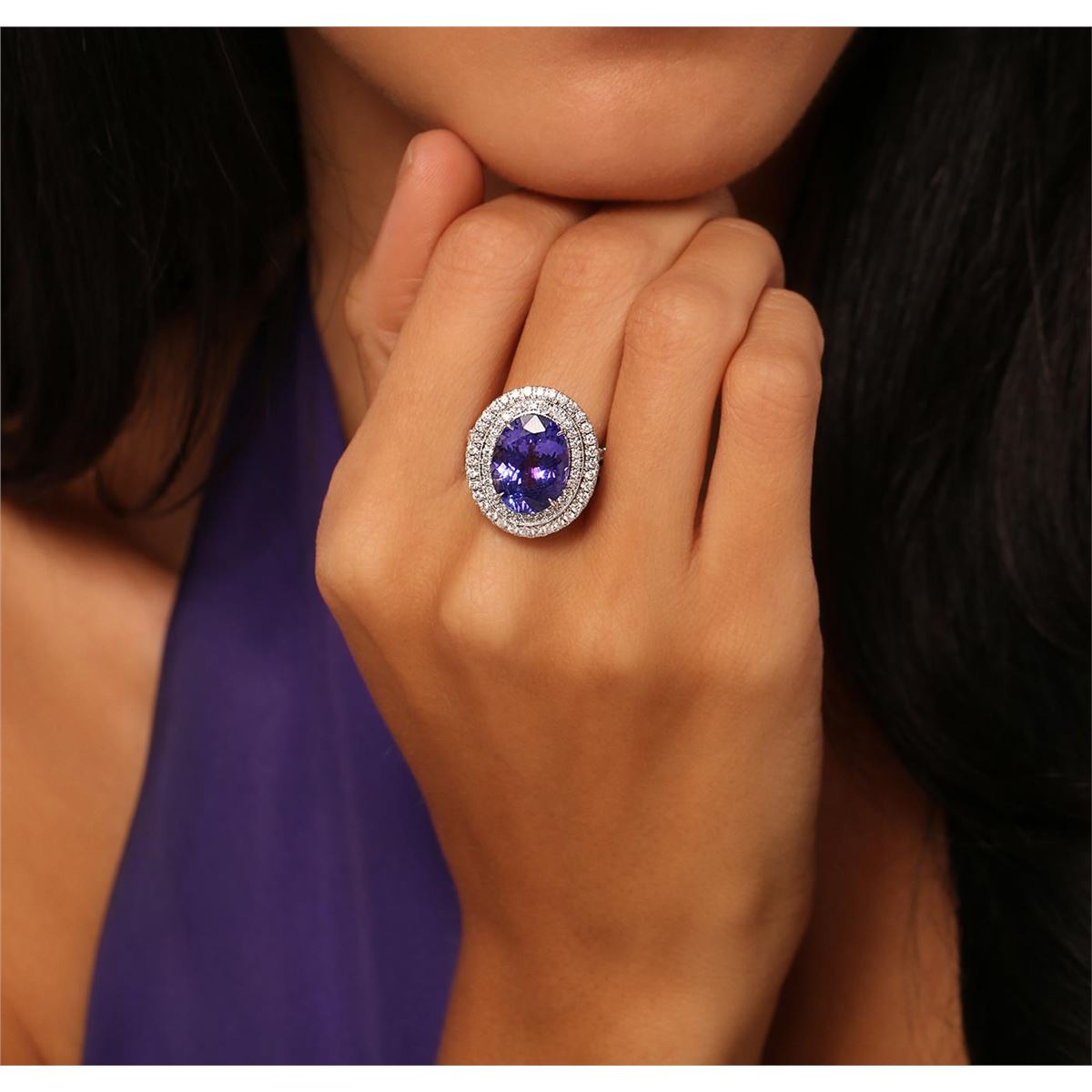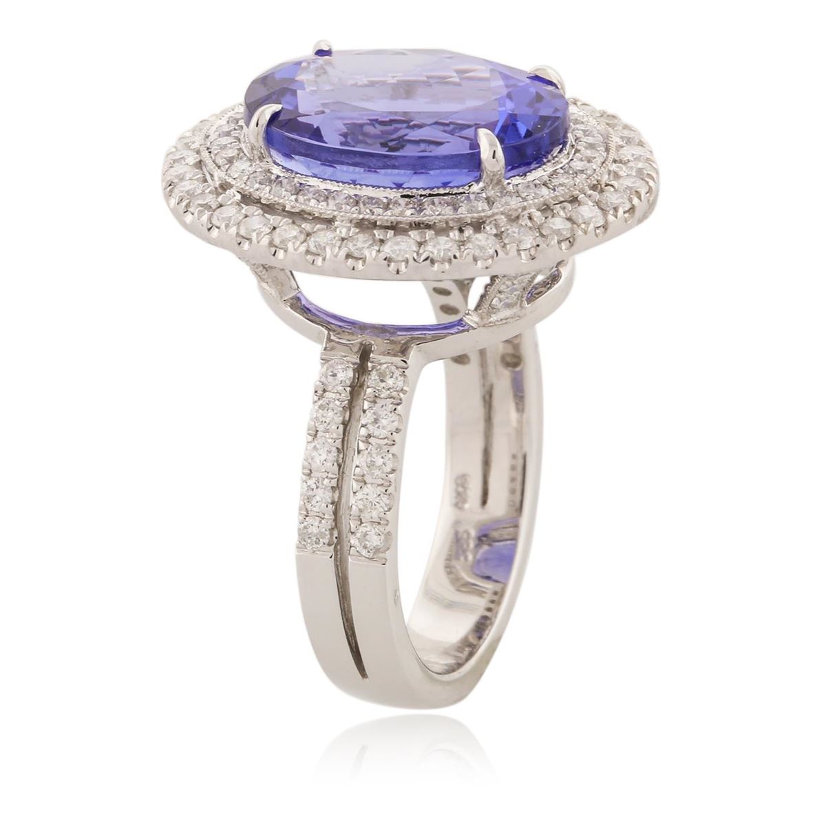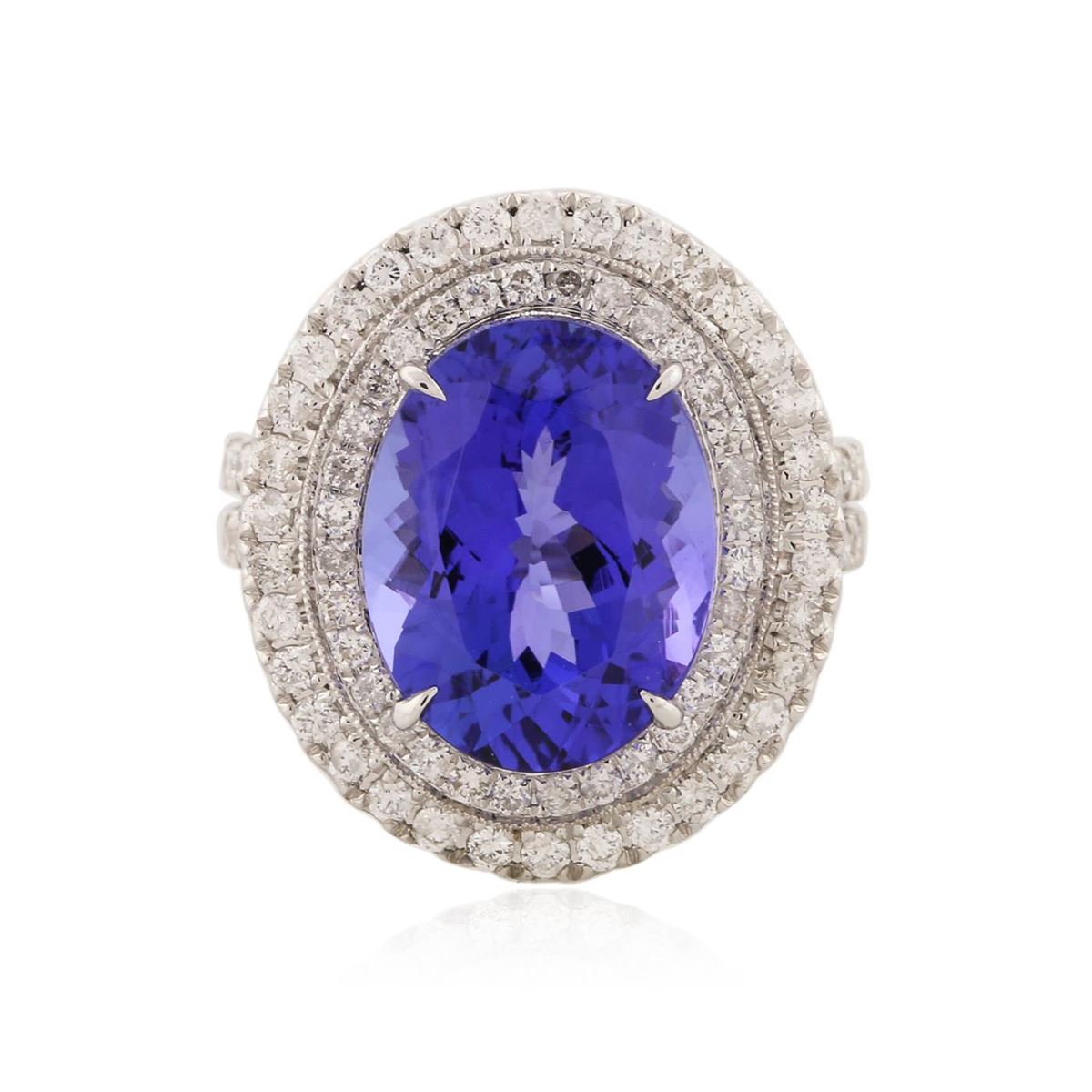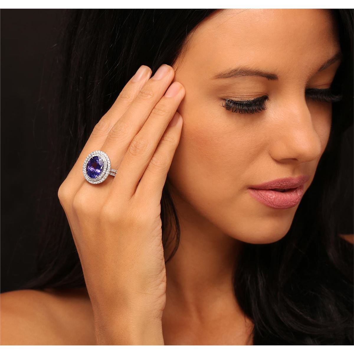 One electronically tested 14KT white gold ladies cast tanzanite and diamond ring. Condition is new, good workmanship. The featured tanzanite is set within a two tiered diamond lattice gallery, supported by diamond set split shoulders and completed by a four millimeter wide band. Bright polish finish with milgrain detailing throughout. Trademark is UCG. Identified with markings of "14K 585". Containing: One prong set oval mixed cut natural tanzanite, measuring 13.85 x 10.85 x 7.20mm, 8%. bulge factor, approximate weight of 8.01ct., clarity is eye clean, type I, medium dark, moderately strong, bluish violet color, (GIA bV 6/4), cut is good. Transmitting light with no distortion, transparent. Colored Stone Grading Report attached. Graded in the setting. Tanzanite is a very rare gemstone that is only found in the country of Tanzania. Originally discovered in 1967. Tiffany & Company, named the stone Tanzanite. It is found in the Usumburu Mountains that border the Umba Valley of northern Tanzania. Tanzanite occurs in gray, brown, violet, blue, reddish-purple, & green. The gem is interesting because of its exceptional pleochroism. Rotated in different directions a tanzanite will exhibit multiple changes of color. Tanzanite has a low tolerance to ultrasonic cleaning, and should not be cleaned using this method. Forty-Four prong set round brilliant cut diamonds, measuring 1.40 - 1.30 x 0.81mm (depth est.) approximate. Total Weight of 44 Stones = 0.49ct. Graded in the setting. Clarity: SI-2 to I-2. Color: F - H Fifty-Four prong set round brilliant cut diamonds, measuring 1.60 - 1.50 x 0.93mm (depth est.) approximate. Total Weight of 54 Stones = 0.83ct. Graded in the setting. Clarity: SI-2 to I-2. Color: F - H. Total Weight of Colored Stones 8.01ct. Total Weight of Diamonds 1.32ct. Total Weight of Ring 8.70 grams. AIG Appraised at $25,525.00.