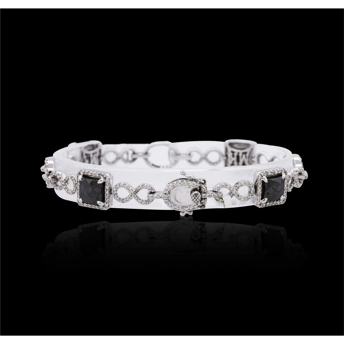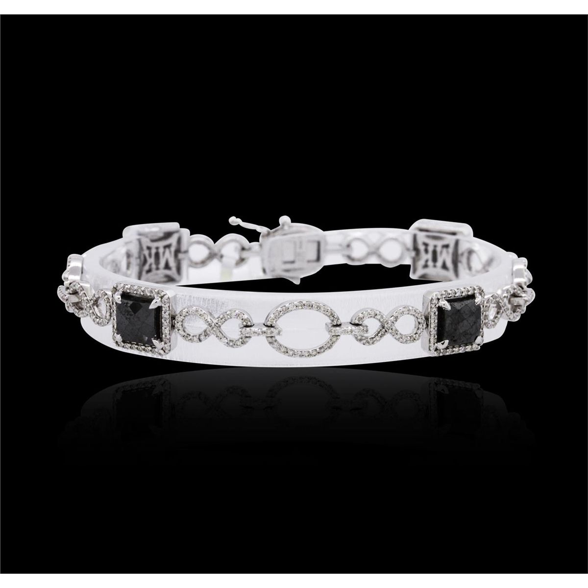 One 14KT white gold bracelet containing natural square rose cut fancy black diamonds, enhanced for color, with a total weight of 6.31ct. The bracelet also contains side stones graded F-G-H color, SI3-I2 clarity with a total weight of 1.72ct. Total weight of the pendant is 13.20 grams. EGL Appraised at $6,930.00.