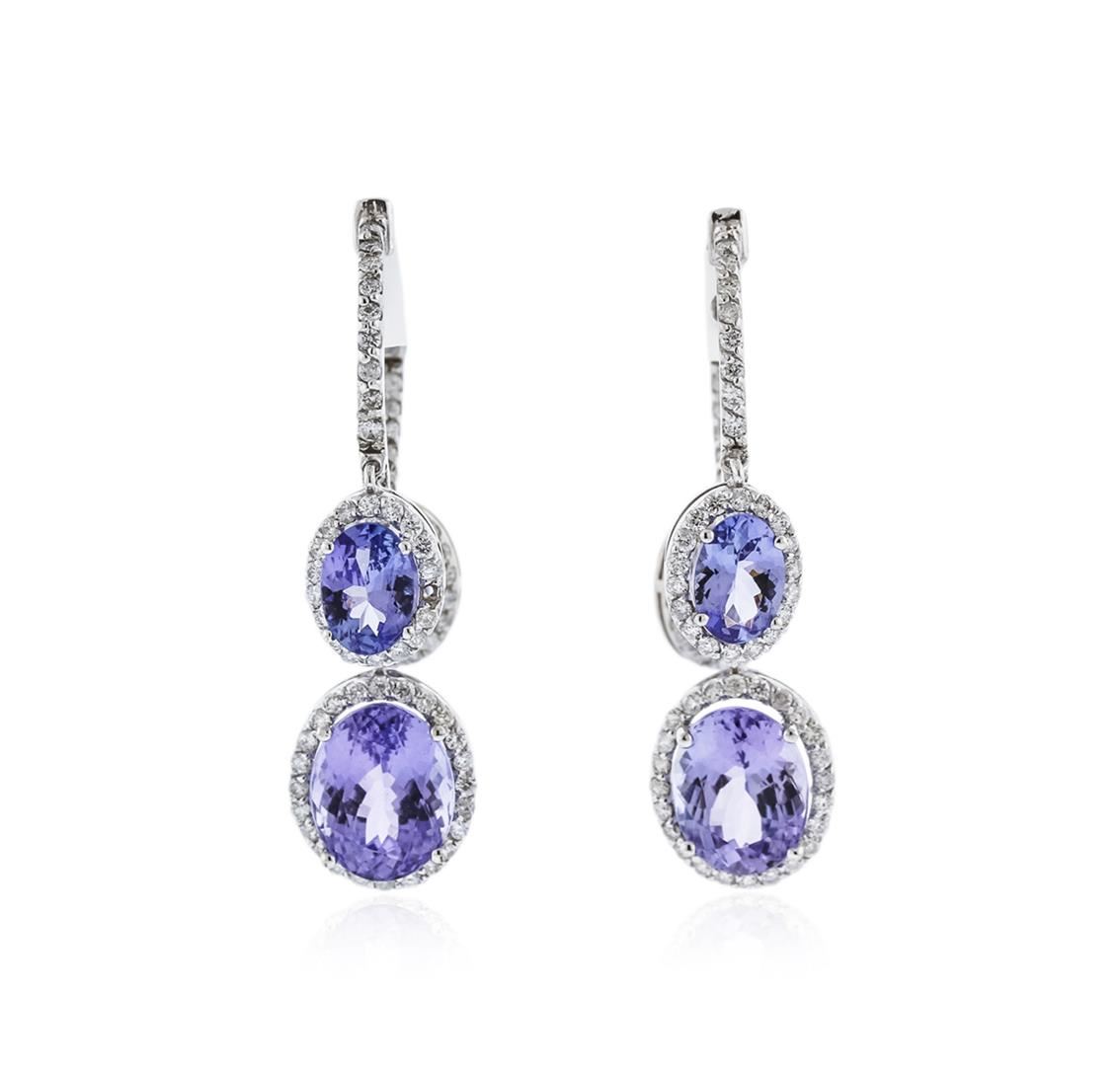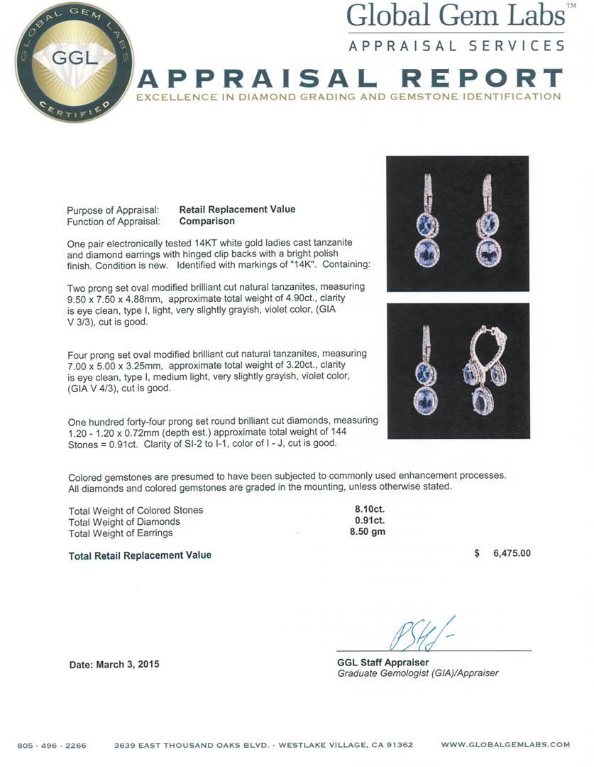 One pair electronically tested 14KT white gold ladies cast tanzanite and diamond earrings with hinged clip backs with a bright polish finish. Identified with markings of "14K". Condition is new. Containing: Two prong set oval modified brilliant cut natural tanzanites, measuring 9.50 x 7.50 x 4.88mm, approximate total weight of 4.90ct., clarity is eye clean, type I, light, very slightly grayish, violet color, (GIA V 3/3), cut is good. Four prong set oval modified brilliant cut natural tanzanites, measuring 7.00 x 5.00 x 3.25mm, approximate total weight of 3.20ct., clarity is eye clean, type I, medium light, very slightly grayish, violet color, (GIA V 4/3), cut is good. One Hundred Forty-Four prong set round brilliant cut diamonds, measuring 1.20 - 1.20 x 0.72mm (depth est.) approximate total weight of 144 Stones = 0.91ct. Clarity: SI-2 to I-1. Color: I - J, Cut is Good. Colored gemstones are presumed to have been subjected to commonly used enhancement processes. All diamonds and colored gemstones are graded in the mounting, unless otherwise stated. Total Weight of Colored Stones 8.10ct. Total Weight of Diamonds 0.91ct. Total Weight of Earrings 8.50 grams. GGL Appraised at $6,475.00.