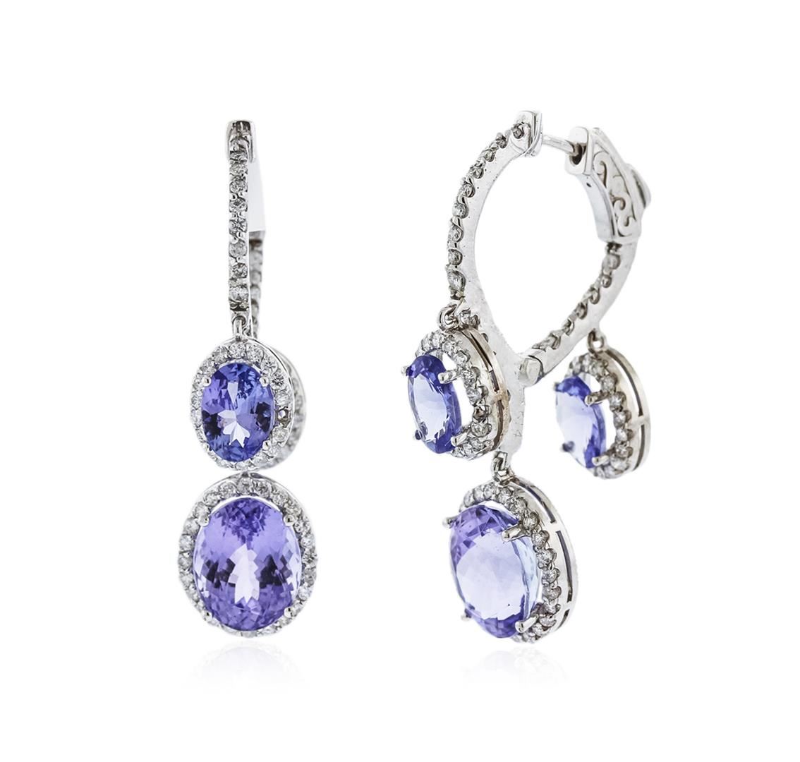 One pair electronically tested 14KT white gold ladies cast tanzanite and diamond earrings with hinged clip backs with a bright polish finish. Identified with markings of "14K". Condition is new. Containing: Two prong set oval modified brilliant cut natural tanzanites, measuring 9.50 x 7.50 x 4.88mm, approximate total weight of 4.90ct., clarity is eye clean, type I, light, very slightly grayish, violet color, (GIA V 3/3), cut is good. Four prong set oval modified brilliant cut natural tanzanites, measuring 7.00 x 5.00 x 3.25mm, approximate total weight of 3.20ct., clarity is eye clean, type I, medium light, very slightly grayish, violet color, (GIA V 4/3), cut is good. One Hundred Forty-Four prong set round brilliant cut diamonds, measuring 1.20 - 1.20 x 0.72mm (depth est.) approximate total weight of 144 Stones = 0.91ct. Clarity: SI-2 to I-1. Color: I - J, Cut is Good. Colored gemstones are presumed to have been subjected to commonly used enhancement processes. All diamonds and colored gemstones are graded in the mounting, unless otherwise stated. Total Weight of Colored Stones 8.10ct. Total Weight of Diamonds 0.91ct. Total Weight of Earrings 8.50 grams. GGL Appraised at $6,475.00.
