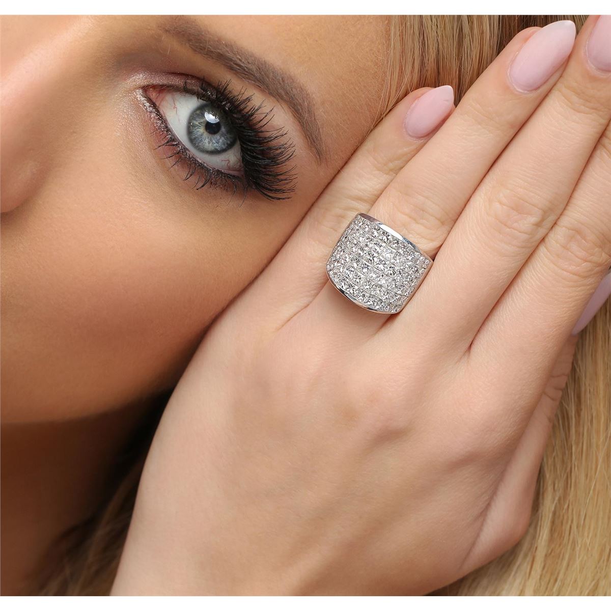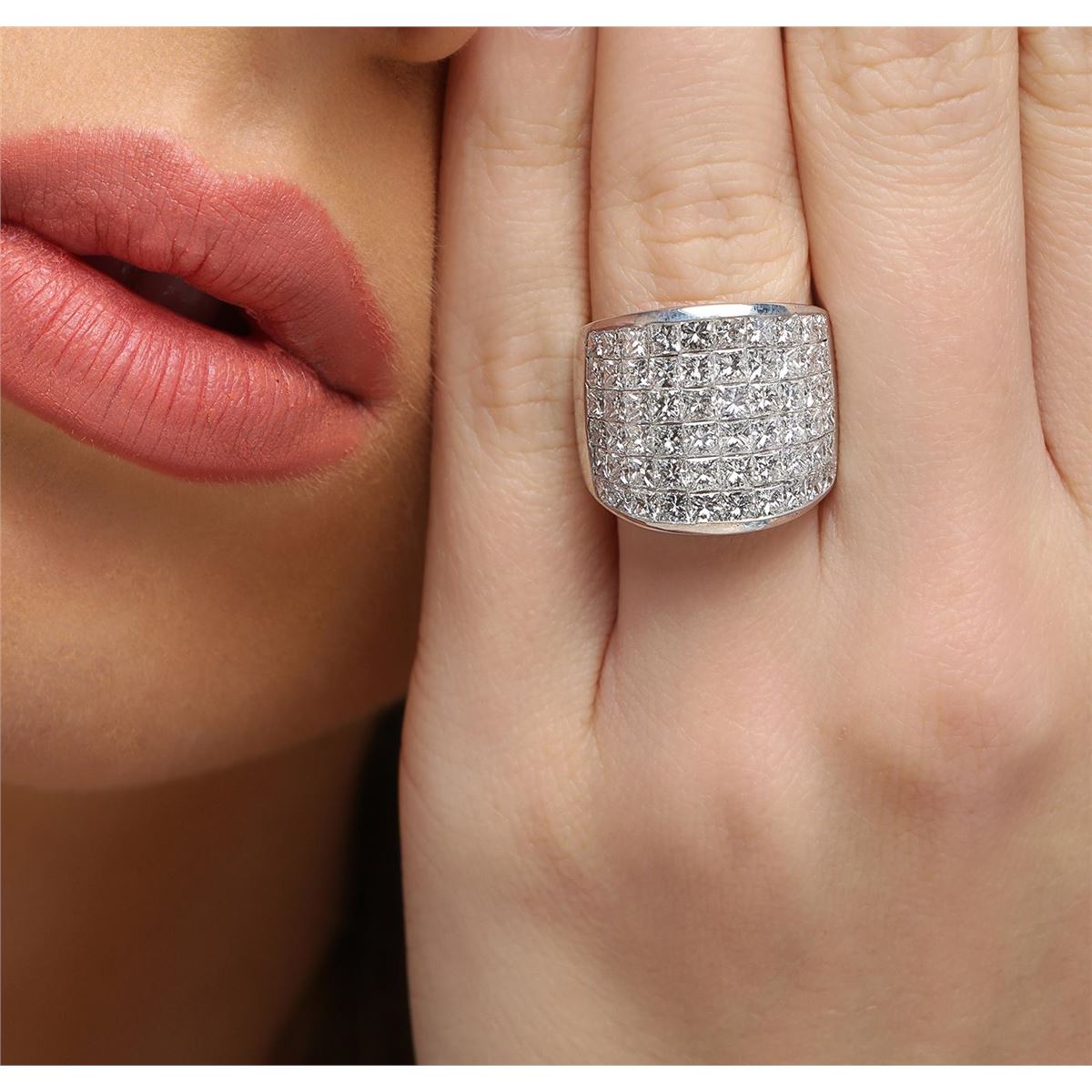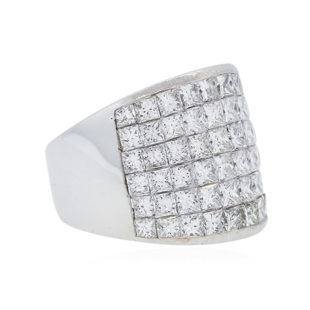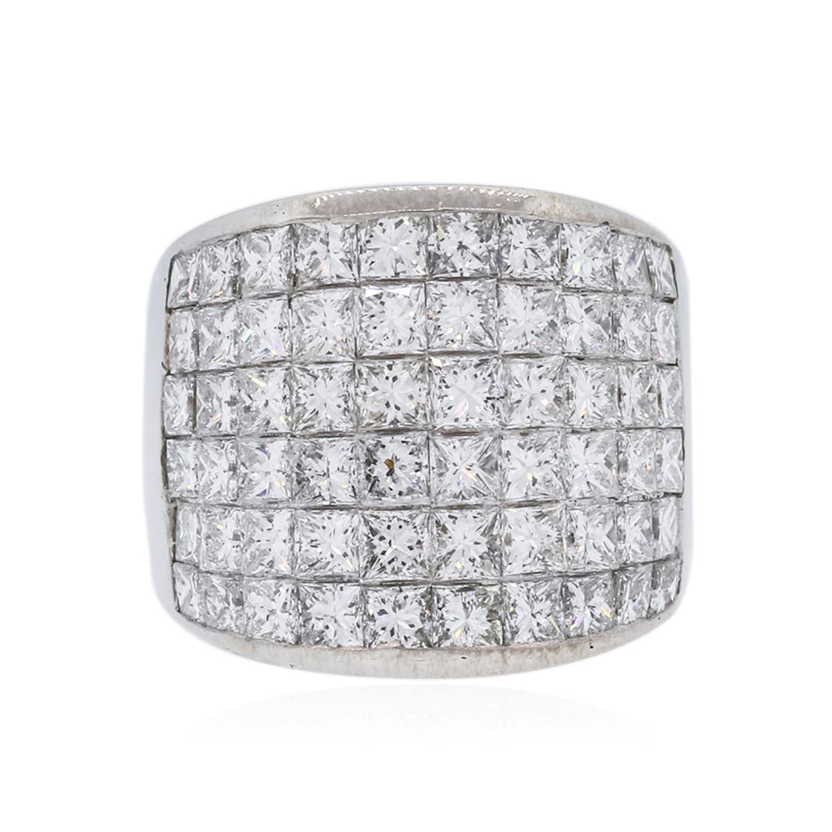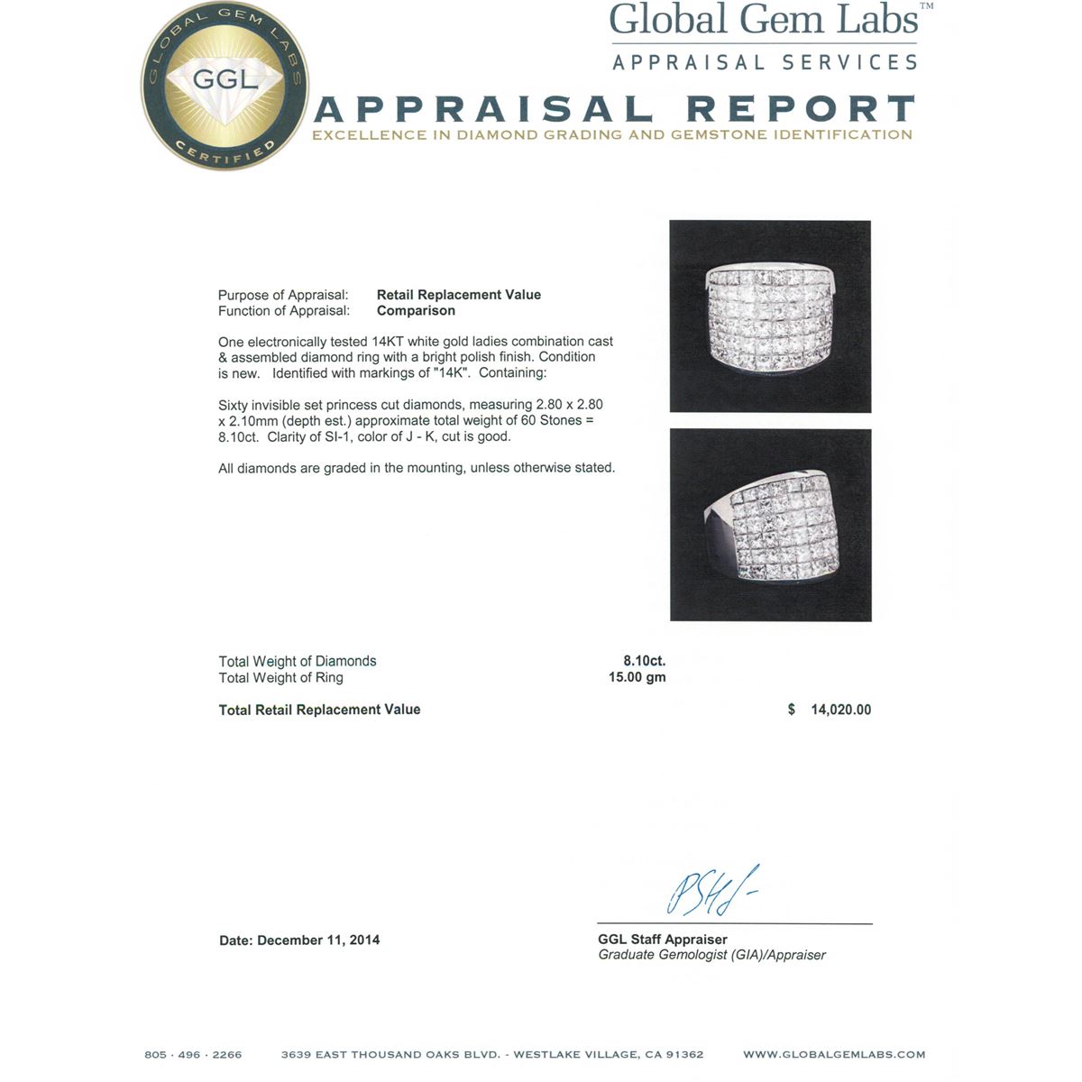 One electronically tested 14KT white gold ladies combination cast & assembled diamond ring with a bright polish finish. Identified with markings of "14K". Condition is new. Containing: Sixty invisible set princess cut diamonds, measuring 2.80 x 2.80 x 2.10mm (depth est.) approximate total weight of 60 Stones = 8.10ct. Clarity: SI-1. Color: J - K, Cut is Good. All diamonds are graded in the mounting, unless otherwise stated. Total Weight of Diamonds 8.10ct. Total Weight of Ring 15.00 grams. GGL Appraised at $14,020.00.