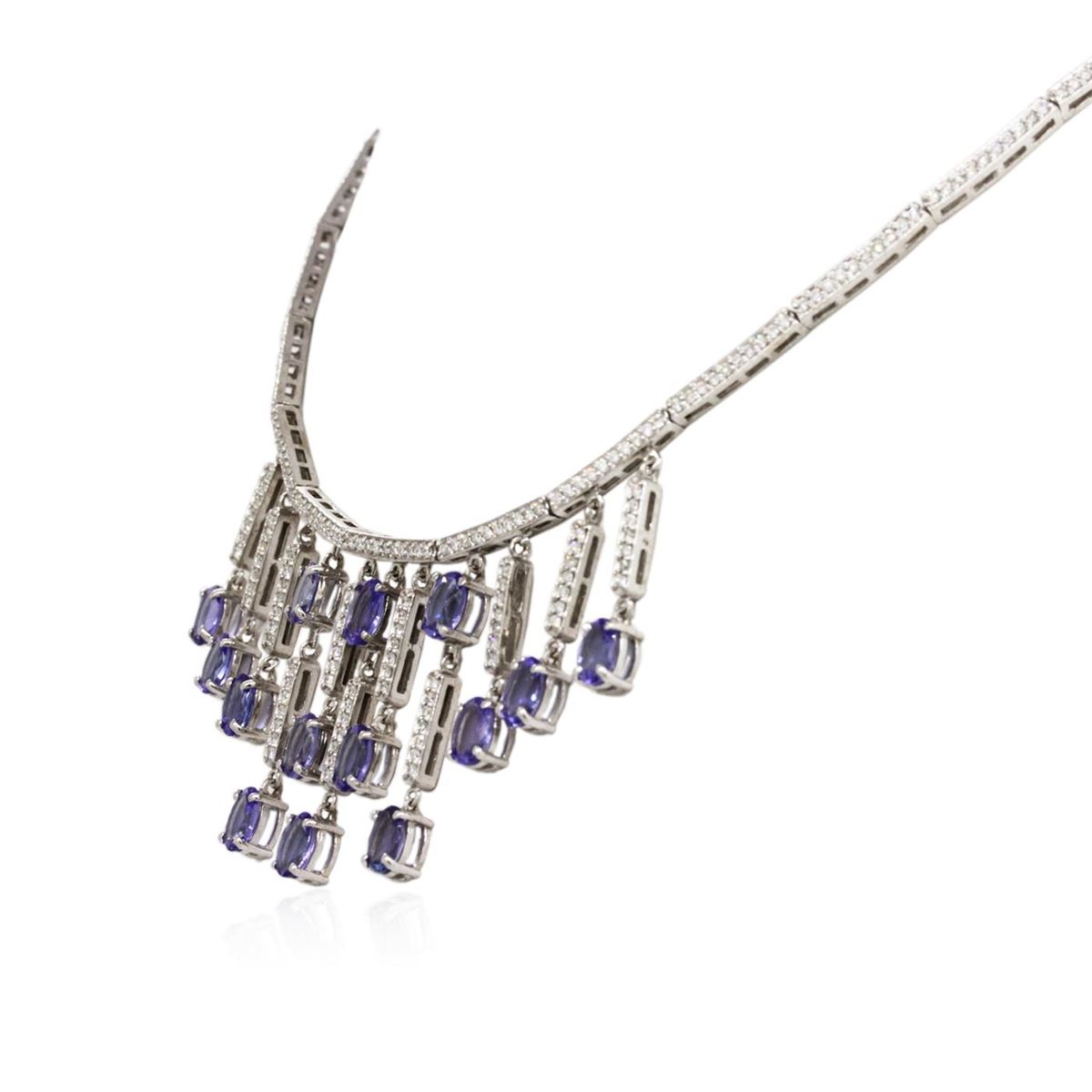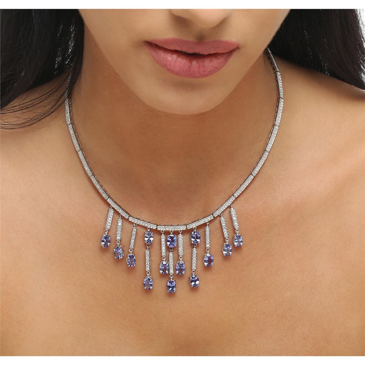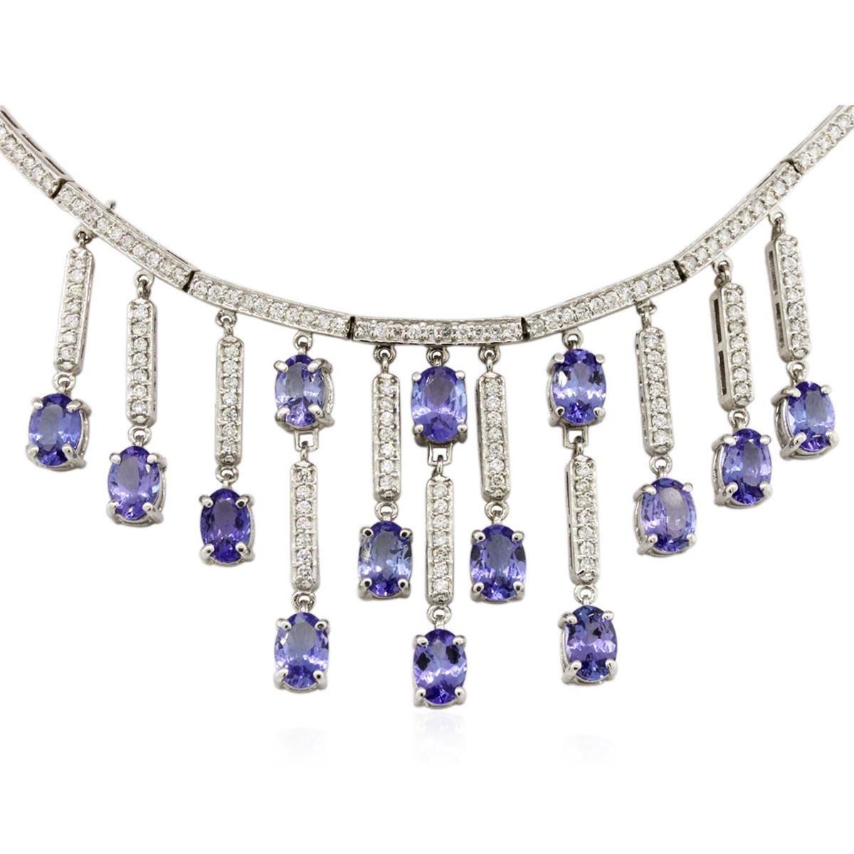 One electronically tested 14KT white gold ladies combination cast & assembled necklace with a hidden box clasp with a bright polish finish. Condition is new. Measurements: 14" in length. Identified with markings of "14K". Containing: Fourteen prong set oval modified brilliant cut natural tanzanites, measuring 6.55 x 4.56 x 2.80mm, approximate. Total Weight of 8.12ct., clarity is eye clean, type I, light, very slightly grayish, violet color, (GIA V 3/3), cut is good. Three Hundred Twenty-Seven prong set round brilliant cut diamonds, measuring 1.30 - 1.30 x 0.78mm (depth est.) approximate. Total Weight of 327 Stones = 2.62ct. Clarity: SI-1 to I-1. Color: H - I, Cut is Good. Colored gemstones are presumed to have been subjected to commonly used enhancement processes. All diamonds and colored gemstones are graded in the mounting, unless otherwise stated. Total Weight of Colored Stones 8.12ct. Total Weight of Diamonds 2.62ct. Total Weight of Necklace 31.40 grams. GGL Appraised at $30,685.00.
