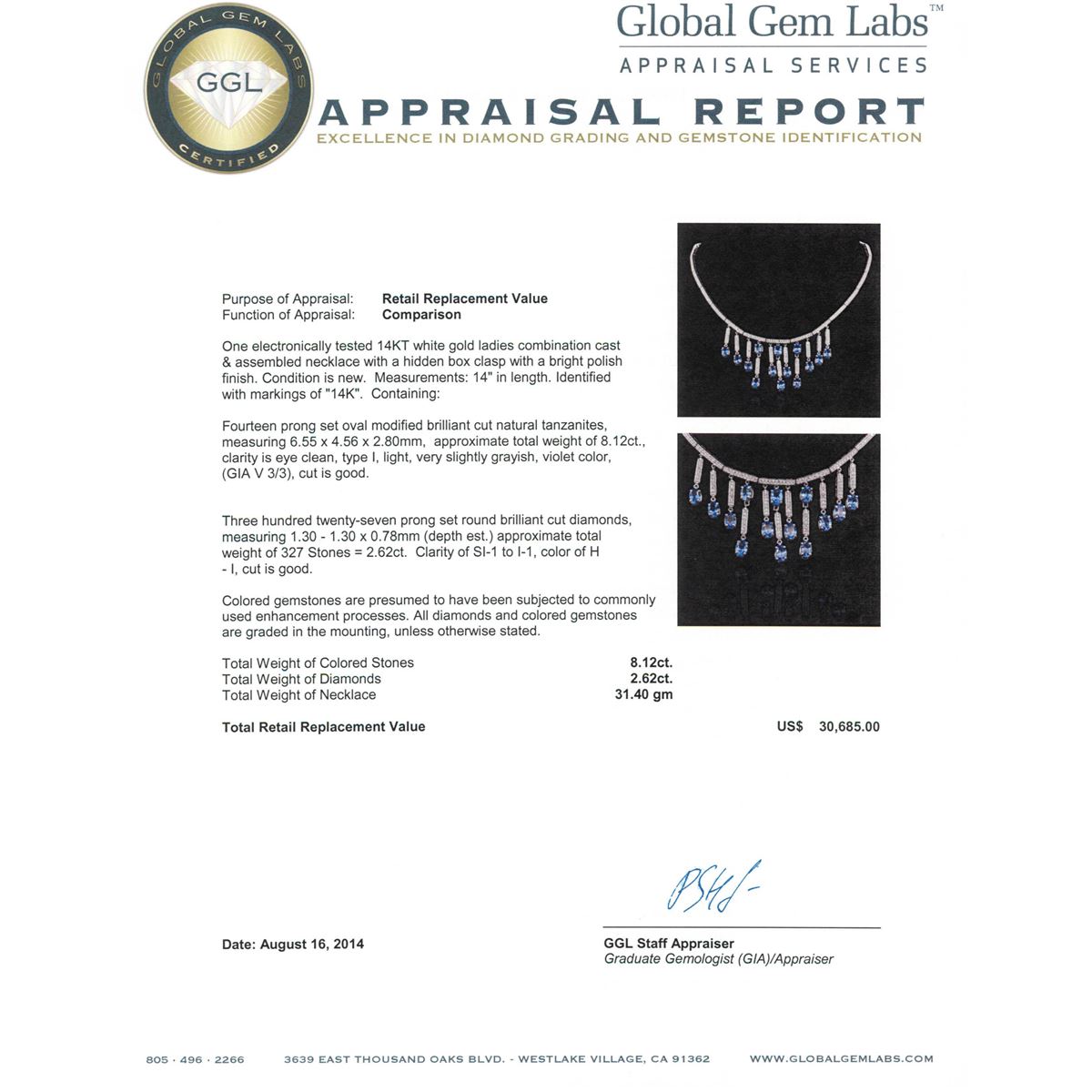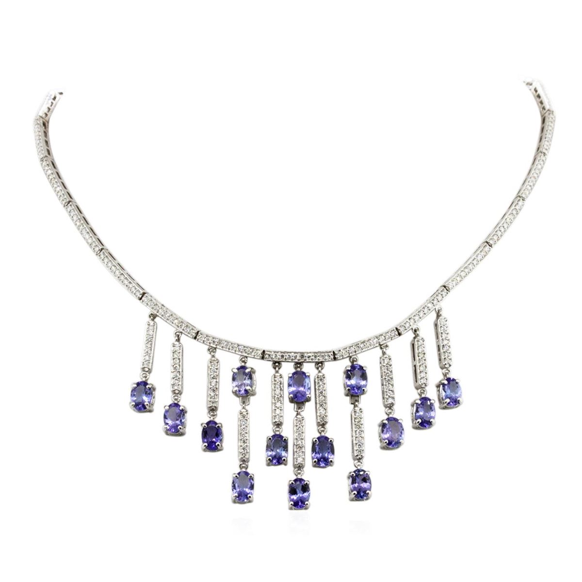 One electronically tested 14KT white gold ladies combination cast & assembled necklace with a hidden box clasp with a bright polish finish. Condition is new. Measurements: 14" in length. Identified with markings of "14K". Containing: Fourteen prong set oval modified brilliant cut natural tanzanites, measuring 6.55 x 4.56 x 2.80mm, approximate. Total Weight of 8.12ct., clarity is eye clean, type I, light, very slightly grayish, violet color, (GIA V 3/3), cut is good. Three Hundred Twenty-Seven prong set round brilliant cut diamonds, measuring 1.30 - 1.30 x 0.78mm (depth est.) approximate. Total Weight of 327 Stones = 2.62ct. Clarity: SI-1 to I-1. Color: H - I, Cut is Good. Colored gemstones are presumed to have been subjected to commonly used enhancement processes. All diamonds and colored gemstones are graded in the mounting, unless otherwise stated. Total Weight of Colored Stones 8.12ct. Total Weight of Diamonds 2.62ct. Total Weight of Necklace 31.40 grams. GGL Appraised at $30,685.00.