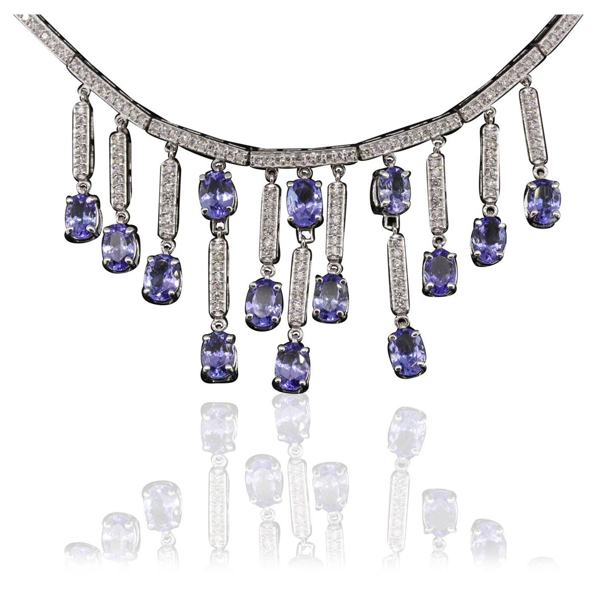 One electronically tested 14KT white gold ladies combination cast & assembled necklace with a hidden box clasp with a bright polish finish. Condition is new. Measurements: 14" in length. Identified with markings of "14K". Containing: Fourteen prong set oval modified brilliant cut natural tanzanites, measuring 6.55 x 4.56 x 2.80mm, approximate. Total Weight of 8.12ct., clarity is eye clean, type I, light, very slightly grayish, violet color, (GIA V 3/3), cut is good. Three Hundred Twenty-Seven prong set round brilliant cut diamonds, measuring 1.30 - 1.30 x 0.78mm (depth est.) approximate. Total Weight of 327 Stones = 2.62ct. Clarity: SI-1 to I-1. Color: H - I, Cut is Good. Colored gemstones are presumed to have been subjected to commonly used enhancement processes. All diamonds and colored gemstones are graded in the mounting, unless otherwise stated. Total Weight of Colored Stones 8.12ct. Total Weight of Diamonds 2.62ct. Total Weight of Necklace 31.40 grams. GGL Appraised at $30,685.00.