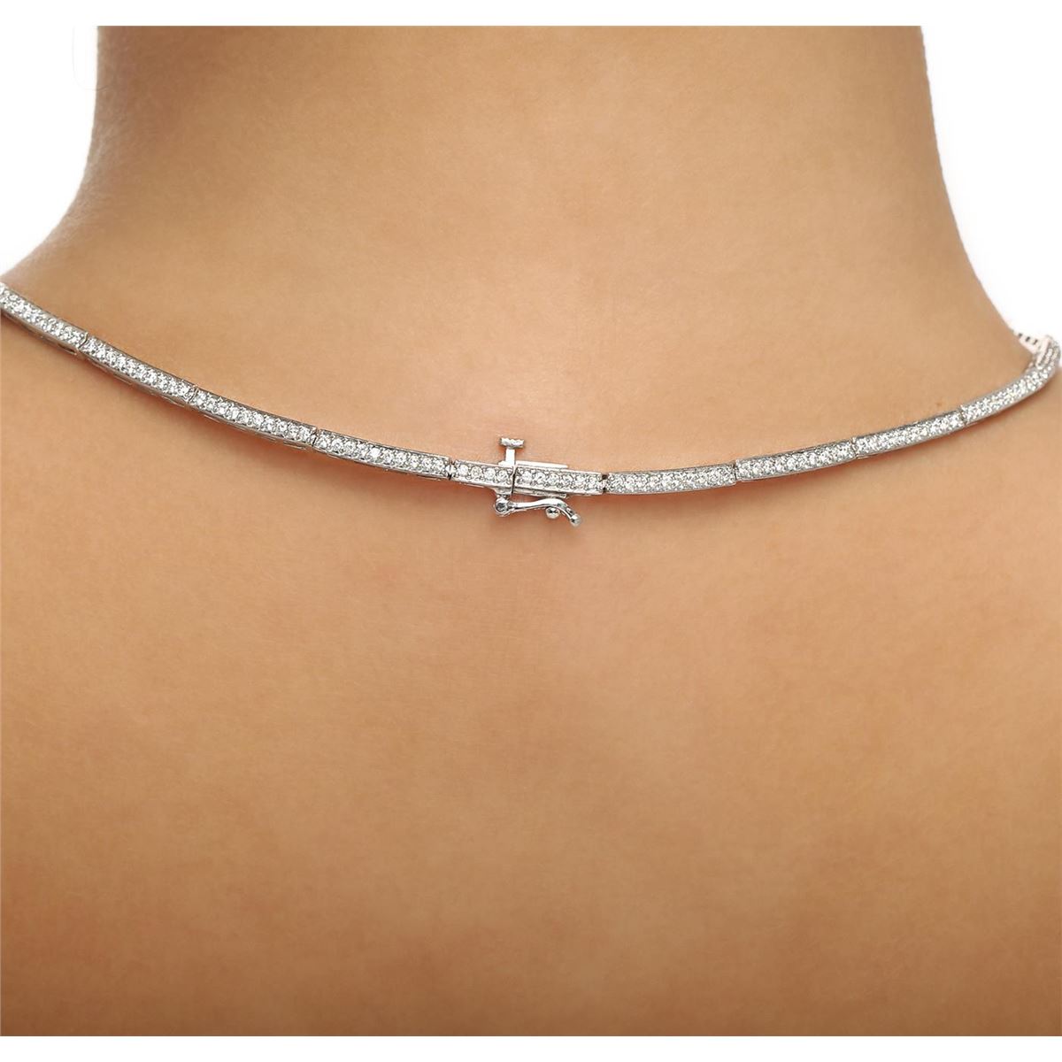 One electronically tested 14KT white gold ladies combination cast & assembled necklace with a hidden box clasp with a bright polish finish. Condition is new. Measurements: 14" in length. Identified with markings of "14K". Containing: Fourteen prong set oval modified brilliant cut natural tanzanites, measuring 6.55 x 4.56 x 2.80mm, approximate. Total Weight of 8.12ct., clarity is eye clean, type I, light, very slightly grayish, violet color, (GIA V 3/3), cut is good. Three Hundred Twenty-Seven prong set round brilliant cut diamonds, measuring 1.30 - 1.30 x 0.78mm (depth est.) approximate. Total Weight of 327 Stones = 2.62ct. Clarity: SI-1 to I-1. Color: H - I, Cut is Good. Colored gemstones are presumed to have been subjected to commonly used enhancement processes. All diamonds and colored gemstones are graded in the mounting, unless otherwise stated. Total Weight of Colored Stones 8.12ct. Total Weight of Diamonds 2.62ct. Total Weight of Necklace 31.40 grams. GGL Appraised at $30,685.00.