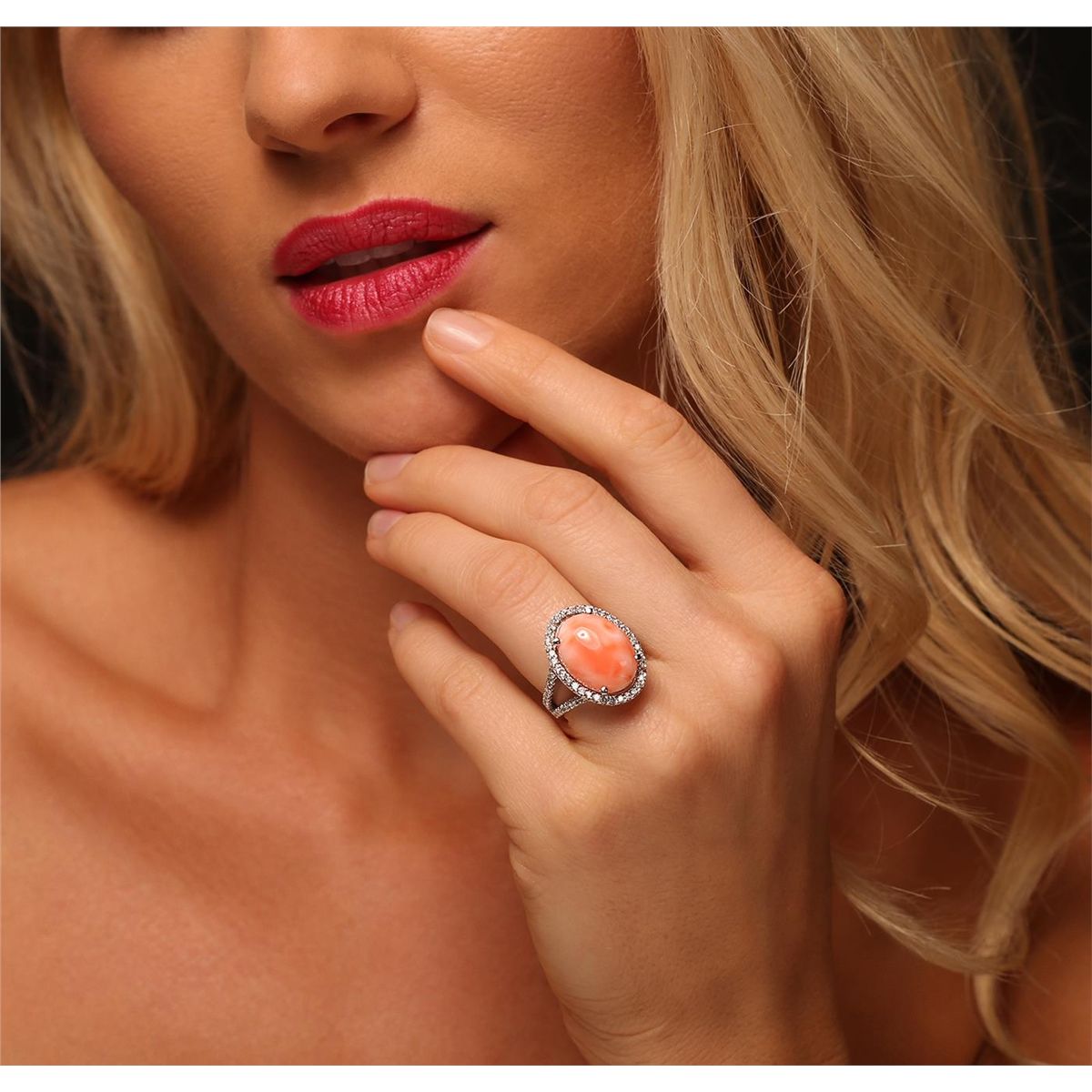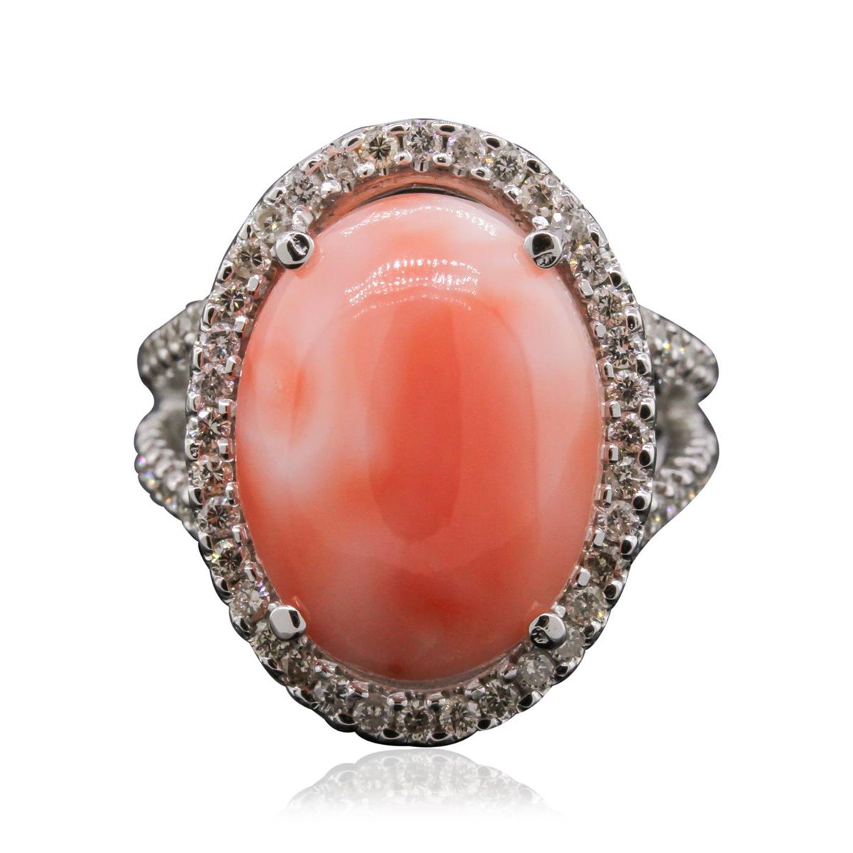 One electronically tested 14KT white gold Ladies combination cast & assembled fancy ring with a bright polish finish. Condition is new. Identified with markings of "14K". Containing: One prong set oval cabochon cut natural pink coral, measuring 16.01 x 12.08 x 7.85mm, approximate weight of 8.14ct., clarity is heavily included, medium light, very slightly grayish, pink color, (GIA Pk 4/3), cut is good. Colored gemstones are presumed to have been subjected to commonly used color/clarity enhancement processes. Fifty-Six prong set round brilliant cut diamonds, measuring 1.70 - 1.70 x 1.02mm (depth est.) approximate. Total Weight of 56 Stones = 0.91ct. Clarity: I-1 to I-2. Color: H - I, Cut is Good. Total Weight of Colored Stones 8.14ct. Total Weight of Diamonds 0.91ct. Total Weight of Ring 9.00 grams. GGL Appraised at $9,350.00.