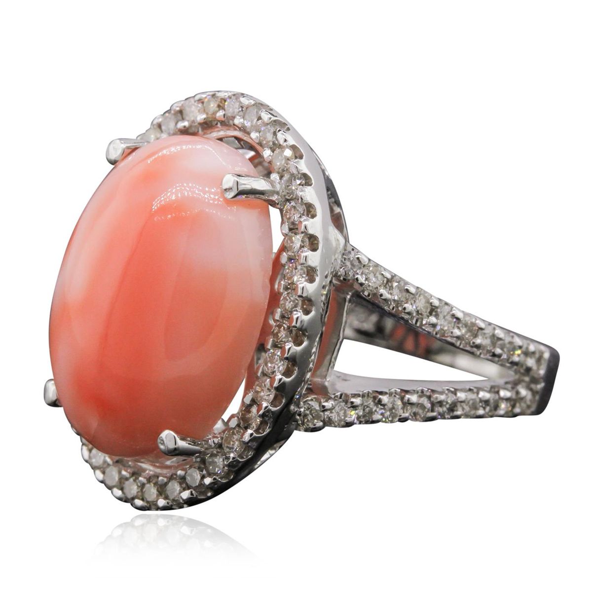 One electronically tested 14KT white gold Ladies combination cast & assembled fancy ring with a bright polish finish. Condition is new. Identified with markings of "14K". Containing: One prong set oval cabochon cut natural pink coral, measuring 16.01 x 12.08 x 7.85mm, approximate weight of 8.14ct., clarity is heavily included, medium light, very slightly grayish, pink color, (GIA Pk 4/3), cut is good. Colored gemstones are presumed to have been subjected to commonly used color/clarity enhancement processes. Fifty-Six prong set round brilliant cut diamonds, measuring 1.70 - 1.70 x 1.02mm (depth est.) approximate. Total Weight of 56 Stones = 0.91ct. Clarity: I-1 to I-2. Color: H - I, Cut is Good. Total Weight of Colored Stones 8.14ct. Total Weight of Diamonds 0.91ct. Total Weight of Ring 9.00 grams. GGL Appraised at $9,350.00.