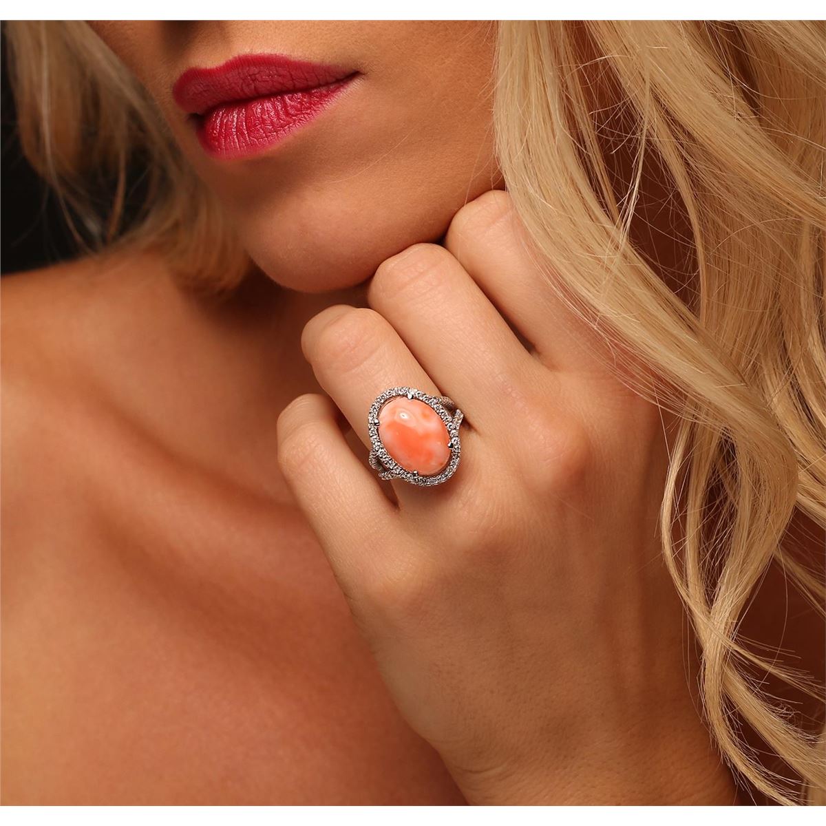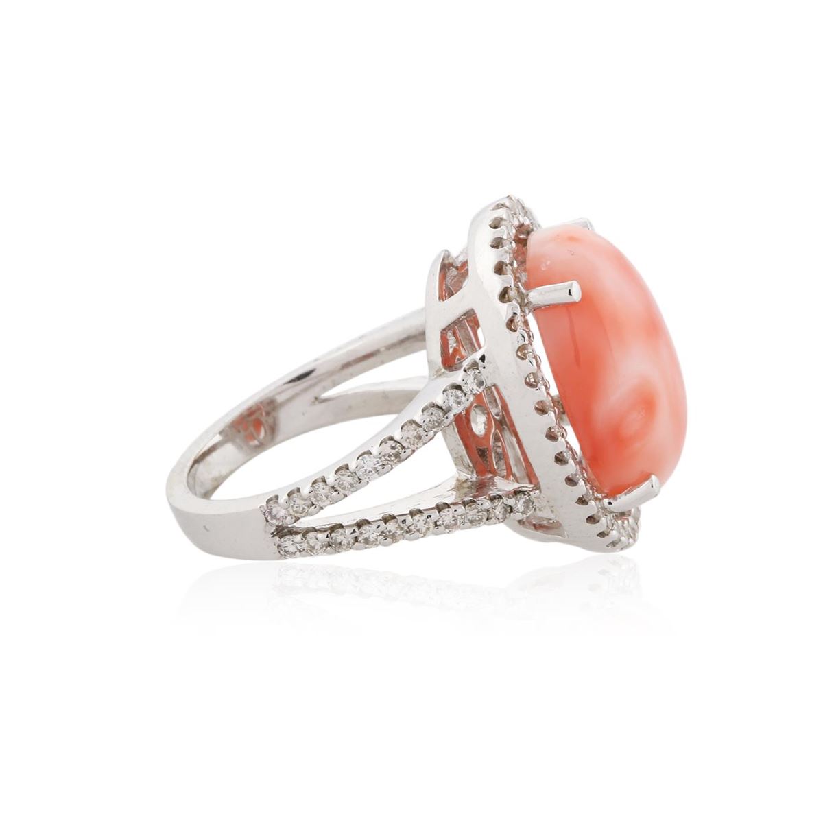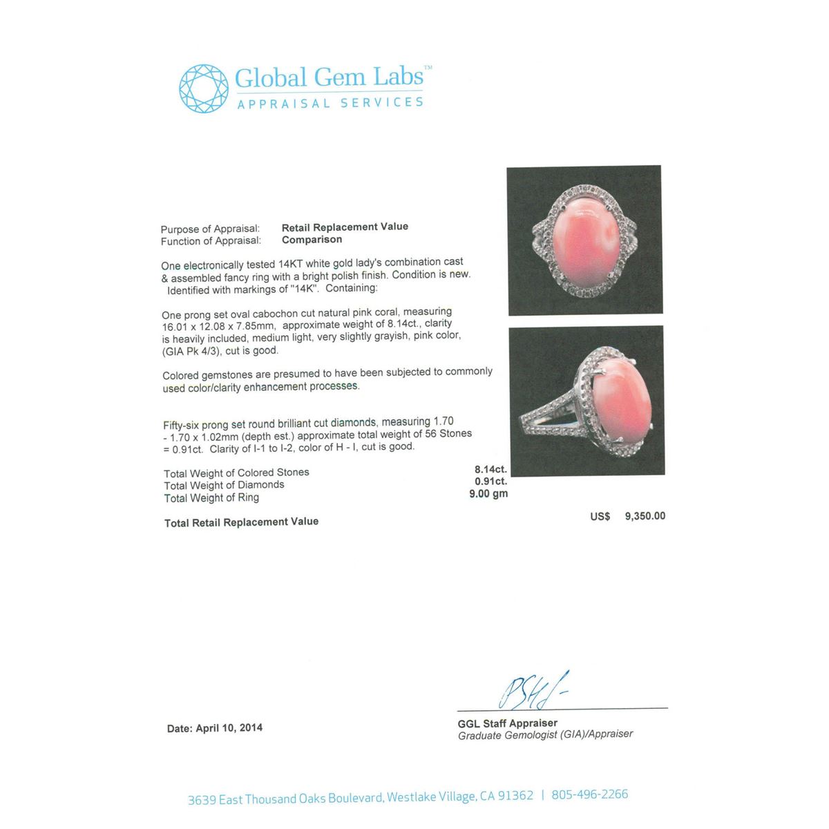One electronically tested 14KT white gold Ladies combination cast & assembled fancy ring with a bright polish finish. Condition is new. Identified with markings of "14K". Containing: One prong set oval cabochon cut natural pink coral, measuring 16.01 x 12.08 x 7.85mm, approximate weight of 8.14ct., clarity is heavily included, medium light, very slightly grayish, pink color, (GIA Pk 4/3), cut is good. Colored gemstones are presumed to have been subjected to commonly used color/clarity enhancement processes. Fifty-Six prong set round brilliant cut diamonds, measuring 1.70 - 1.70 x 1.02mm (depth est.) approximate. Total Weight of 56 Stones = 0.91ct. Clarity: I-1 to I-2. Color: H - I, Cut is Good. Total Weight of Colored Stones 8.14ct. Total Weight of Diamonds 0.91ct. Total Weight of Ring 9.00 grams. GGL Appraised at $9,350.00.