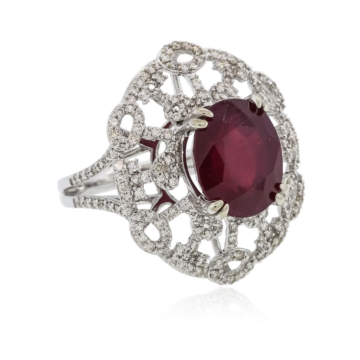 One electronically tested 14KT white gold ladies cast ruby and diamond ring with a bright polish finish. Condition is new, good workmanship. The featured ruby is set within an elaborate diamond lattice supported by diamond set split shoulders, completed by a two millimeter wide band. Trademark is PMI. Identified with markings of "14K". Containing: One prong set oval mixed cut natural ruby, measuring 12.20 x 10.10 x 7.45mm, 10%. bulge factor, approximate weight of 8.15ct., clarity is heavily included, type II, dark, very slightly brownish, slightly purplish red color, (GIA slpR 7/3), cut is good. Transmitting light somewhat diffusely, transparent to translucent. Naturally occurring internal & external characteristics are present. Indications of laboratory high temperature heat treatment, with glass & flux additives. Graded in the setting. Ruby has a low tolerance to rhodium plating, repolishing the surface, & ultrasonic cleaning. One Hundred Seventy-Three prong set round brilliant cut diamonds, measuring 1.20 - 1.10 x 0.69mm (depth est.) approximate. Total Weight of 173 Stones = 1.05ct. Graded in the setting. Clarity: SI-1 to I-1. Color: G - I. Total Weight of Colored Stones 8.15ct. Total Weight of Diamonds 1.05ct. Total Weight of Ring 7.46 grams. AIG Appraised at $6,795.00.