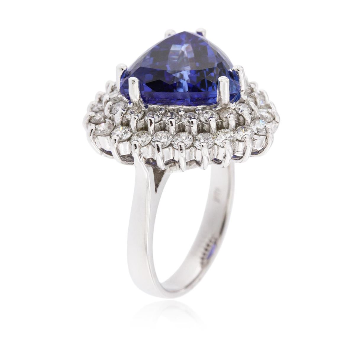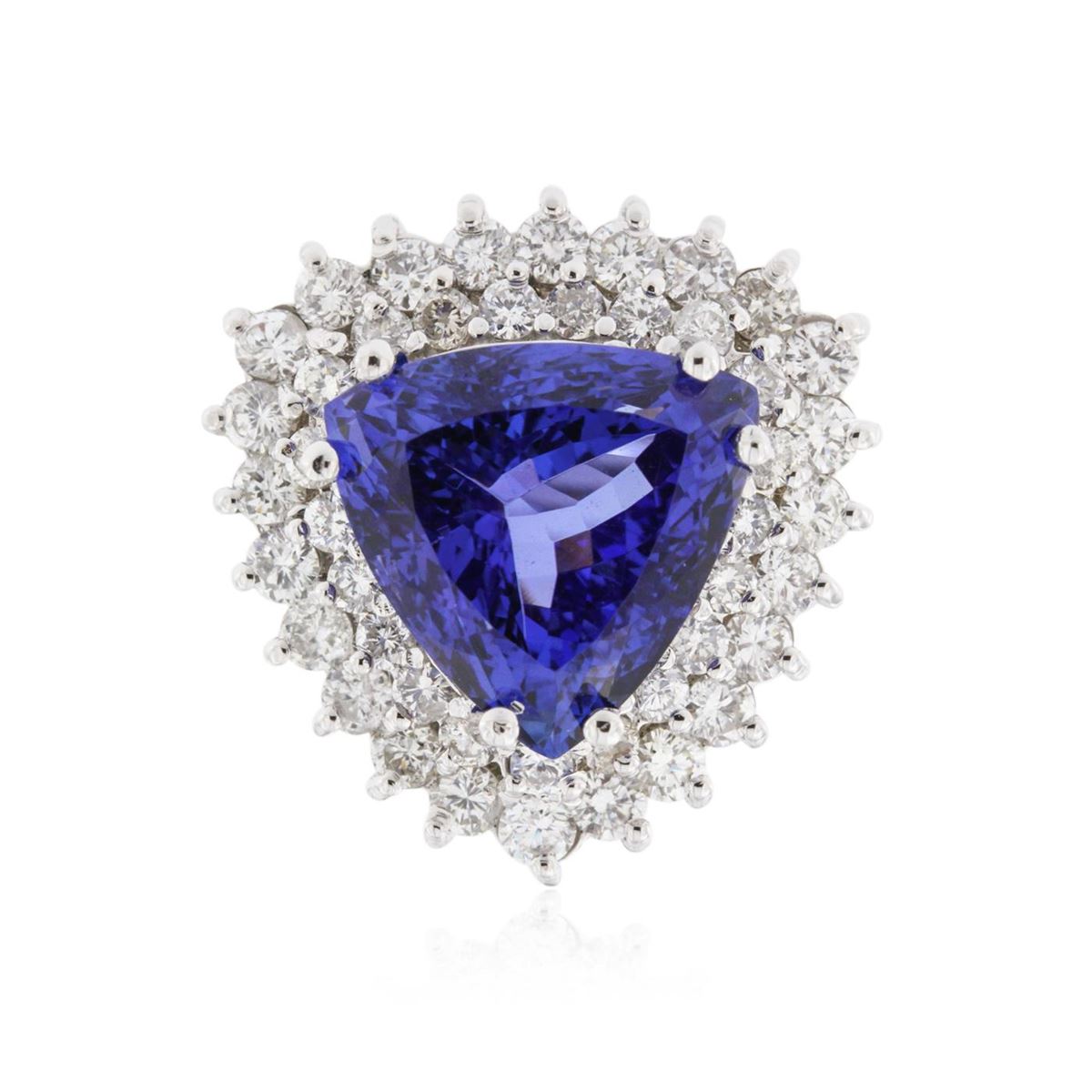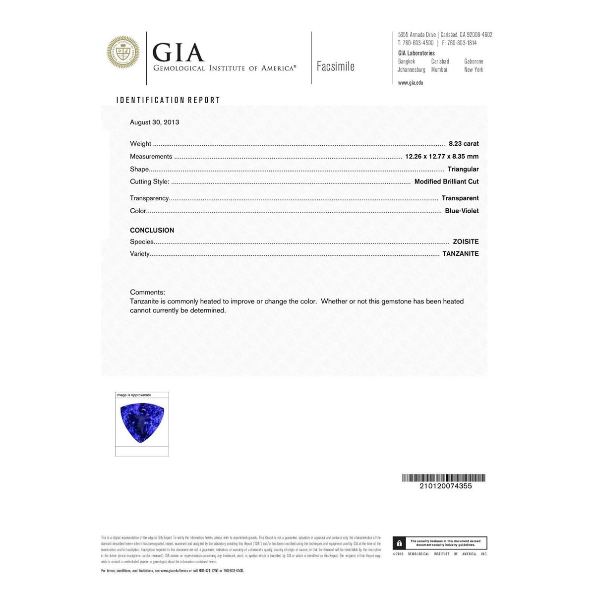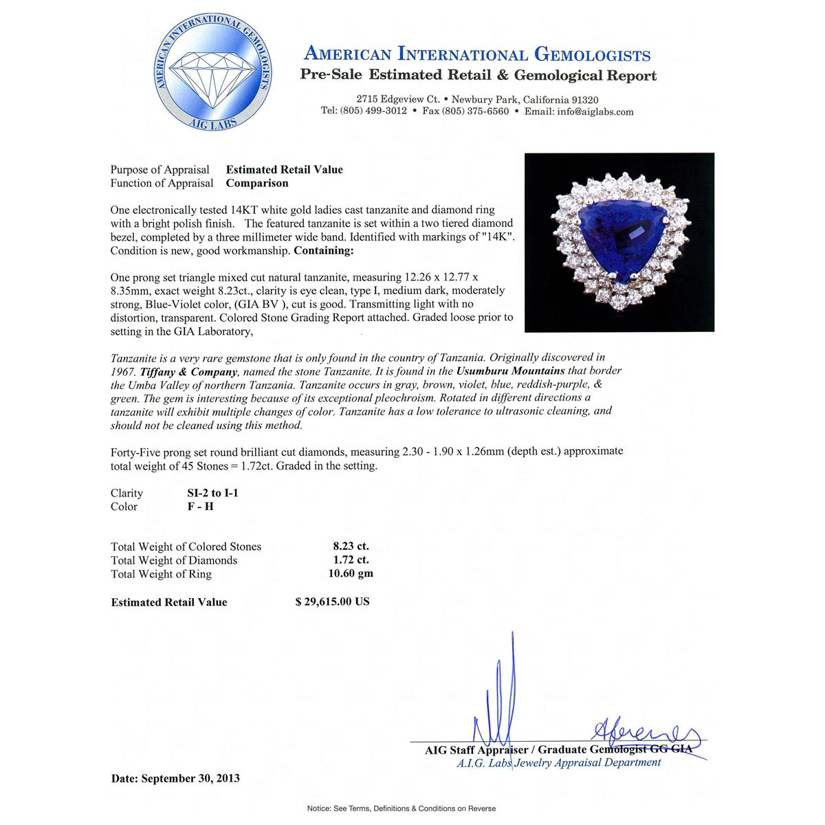 One electronically tested 14KT white gold ladies cast tanzanite and diamond ring with a bright polish finish. The featured tanzanite is set within a two tiered diamond bezel, completed by a three millimeter wide band. Identified with markings of "14K". Condition is new, good workmanship. Containing: One prong set triangle mixed cut natural tanzanite, measuring 12.26 x 12.77 x 8.35mm, exact weight 8.23ct., clarity is eye clean, type I, medium dark, moderately strong, Blue-Violet color, (GIA BV ), cut is good. Transmitting light with no distortion, transparent. Colored Stone Grading Report attached. Graded loose prior to setting in the GIA Laboratory, Report # 1156636223. Tanzanite is a very rare gemstone that is only found in the country of Tanzania. Originally discovered in 1967. Tiffany & Company, named the stone Tanzanite. It is found in the Usumburu Mountains that border the Umba Valley of northern Tanzania. Tanzanite occurs in gray, brown, violet, blue, reddish-purple, & green. The gem is interesting because of its exceptional pleochroism. Rotated in different directions a tanzanite will exhibit multiple changes of color. Tanzanite has a low tolerance to ultrasonic cleaning, and should not be cleaned using this method. Forty-Five prong set round brilliant cut diamonds, measuring 2.30 - 1.90 x 1.26mm (depth est.) approximate total weight of 45 Stones = 1.72ct. Graded in the setting. Clarity SI-2 to I-1. Color F - H. Total Weight of Colored Stones 8.23 ct. Total Weight of Diamonds 1.72ct. Total Weight of Ring 10.60gm. AIG Appraised at $29,615.00.