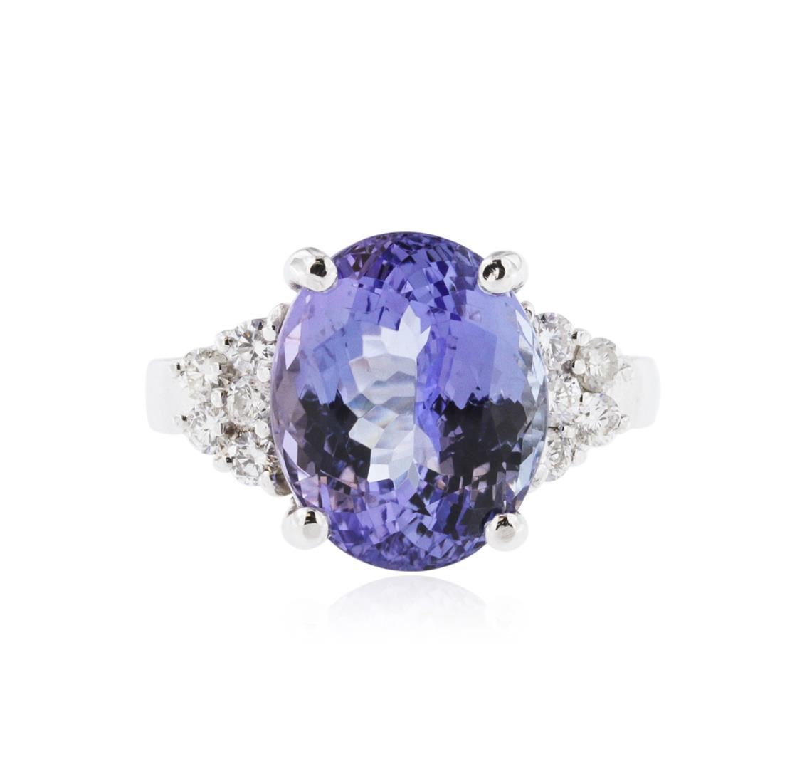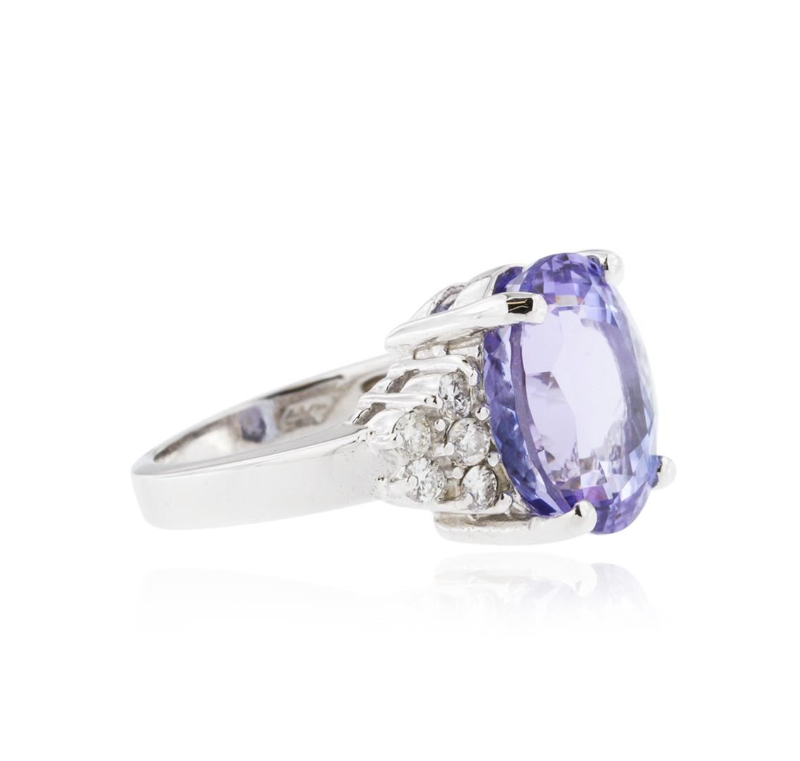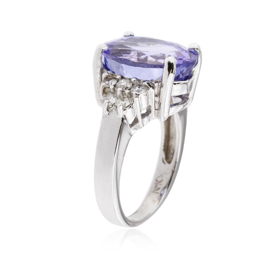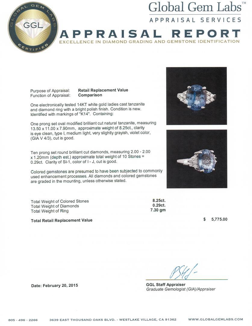 One electronically tested 14KT white gold ladies cast tanzanite and diamond ring with a bright polish finish. Identified with markings of "K14". Condition is new. Containing: One prong set oval modified brilliant cut natural tanzanite, measuring 13.50 x 11.00. x 7.90mm, approximate weight of 8.25ct., clarity is eye clean, type I, medium light, very slightly grayish, violet color, (GIA V 4/3), cut is good. Ten prong set round brilliant cut diamonds, measuring 2.00. - 2.00. x 1.20mm (depth est.) approximate total weight of 10 Stones = 0.29ct. Clarity: SI-1. Color: I - J, Cut is Good. Colored gemstones are presumed to have been subjected to commonly used enhancement processes. All diamonds and colored gemstones are graded in the mounting, unless otherwise stated. Total Weight of Colored Stones 8.25ct. Total Weight of Diamonds 0.29ct. Total Weight of Ring 7.30 grams. GGL Appraised at $5,775.00.