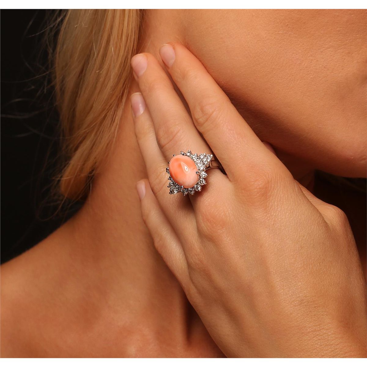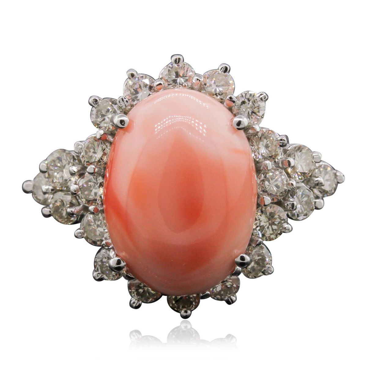 One electronically tested 14KT white gold Ladies combination cast & assembled fancy ring with a bright polish finish. Condition is new. Identified with markings of "14K". Containing: One prong set oval cabochon cut natural pink coral, measuring 16.17 x 11.99 x 6.00mm, approximate weight of 8.26ct., clarity is heavily included, medium light, slightly grayish, pink color, (GIA Pk 4/2), cut is good. Colored gemstones are presumed to have been subjected to commonly used color/clarity enhancement processes. Twenty-Two prong set round brilliant cut diamonds, measuring 2.50 - 2.50 x 1.50mm (depth est.) approximate. Total Weight of 22 Stones = 1.81ct. Clarity: SI-1 to I-1. Color: K - L, Cut is Good. Total Weight of Colored Stones 8.26ct. Total Weight of Diamonds 1.81ct. Total Weight of Ring 11.10 grams. GGL Appraised at $11,620.00.