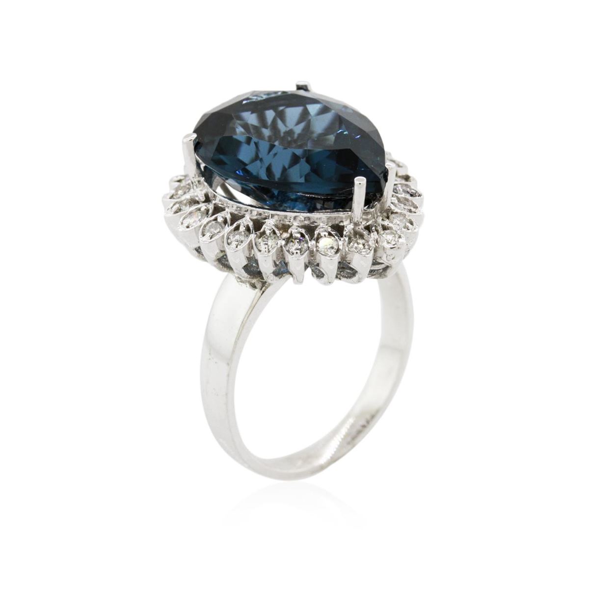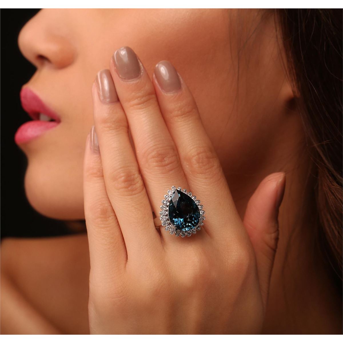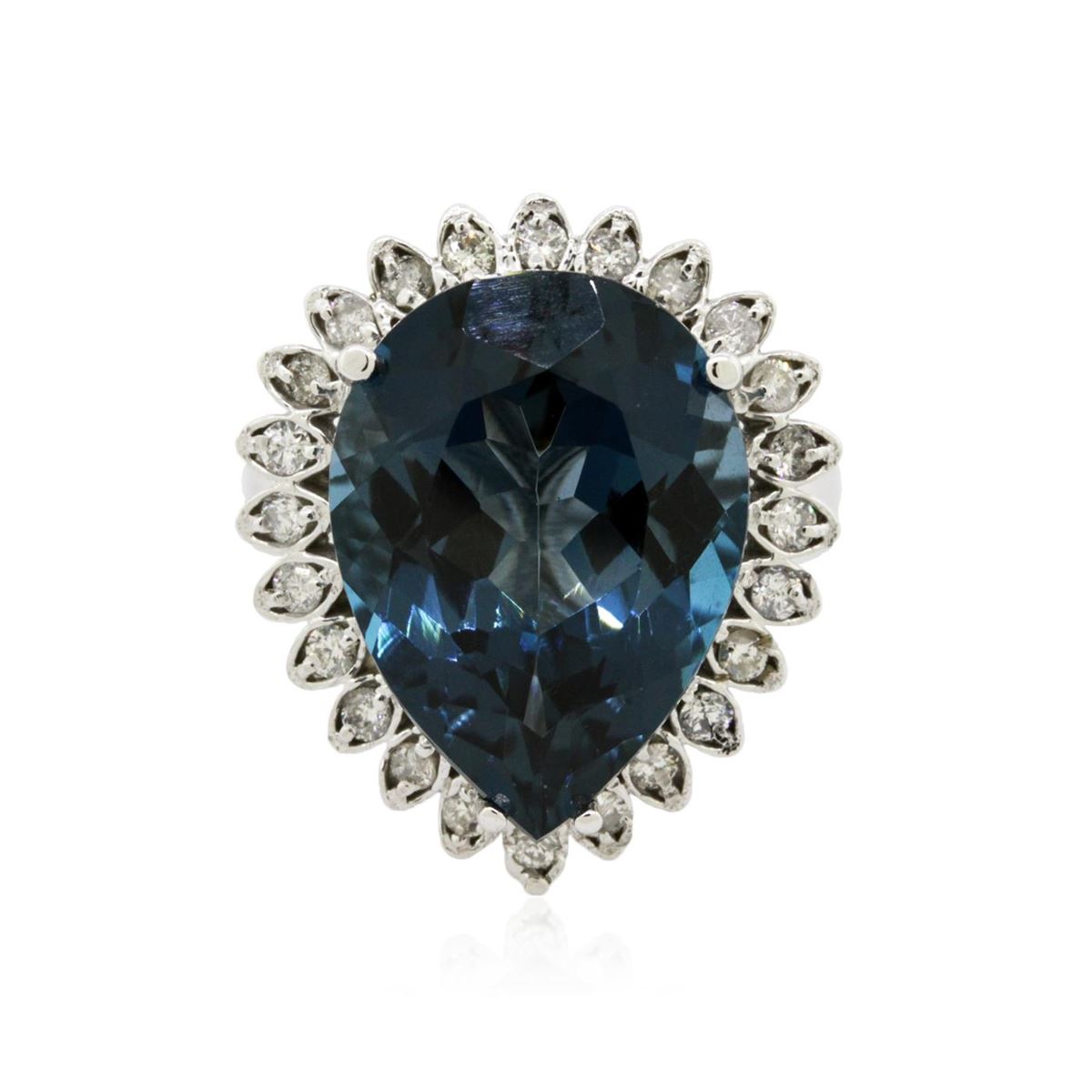 One electronically tested 14KT white gold Ladies combination cast & assembled ring with a bright polish finish. Condition is new. Identified with markings of "K14". Containing: One prong set pear modified brilliant cut natural blue topaz, measuring 14.69 x 10.00 x 8.00mm, approximate weight of 8.30ct., clarity is eye clean, type I, medium dark, moderately strong, very slightly greenish blue color, (GIA vslgB 6/4), cut is very good. Colored gemstones are presumed to have been subjected to commonly used color/clarity enhancement processes. Twenty-Four prong set round brilliant cut diamonds, measuring 1.50 - 1.50 x 0.90mm (depth est.) approximate. Total Weight of 24 Stones = 0.30ct. Clarity: I-1 to I-2. Color: I - J, Cut is Good. Total Weight of Colored Stones 8.30ct. Total Weight of Diamonds 0.30ct. Total Weight of Ring 9.00 grams. GGL Appraised at $4,235.00.