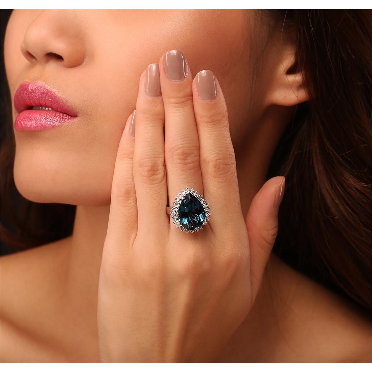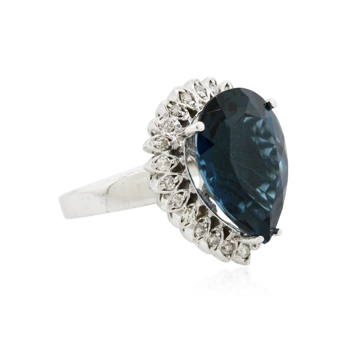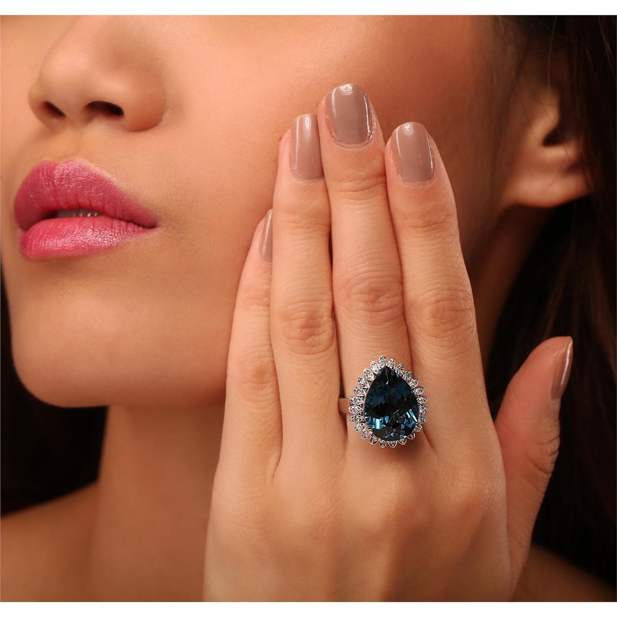One electronically tested 14KT white gold Ladies combination cast & assembled ring with a bright polish finish. Condition is new. Identified with markings of "K14". Containing: One prong set pear modified brilliant cut natural blue topaz, measuring 14.69 x 10.00 x 8.00mm, approximate weight of 8.30ct., clarity is eye clean, type I, medium dark, moderately strong, very slightly greenish blue color, (GIA vslgB 6/4), cut is very good. Colored gemstones are presumed to have been subjected to commonly used color/clarity enhancement processes. Twenty-Four prong set round brilliant cut diamonds, measuring 1.50 - 1.50 x 0.90mm (depth est.) approximate. Total Weight of 24 Stones = 0.30ct. Clarity: I-1 to I-2. Color: I - J, Cut is Good. Total Weight of Colored Stones 8.30ct. Total Weight of Diamonds 0.30ct. Total Weight of Ring 9.00 grams. GGL Appraised at $4,235.00.