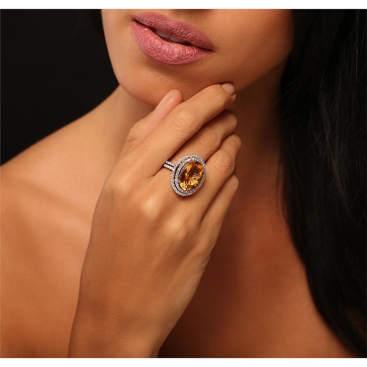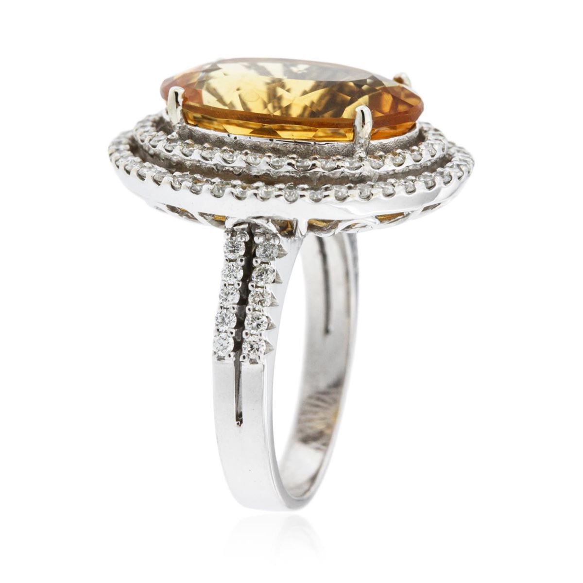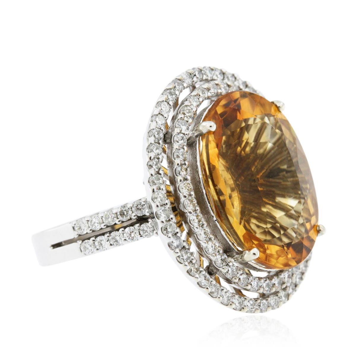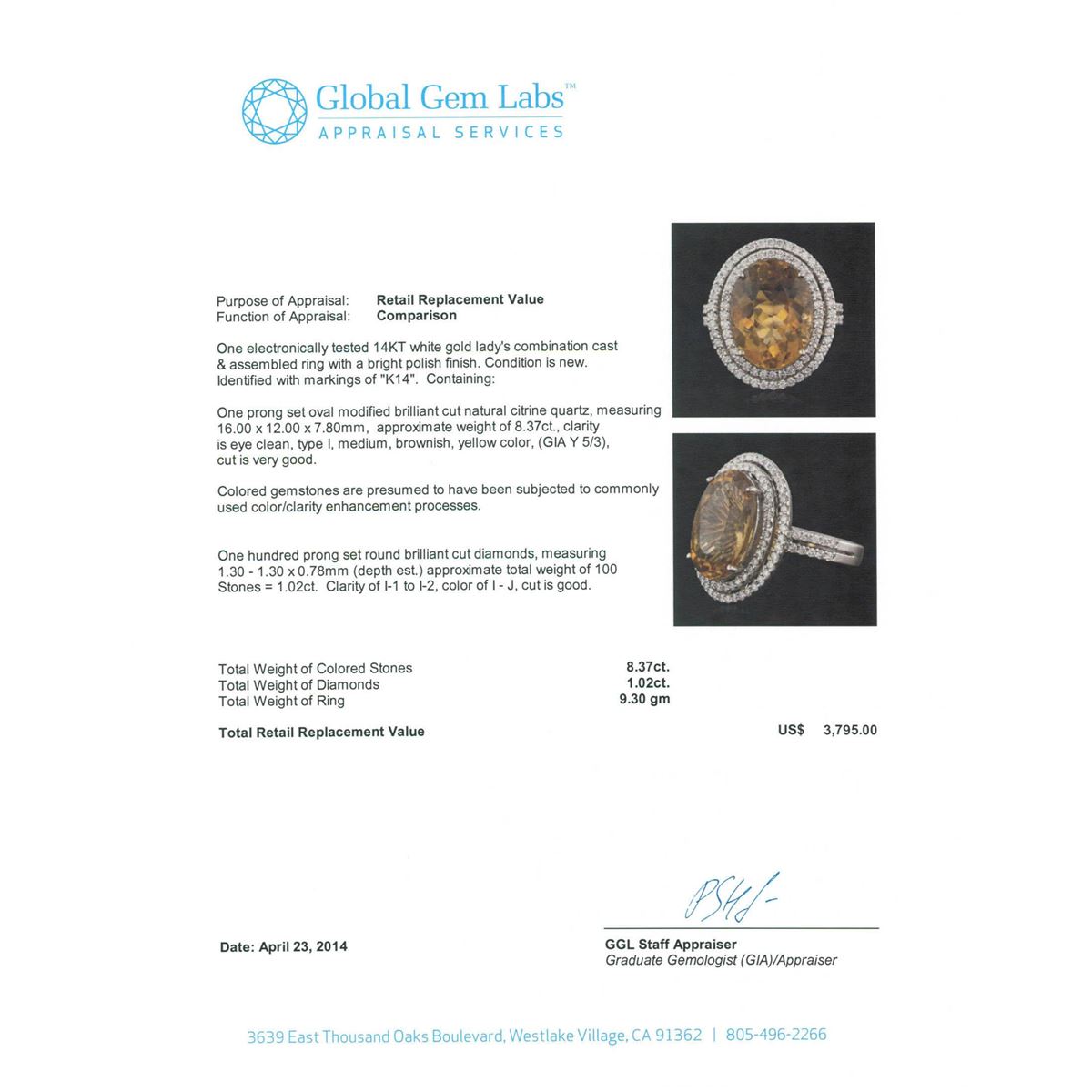 One electronically tested 14KT white gold Ladies combination cast & assembled ring with a bright polish finish. Condition is new. Identified with markings of "K14". Containing: One prong set oval modified brilliant cut natural citrine quartz, measuring 16.00 x 12.00 x 7.80mm, approximate weight of 8.37ct., clarity is eye clean, type I, medium, brownish, yellow color, (GIA Y 5/3), cut is very good. Colored gemstones are presumed to have been subjected to commonly used color/clarity enhancement processes. One Hundred prong set round brilliant cut diamonds, measuring 1.30 - 1.30 x 0.78mm (depth est.) approximate. Total Weight of 100 Stones = 1.02ct. Clarity: I-1 to I-2. Color: I - J, Cut is Good. Total Weight of Colored Stones 8.37ct. Total Weight of Diamonds 1.02ct. Total Weight of Ring 9.30 grams. GGL Appraised at $3,795.00.
