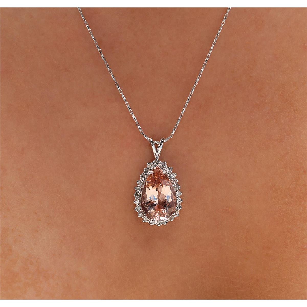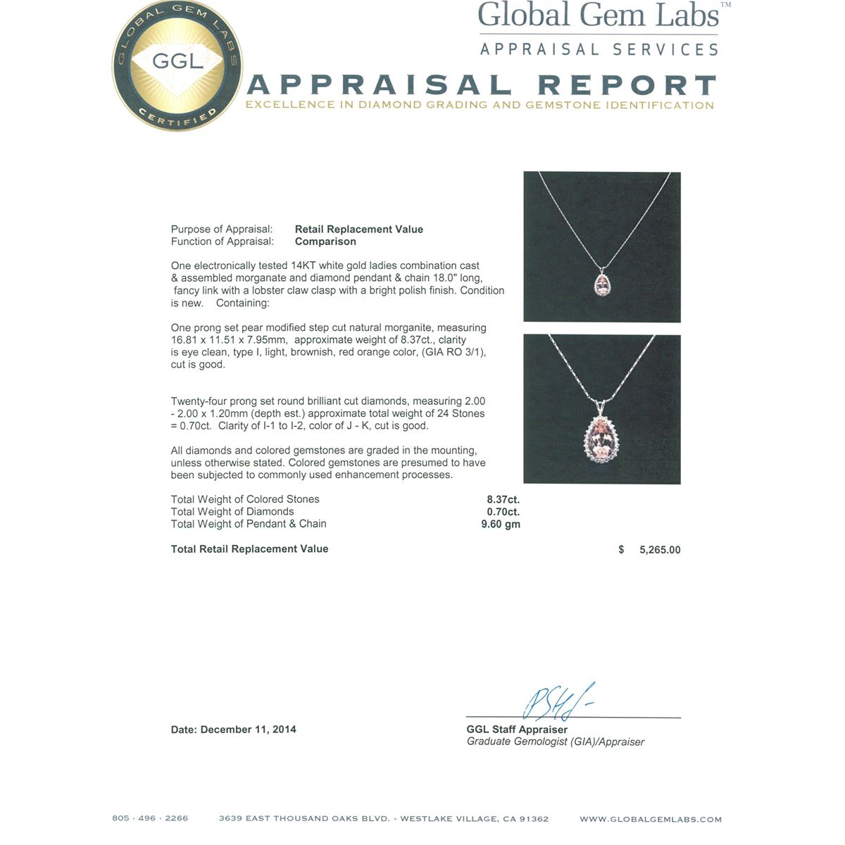 One electronically tested 14KT white gold ladies combination cast & assembled morganite and diamond pendant & chain 18.0" long, fancy link with a lobster claw clasp with a bright polish finish. Condition is new. Containing: One prong set pear modified step cut natural morganatic, measuring 16.81 x 11.51 x 7.95mm, approximate weight of 8.37ct., clarity is eye clean, type I, light, brownish, red orange color, (GIA RO 3/1), cut is good. Twenty-Four prong set round brilliant cut diamonds, measuring 2.00 - 2.00 x 1.20mm (depth est.) approximate total weight of 24 Stones = 0.70ct. Clarity: I-1 to I-2. Color: J - K, Cut is Good. All diamonds and colored gemstones are graded in the mounting, unless otherwise stated. Colored gemstones are presumed to have been subjected to commonly used enhancement processes. Total Weight of Colored Stones 8.37ct. Total Weight of Diamonds 0.70ct. Total Weight of Pendant & Chain 9.60 grams. GGL Appraised at $5,265.00.