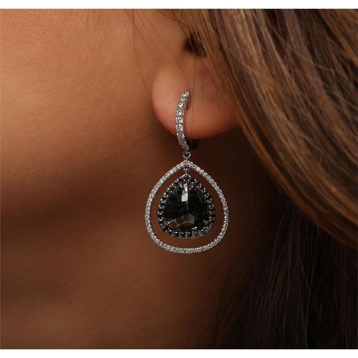 One pair of 14KT white gold earrings containing two natural pear rose cut fancy black diamonds, enhanced for color, with a total weight of 7.22ct. The earrings also contain black side stones: fancy black (color enhanced), and white side stone: F-G / SI3-I1 weighing 0.52ct and 0.71ct respectively. Total weight of the earrings is 6.70 grams. EGL Appraised at $6,900.00.