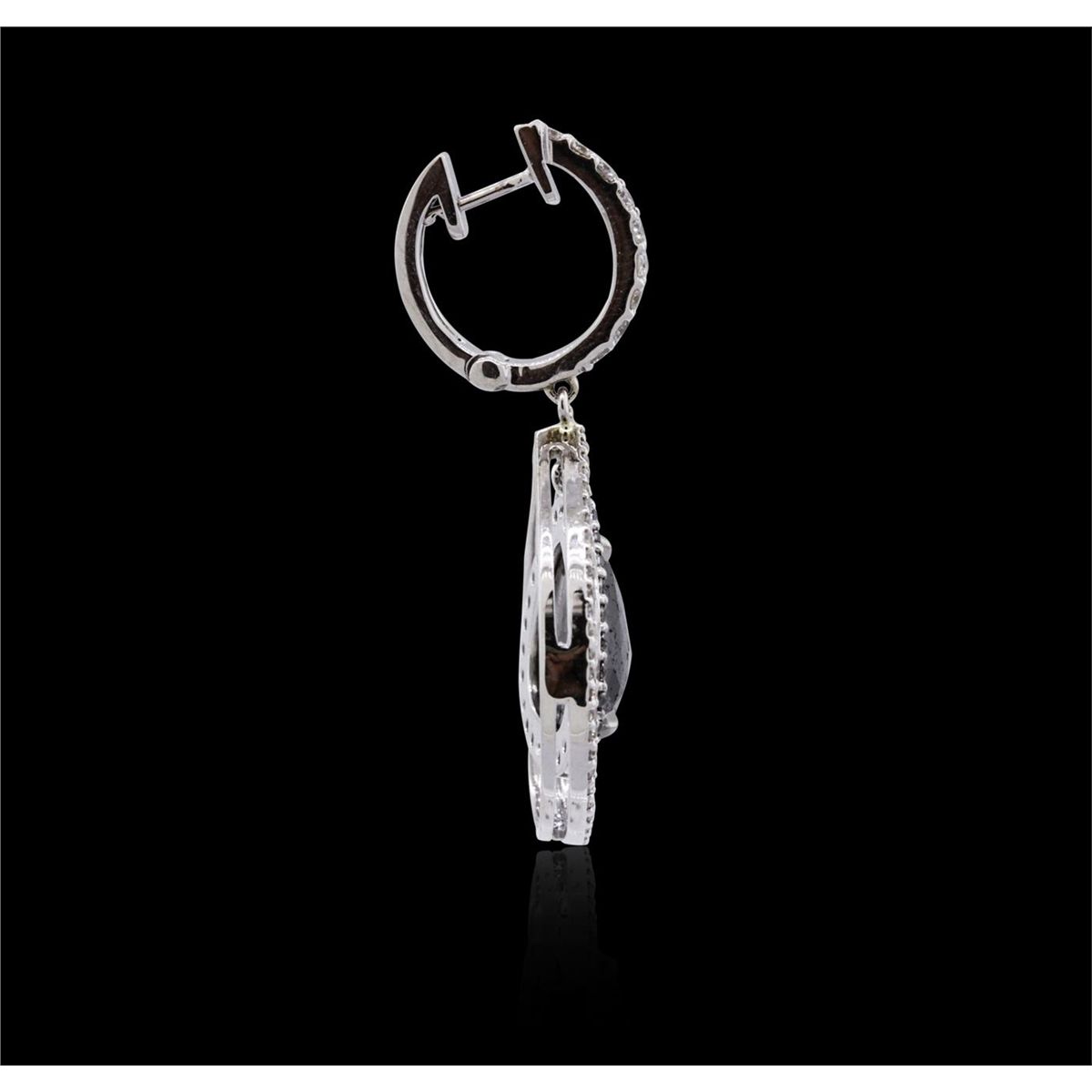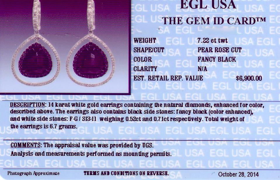 One pair of 14KT white gold earrings containing two natural pear rose cut fancy black diamonds, enhanced for color, with a total weight of 7.22ct. The earrings also contain black side stones: fancy black (color enhanced), and white side stone: F-G / SI3-I1 weighing 0.52ct and 0.71ct respectively. Total weight of the earrings is 6.70 grams. EGL USA Appraised.