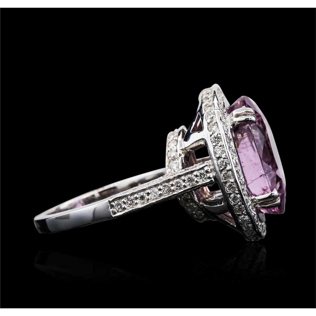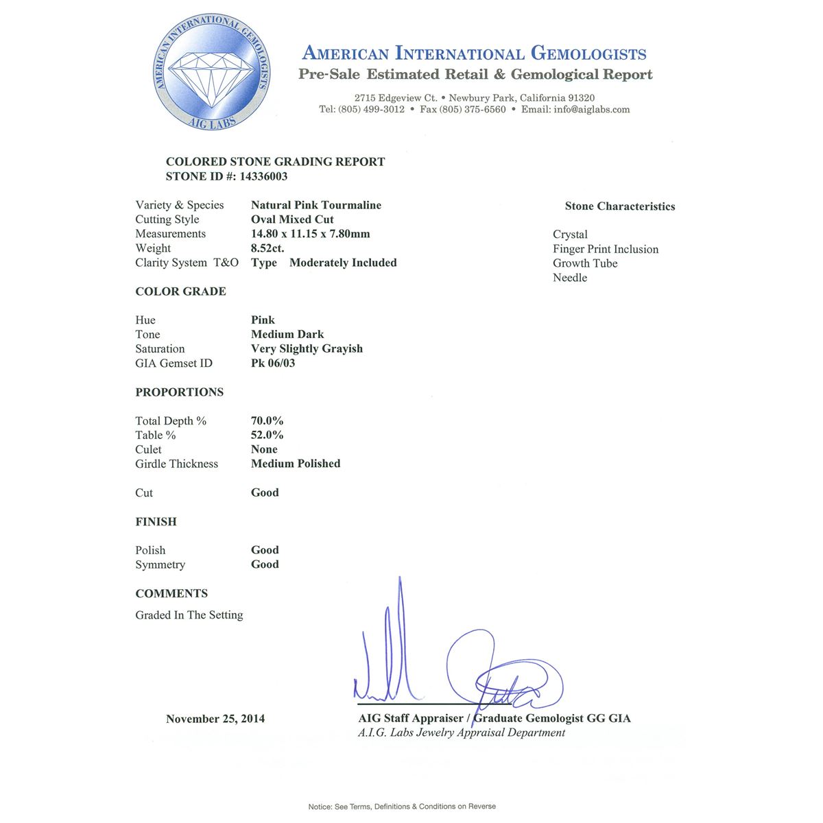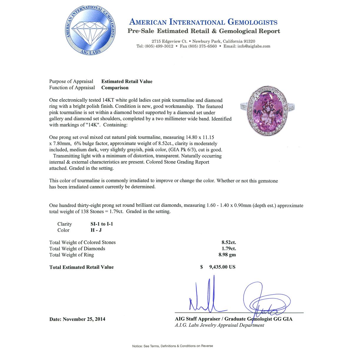 One electronically tested 14KT white gold ladies cast pink tourmaline and diamond ring with a bright polish finish. The featured pink tourmaline is set within a diamond bezel supported by a diamond set under gallery and diamond set shoulders, completed by a two millimeter wide band. Identified with markings of "14K". Condition is new, good workmanship. Containing: One prong set oval mixed cut natural pink tourmaline, measuring 14.80 x 11.15 x 7.80mm, 6%. bulge factor, approximate weight of 8.52ct., clarity is moderately included, medium dark, very slightly grayish, pink color, (GIA Pk 6/3), cut is good. Transmitting light with a minimum of distortion, transparent. Naturally occurring internal & external characteristics are present. Colored Stone Grading Report attached. Graded in the setting. This color of tourmaline is commonly irradiated to improve or change the color. Whether or not this gemstone has been irradiated cannot currently be determined. One Hundred Thirty-Eight prong set round brilliant cut diamonds, measuring 1.60 - 1.40 x 0.90mm (depth est.) approximate total weight of 138 Stones = 1.79ct. Graded in the setting. Clarity: SI-1 to I-1. Color: H - J. Total Weight of Colored Stones 8.52ct. Total Weight of Diamonds 1.79ct. Total Weight of Ring 8.98 grams. AIG Appraised at $9,435.00.