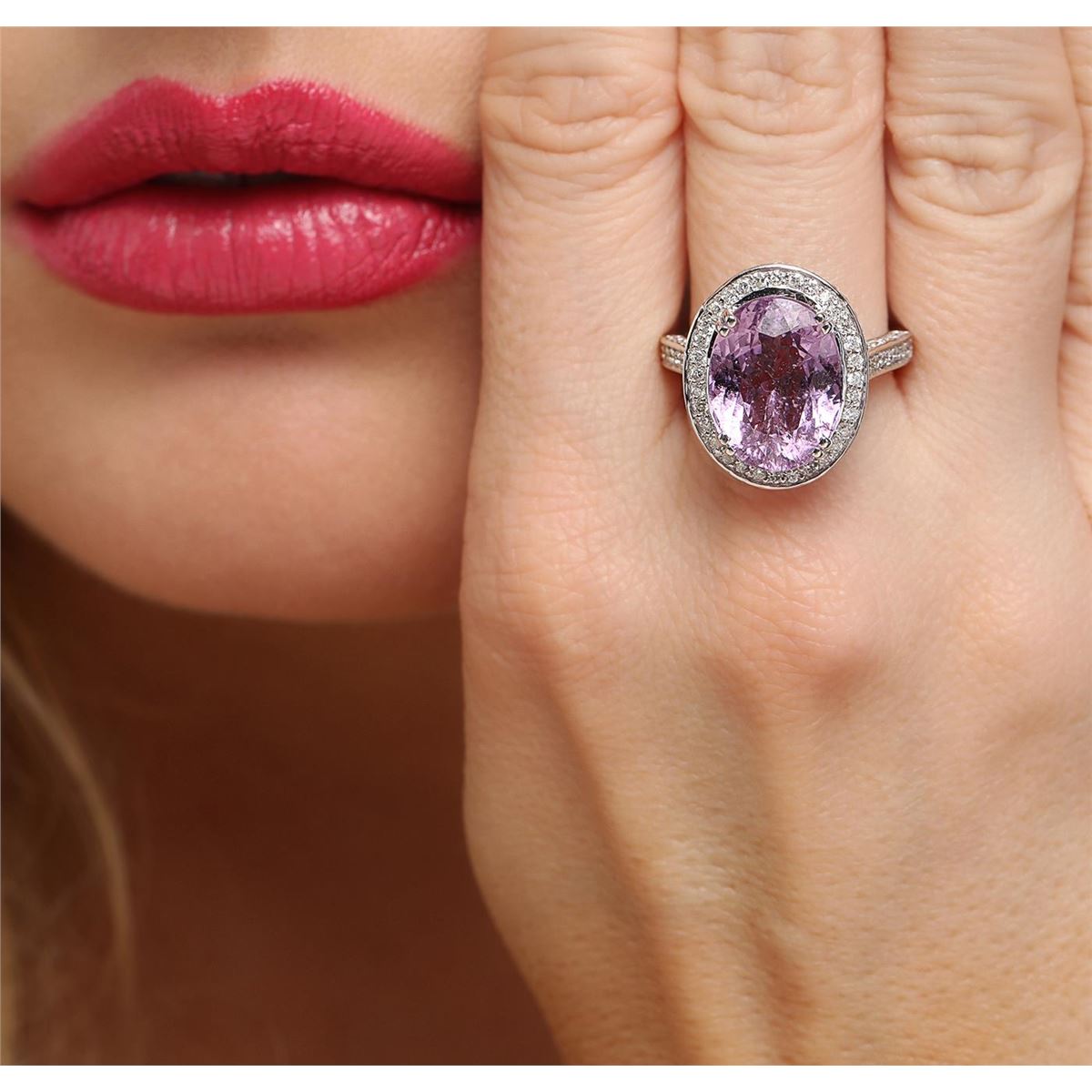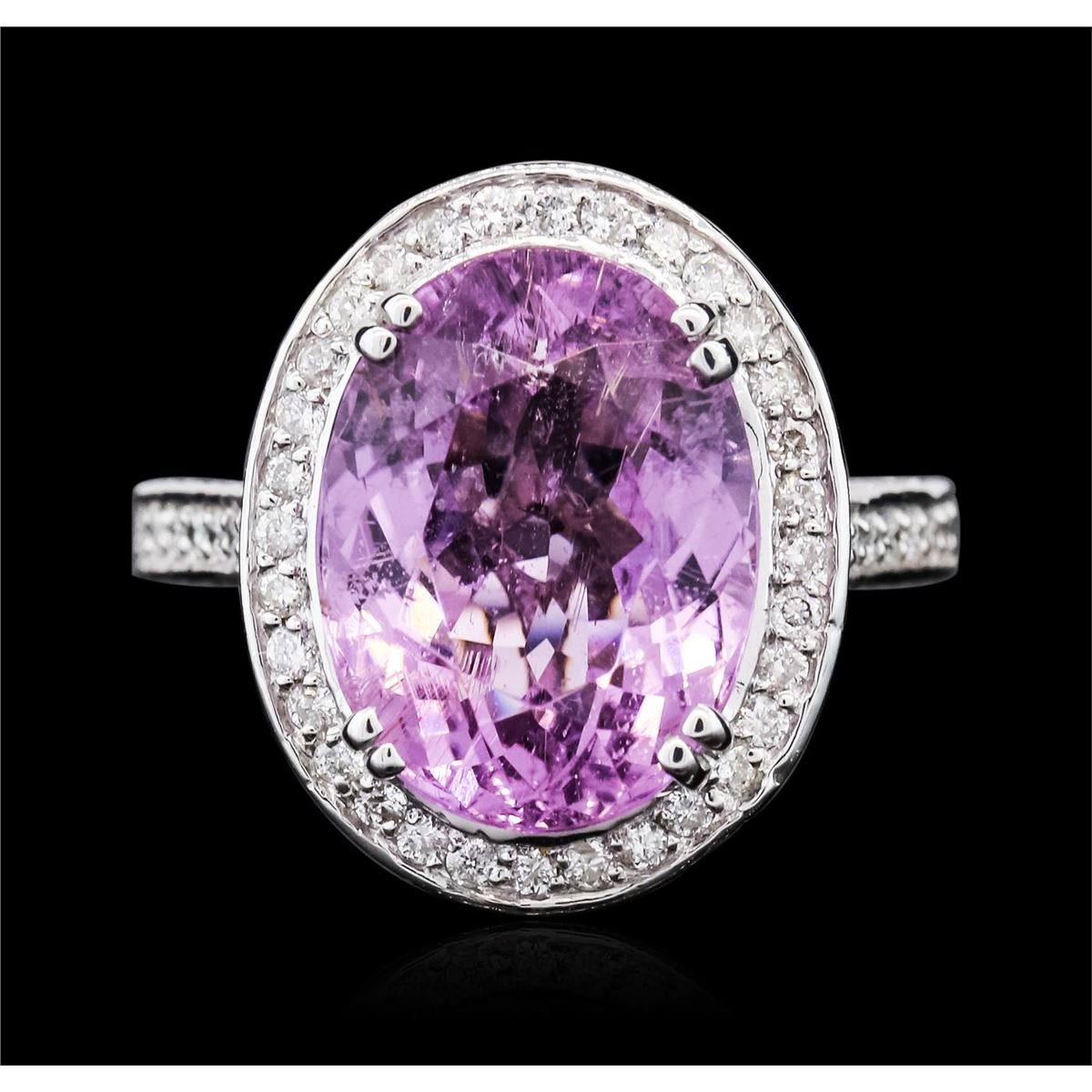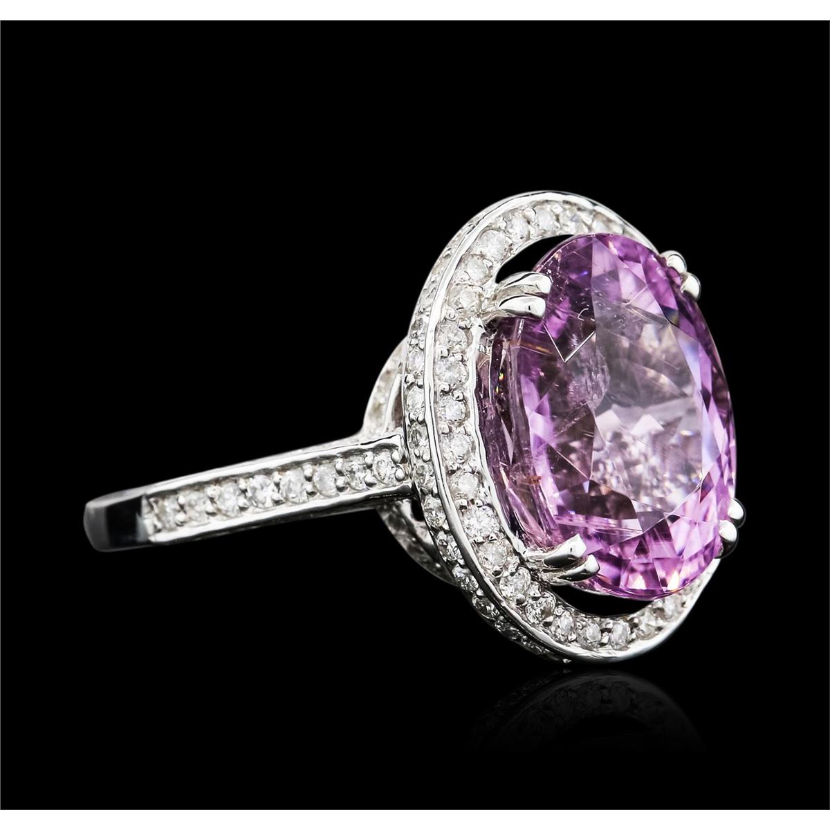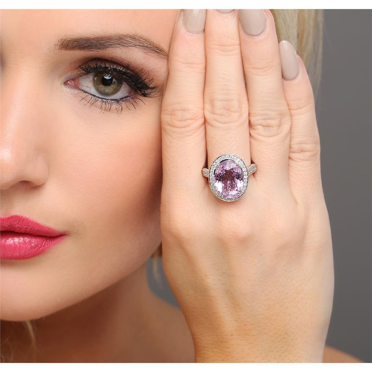 One electronically tested 14KT white gold ladies cast pink tourmaline and diamond ring with a bright polish finish. The featured pink tourmaline is set within a diamond bezel supported by a diamond set under gallery and diamond set shoulders, completed by a two millimeter wide band. Identified with markings of "14K". Condition is new, good workmanship. Containing: One prong set oval mixed cut natural pink tourmaline, measuring 14.80 x 11.15 x 7.80mm, 6%. bulge factor, approximate weight of 8.52ct., clarity is moderately included, medium dark, very slightly grayish, pink color, (GIA Pk 6/3), cut is good. Transmitting light with a minimum of distortion, transparent. Naturally occurring internal & external characteristics are present. Colored Stone Grading Report attached. Graded in the setting. This color of tourmaline is commonly irradiated to improve or change the color. Whether or not this gemstone has been irradiated cannot currently be determined. One Hundred Thirty-Eight prong set round brilliant cut diamonds, measuring 1.60 - 1.40 x 0.90mm (depth est.) approximate total weight of 138 Stones = 1.79ct. Graded in the setting. Clarity: SI-1 to I-1. Color: H - J. Total Weight of Colored Stones 8.52ct. Total Weight of Diamonds 1.79ct. Total Weight of Ring 8.98 grams. AIG Appraised at $9,435.00.