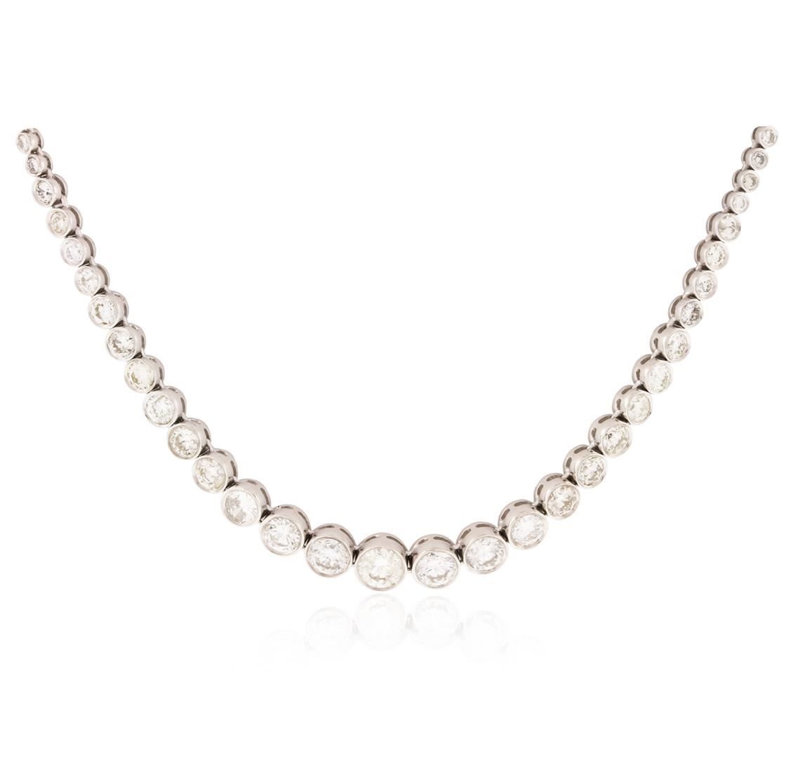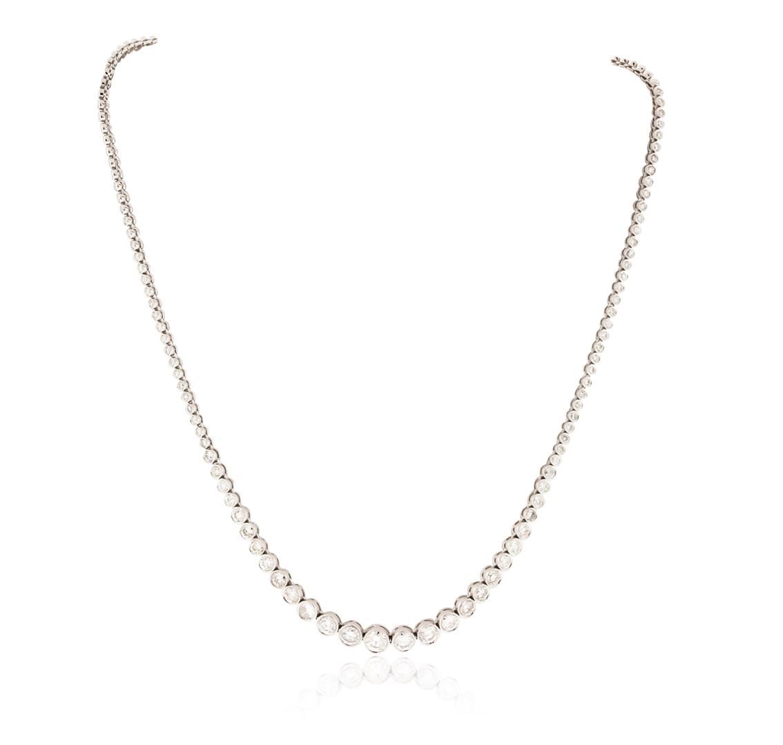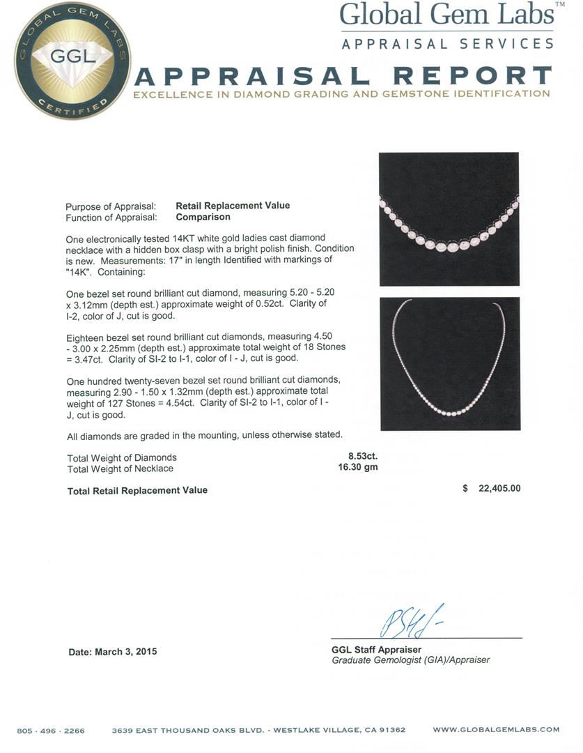 One electronically tested 14KT white gold ladies cast diamond necklace with a hidden box clasp with a bright polish finish. Measurements: 17" in length Identified with markings of "14K". Condition is new. Containing: One bezel set round brilliant cut diamond, measuring 5.20 - 5.20 x 3.12mm (depth est.) approximate weight of 0.52ct. Clarity: I-2. Color: J, Cut is Good. Eighteen bezel set round brilliant cut diamonds, measuring 4.50 - 3.00 x 2.25mm (depth est.) approximate total weight of 18 Stones = 3.47ct. Clarity: SI-2 to I-1. Color: I - J, Cut is Good. One Hundred Twenty-Seven bezel set round brilliant cut diamonds, measuring 2.90 - 1.50 x 1.32mm (depth est.) approximate total weight of 127 Stones = 4.54ct. Clarity: SI-2 to I-1. Color: I - J, Cut is Good. All diamonds are graded in the mounting, unless otherwise stated. Total Weight of Diamonds 8.53ct. Total Weight of Necklace 16.30 grams. GGL Appraised at $22,405.00.