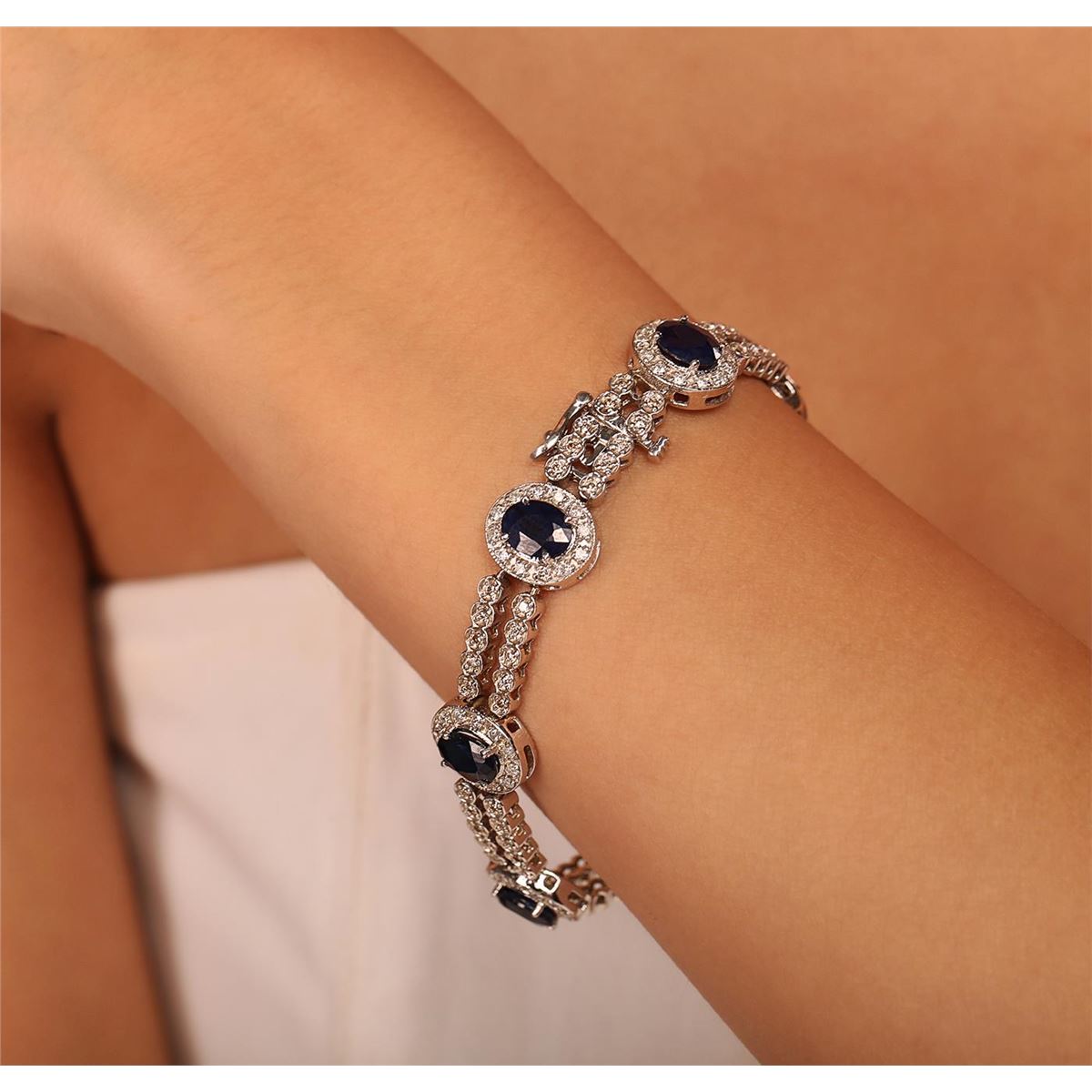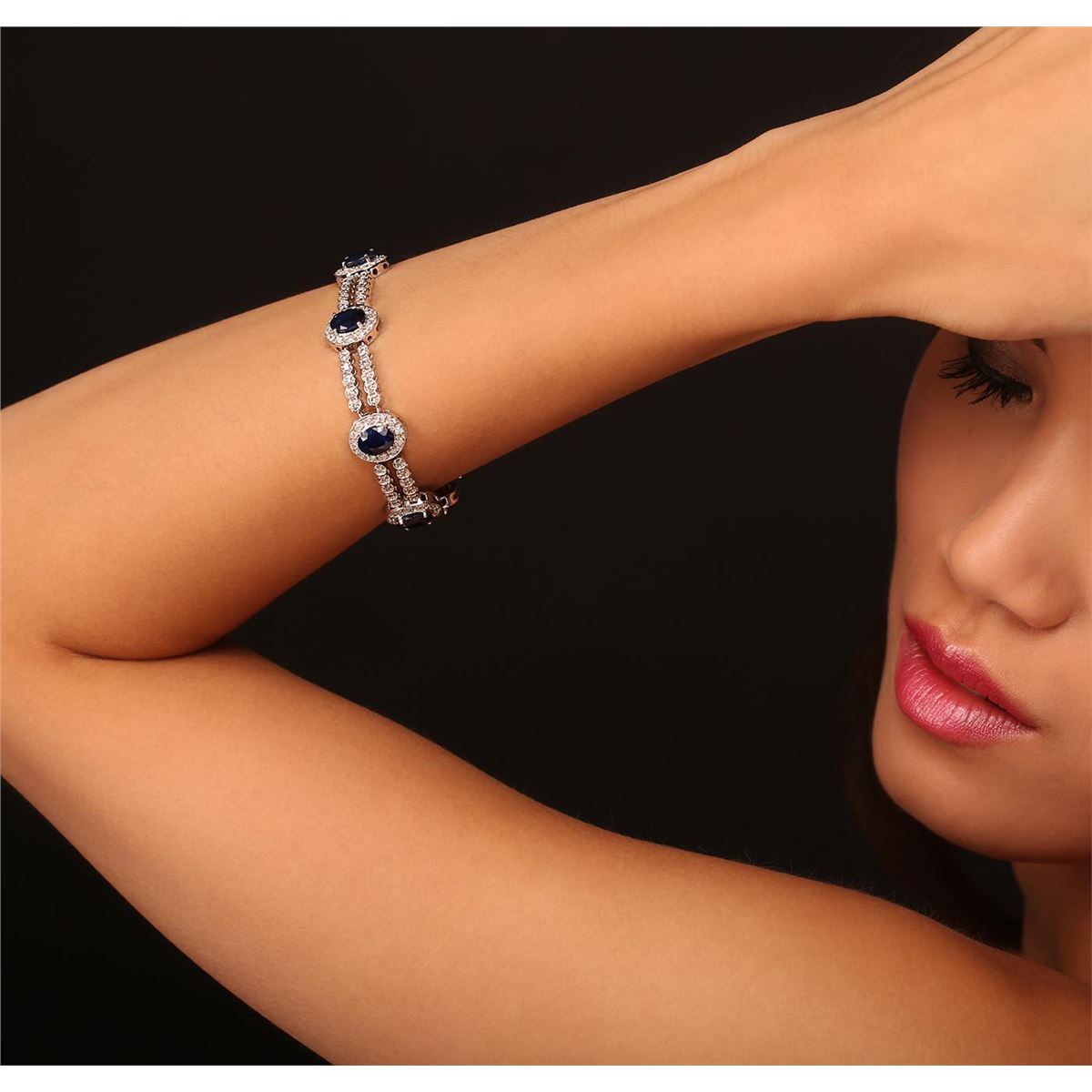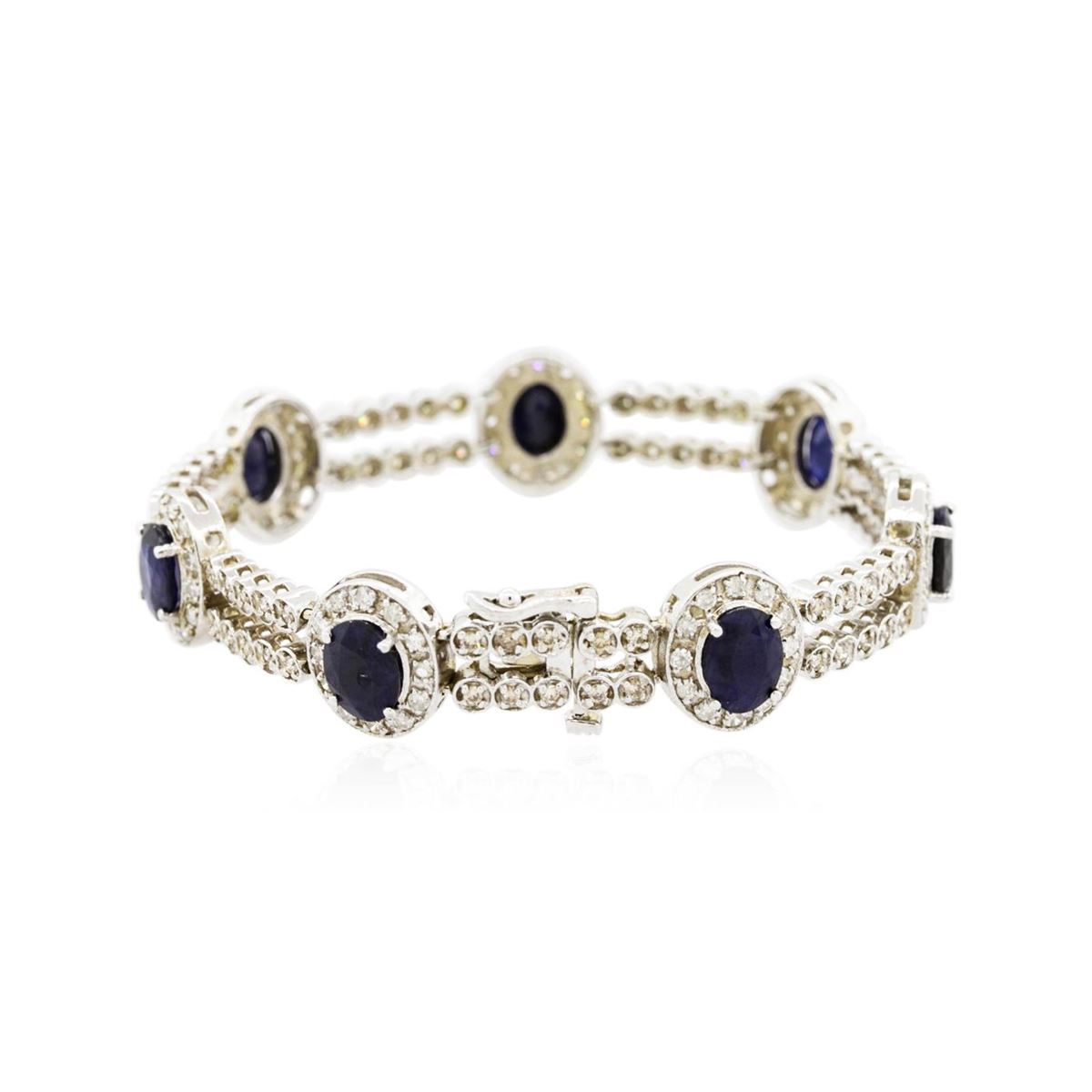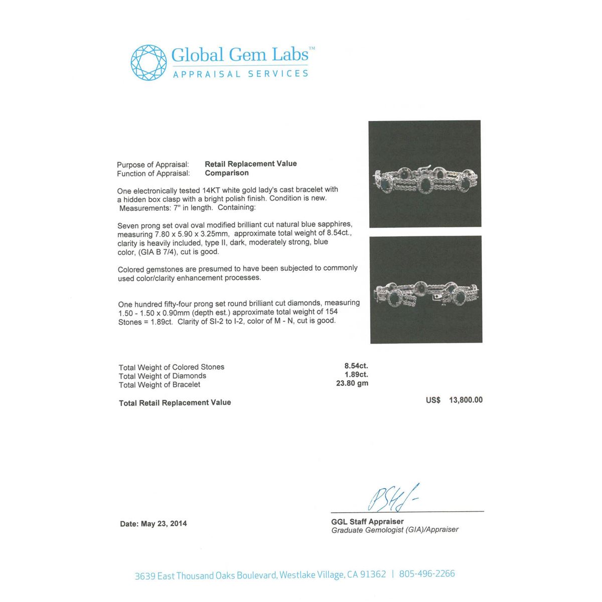 One electronically tested 14KT white gold Ladies cast bracelet with a hidden box clasp with a bright polish finish. Condition is new. Measurements: 7" in length. Containing: Seven prong set oval modified brilliant cut natural blue sapphires, measuring 7.80 x 5.90 x 3.25mm, approximate. Total Weight of 8.54ct., clarity is heavily included, type II, dark, moderately strong, blue color, (GIA B 7/4), cut is good. Colored gemstones are presumed to have been subjected to commonly used color/clarity enhancement processes. One Hundred Fifty-Four prong set round brilliant cut diamonds, measuring 1.50 - 1.50 x 0.90mm (depth est.) approximate. Total Weight of 154 Stones = 1.89ct. Clarity: SI-2 to I-2. Color: M - N, Cut is Good. Total Weight of Colored Stones 8.54ct. Total Weight of Diamonds 1.89ct. Total Weight of Bracelet 23.80 grams. GGL Appraised at $13,800.00.