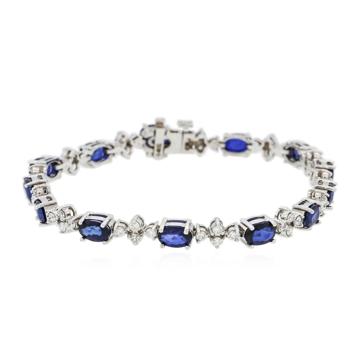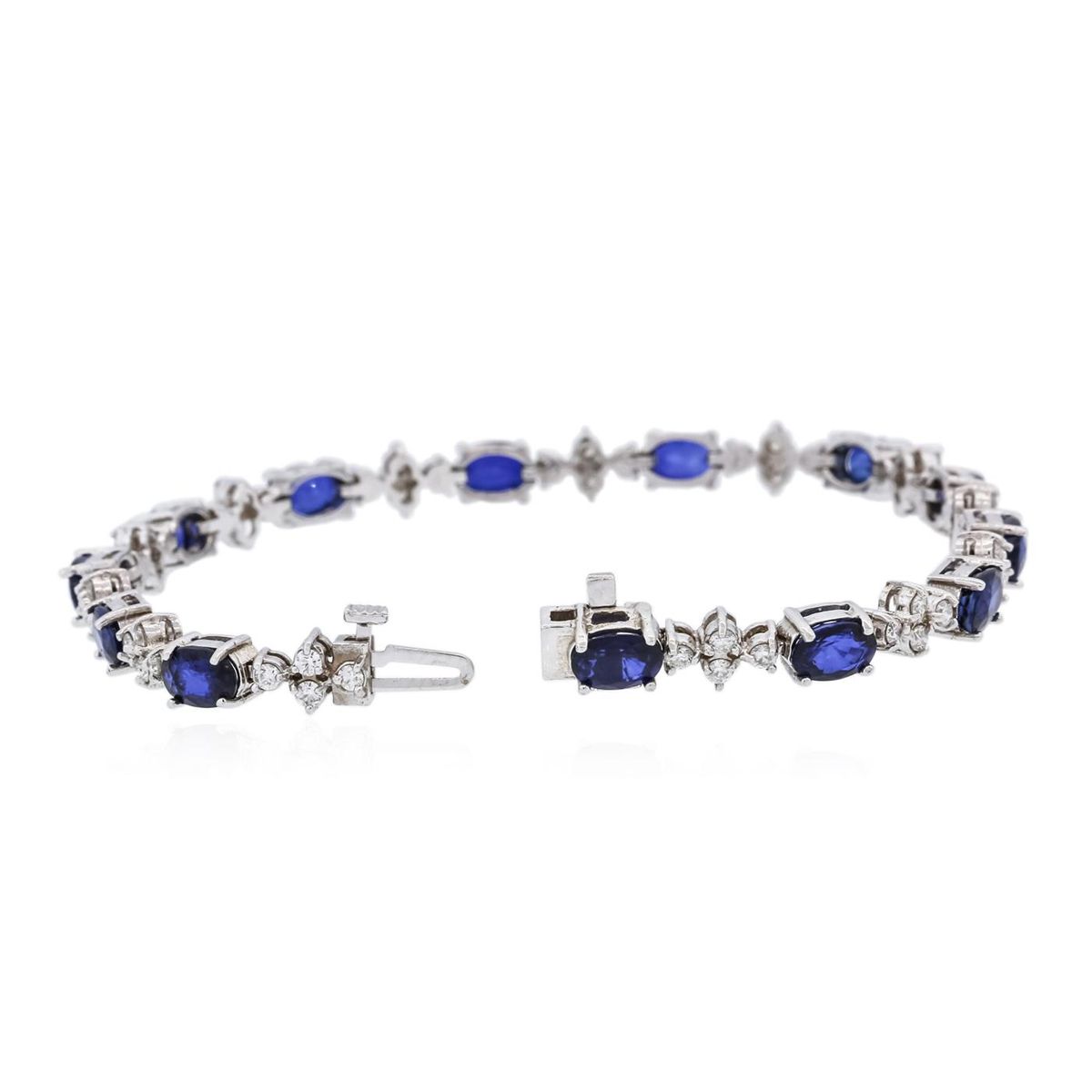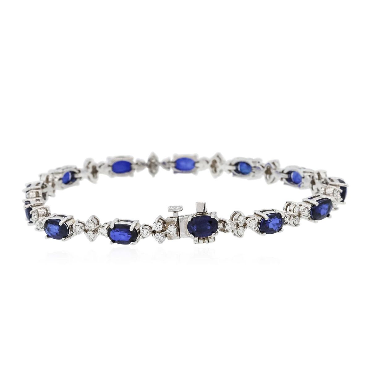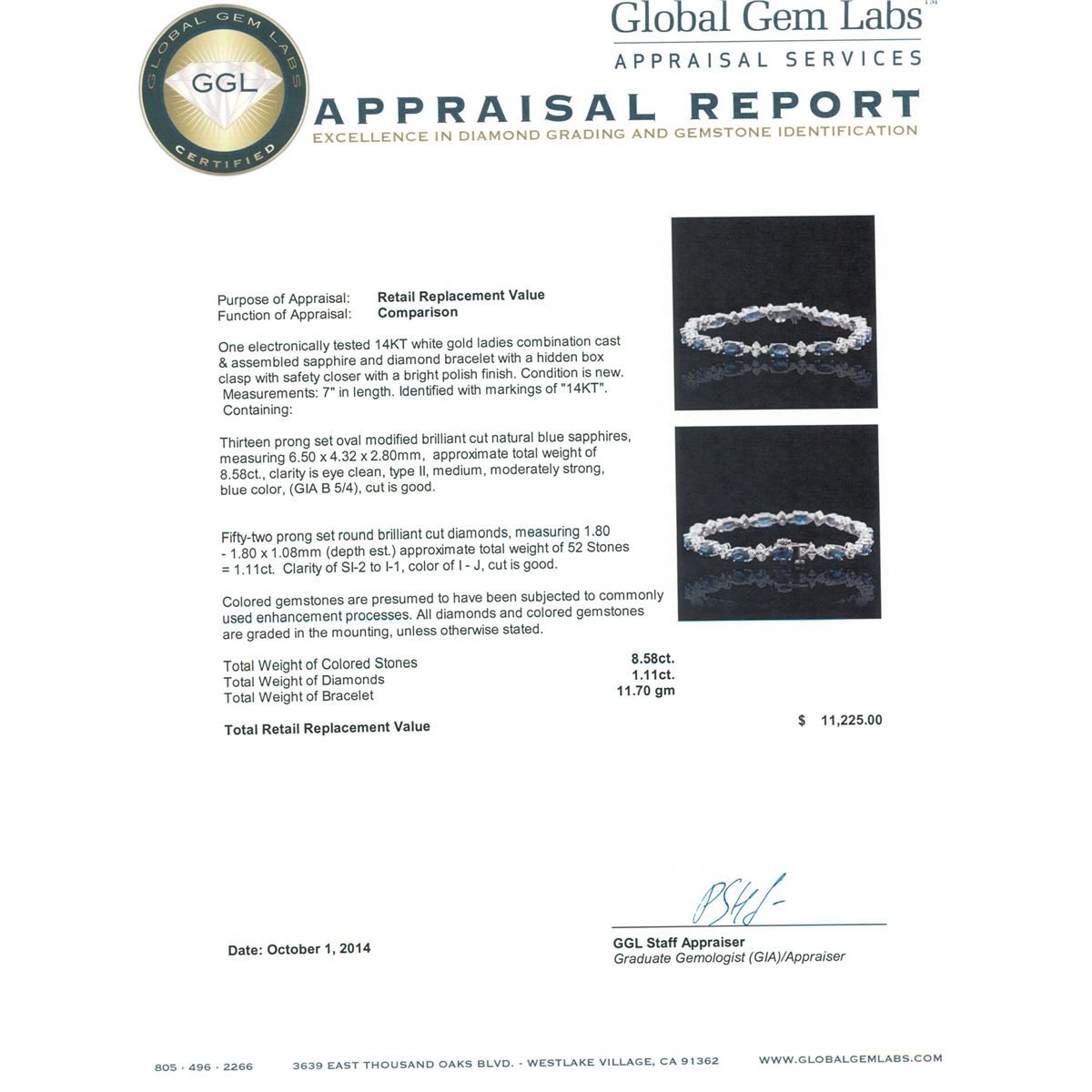 One electronically tested 14KT white gold ladies combination cast & assembled sapphire and diamond bracelet with a hidden box clasp with safety closer with a bright polish finish. Measurements: 7" in length. Identified with markings of "14KT". Condition is new. Containing: Thirteen prong set oval modified brilliant cut natural blue sapphires, measuring 6.50 x 4.32 x 2.80mm, approximate total weight of 8.58ct., clarity is eye clean, type II, medium, moderately strong, blue color, (GIA B 5/4), cut is good. Fifty-Two prong set round brilliant cut diamonds, measuring 1.80 - 1.80 x 1.08mm (depth est.) approximate total weight of 52 Stones = 1.11ct. Clarity: SI-2 to I-1. Color: I - J, Cut is Good. Colored gemstones are presumed to have been subjected to commonly used enhancement processes. All diamonds and colored gemstones are graded in the mounting, unless otherwise stated. Total Weight of Colored Stones 8.58ct. Total Weight of Diamonds 1.11ct. Total Weight of Bracelet 11.70 grams. GGL Appraised at $11,225.00.