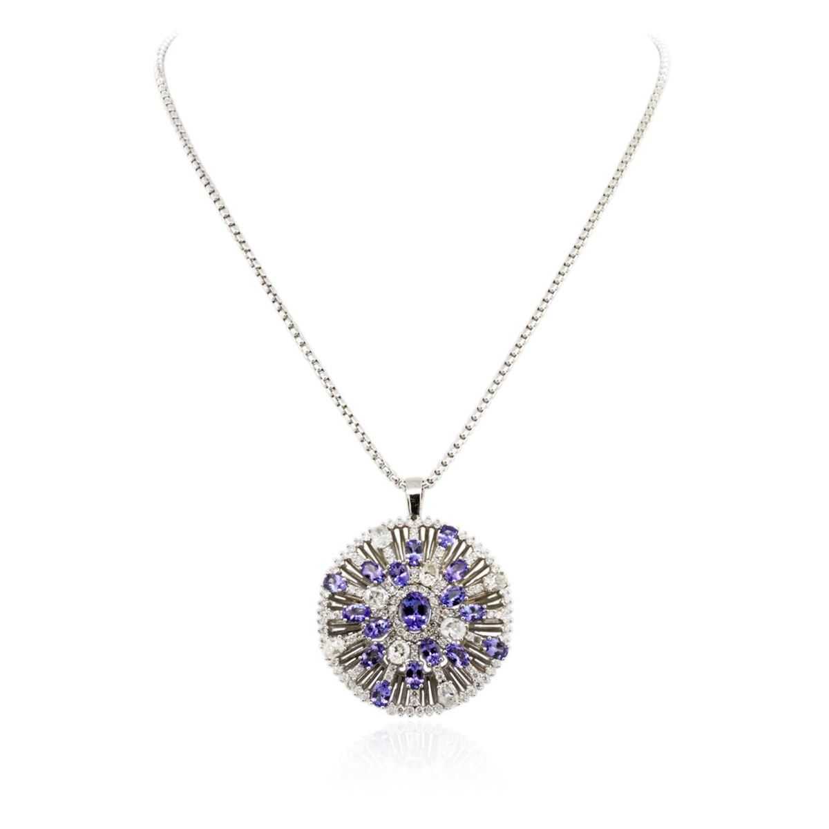 One electronically tested 14KT white gold Ladies combination cast & assembled pendant & chain 17.0" long, medium cable link with a lobster claw clasp with a bright polish finish. Condition is new. Identified with markings of "14K". Containing: One prong set oval modified brilliant cut natural tanzanite, measuring 8.50 x 6.40 x 4.16mm, approximate. Total Weight of 1.55ct., clarity is eye clean, type I, medium, moderately strong, violet color, (GIA V 5/4), cut is good. Sixteen prong set oval modified brilliant cut natural tanzanites, measuring 6.00 x 4.00 x 2.60mm, approximate. Total Weight of 7.04ct., clarity is eye clean, type I, medium, very slightly grayish, violet color, (GIA V 5/3), cut is good. Colored gemstones are presumed to have been subjected to commonly used color/clarity enhancement processes. Eight prong set oval shaped cut diamonds, measuring 5.50 x 4.50 x 2.40mm (depth est.) approximate. Total Weight of 8 Stones = 2.98ct. Clarity: I-1 to I-2. Color: I - J, Cut is Good. One Hundred Fourteen prong set round brilliant cut diamonds, measuring 1.80 - 1.80 x 1.08mm (depth est.) approximate. Total Weight of 114 Stones = 2.43ct. Clarity: I-1 to I-2. Color: I - J, Cut is Good. Total Weight of Colored Stones 8.59ct. Total Weight of Diamonds 5.40ct. Total Weight of Pendant & Chain 25.10 grams. GGL Appraised at $29,795.00.