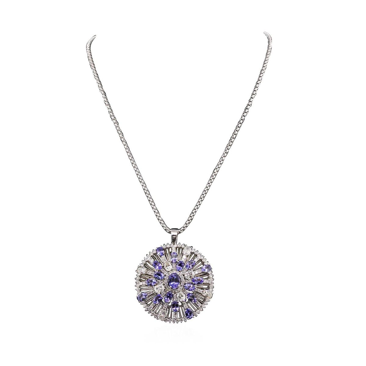 One electronically tested 14KT white gold Ladies combination cast & assembled pendant & chain 17.0" long, medium cable link with a lobster claw clasp with a bright polish finish. Condition is new. Identified with markings of "14K". Containing: One prong set oval modified brilliant cut natural tanzanite, measuring 8.50 x 6.40 x 4.16mm, approximate. Total Weight of 1.55ct., clarity is eye clean, type I, medium, moderately strong, violet color, (GIA V 5/4), cut is good. Sixteen prong set oval modified brilliant cut natural tanzanites, measuring 6.00 x 4.00 x 2.60mm, approximate. Total Weight of 7.04ct., clarity is eye clean, type I, medium, very slightly grayish, violet color, (GIA V 5/3), cut is good. Colored gemstones are presumed to have been subjected to commonly used color/clarity enhancement processes. Eight prong set oval shaped cut diamonds, measuring 5.50 x 4.50 x 2.40mm (depth est.) approximate. Total Weight of 8 Stones = 2.98ct. Clarity: I-1 to I-2. Color: I - J, Cut is Good. One Hundred Fourteen prong set round brilliant cut diamonds, measuring 1.80 - 1.80 x 1.08mm (depth est.) approximate. Total Weight of 114 Stones = 2.43ct. Clarity: I-1 to I-2. Color: I - J, Cut is Good. Total Weight of Colored Stones 8.59ct. Total Weight of Diamonds 5.40ct. Total Weight of Pendant & Chain 25.10 grams. GGL Appraised at $29,795.00.