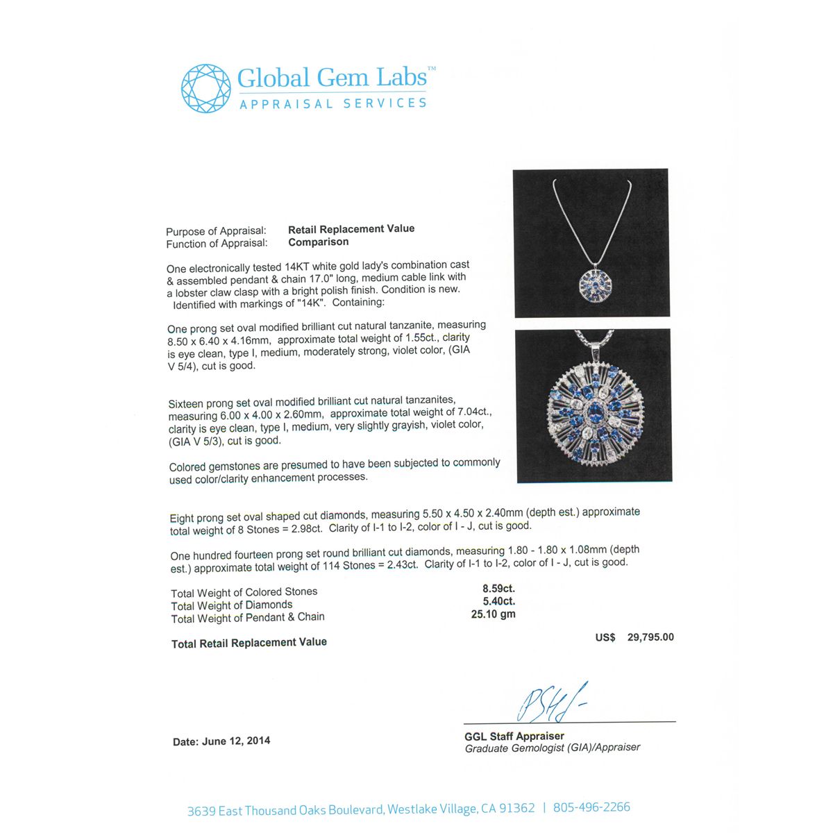 One electronically tested 14KT white gold Ladies combination cast & assembled pendant & chain 17.0" long, medium cable link with a lobster claw clasp with a bright polish finish. Condition is new. Identified with markings of "14K". Containing: One prong set oval modified brilliant cut natural tanzanite, measuring 8.50 x 6.40 x 4.16mm, approximate. Total Weight of 1.55ct., clarity is eye clean, type I, medium, moderately strong, violet color, (GIA V 5/4), cut is good. Sixteen prong set oval modified brilliant cut natural tanzanites, measuring 6.00 x 4.00 x 2.60mm, approximate. Total Weight of 7.04ct., clarity is eye clean, type I, medium, very slightly grayish, violet color, (GIA V 5/3), cut is good. Colored gemstones are presumed to have been subjected to commonly used color/clarity enhancement processes. Eight prong set oval shaped cut diamonds, measuring 5.50 x 4.50 x 2.40mm (depth est.) approximate. Total Weight of 8 Stones = 2.98ct. Clarity: I-1 to I-2. Color: I - J, Cut is Good. One Hundred Fourteen prong set round brilliant cut diamonds, measuring 1.80 - 1.80 x 1.08mm (depth est.) approximate. Total Weight of 114 Stones = 2.43ct. Clarity: I-1 to I-2. Color: I - J, Cut is Good. Total Weight of Colored Stones 8.59ct. Total Weight of Diamonds 5.40ct. Total Weight of Pendant & Chain 25.10 grams. GGL Appraised at $29,795.00.