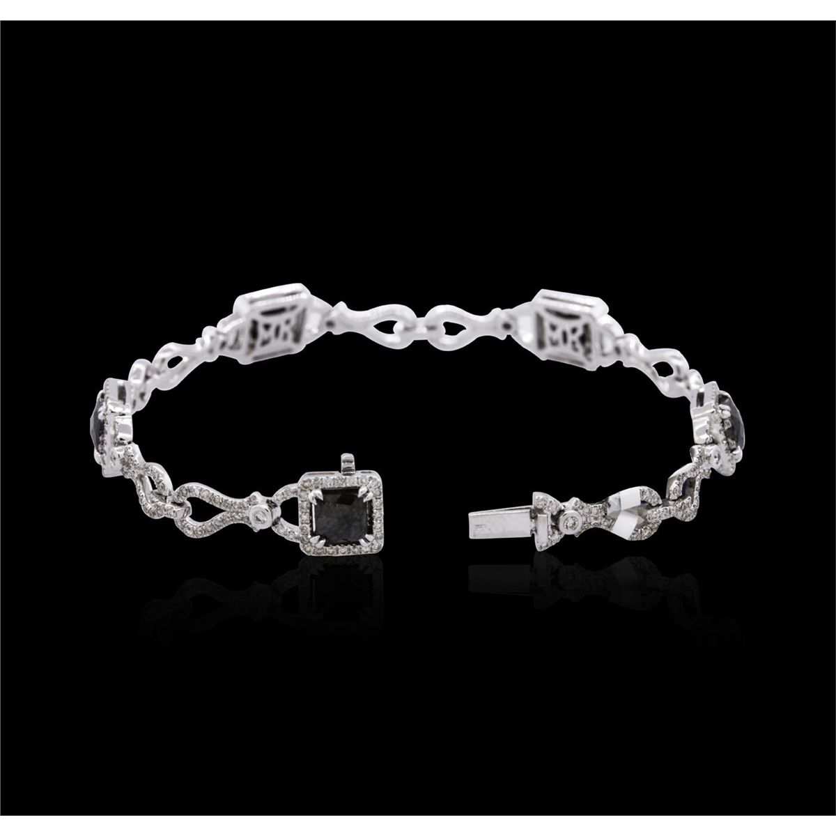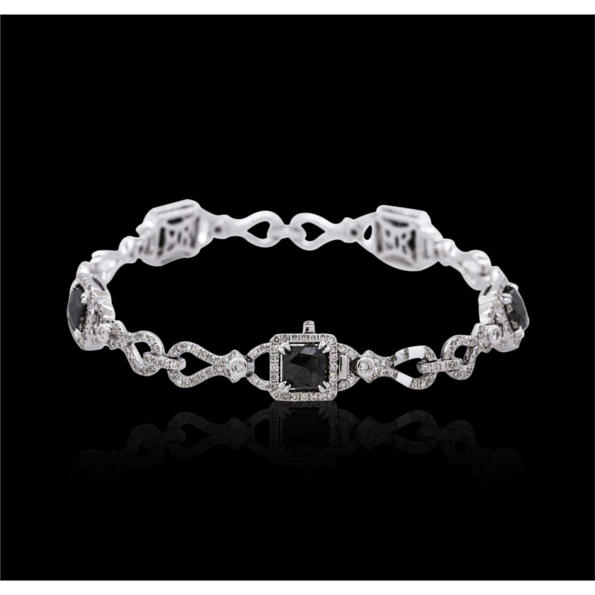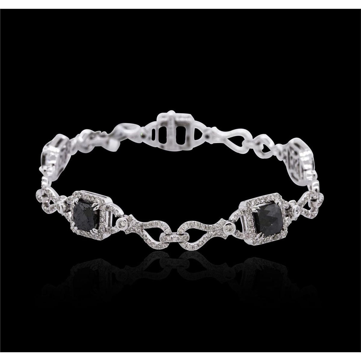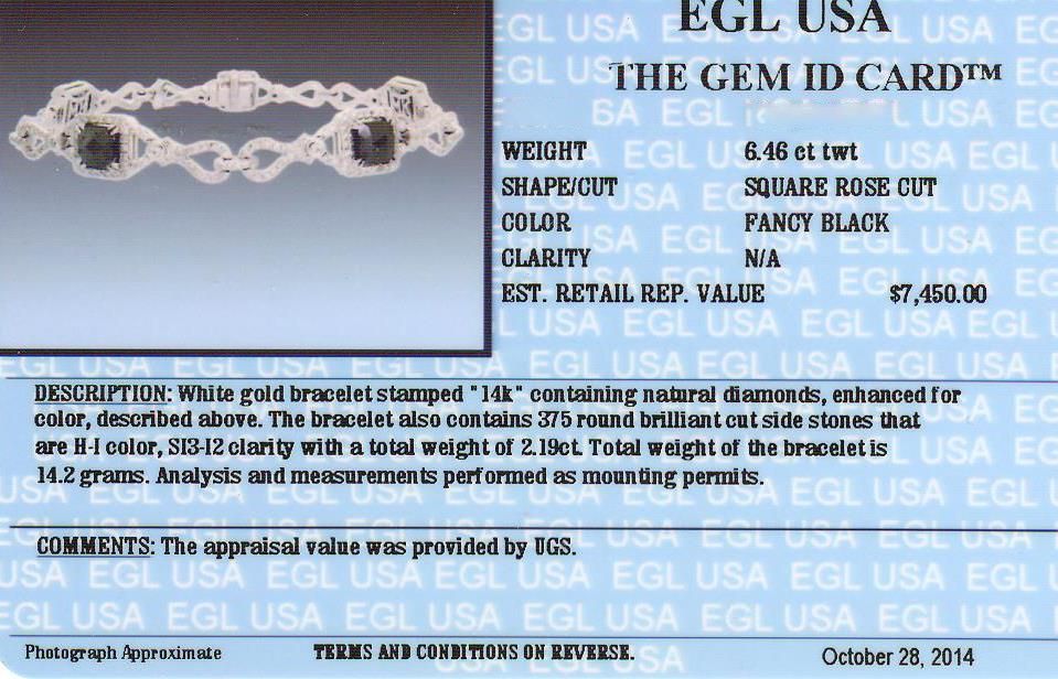 One white gold bracelet stamped 14k containing natural square rose cut fancy black diamonds, enhanced for color, with a total weight of 6.46ct. The bracelet also contains 375 round brilliant cut side stones that are H-I color, SI3-I2 clarity with a total weight of 2.19ct. Total weight of the bracelet is 14.20 grams. EGL Appraised at $7,450.00.