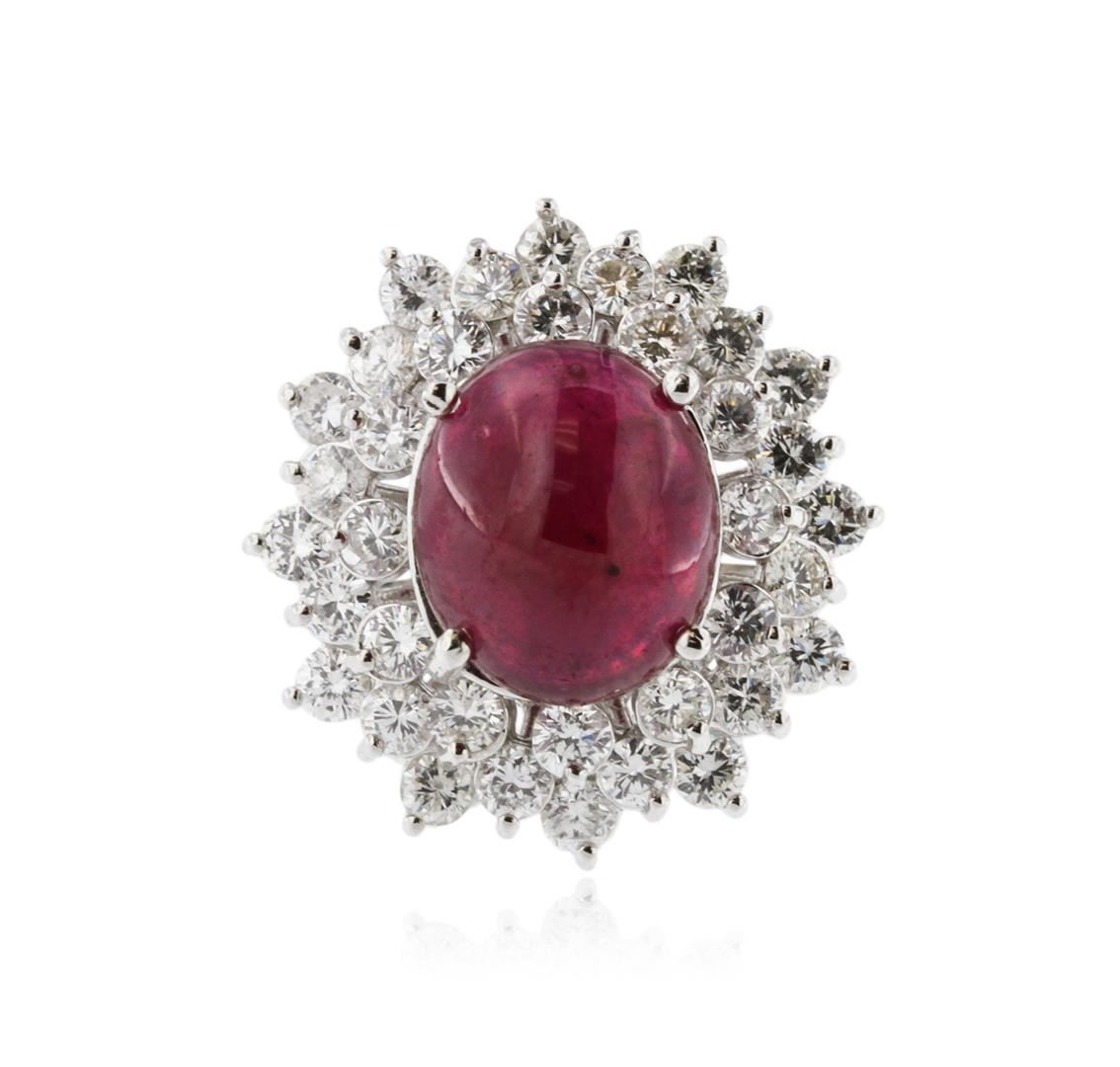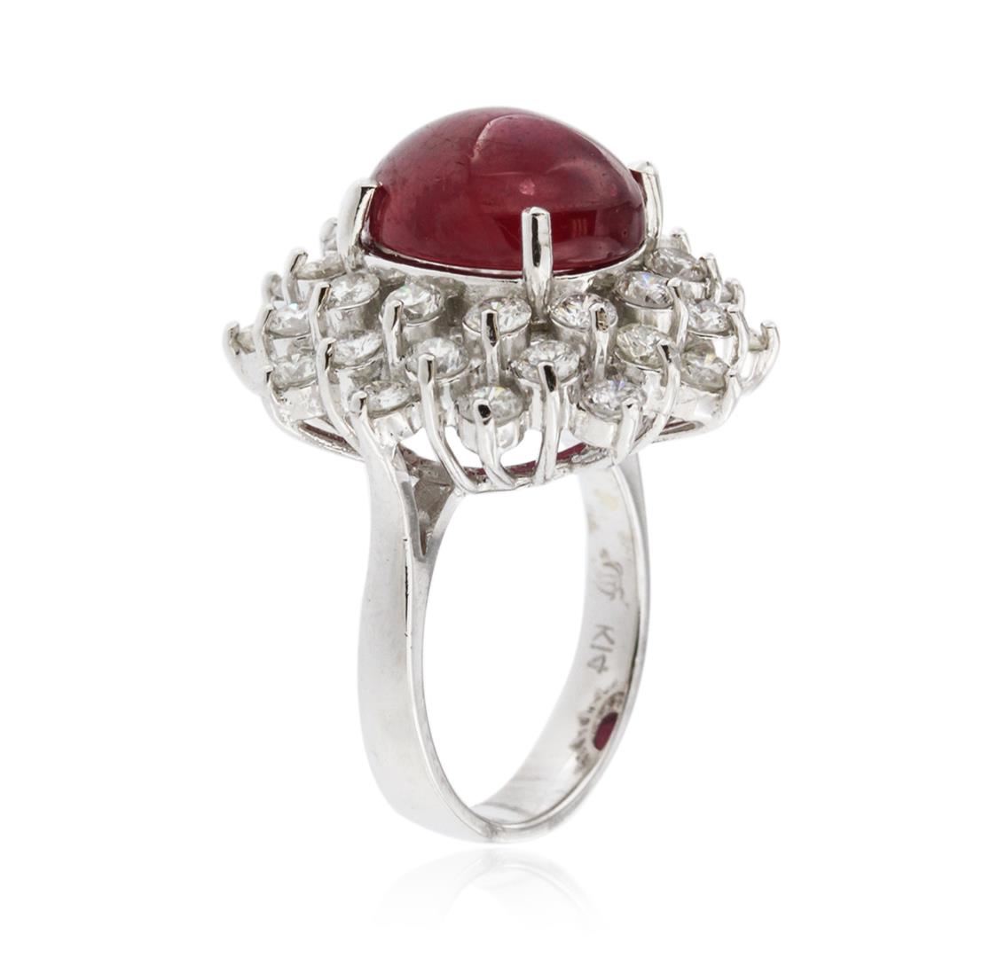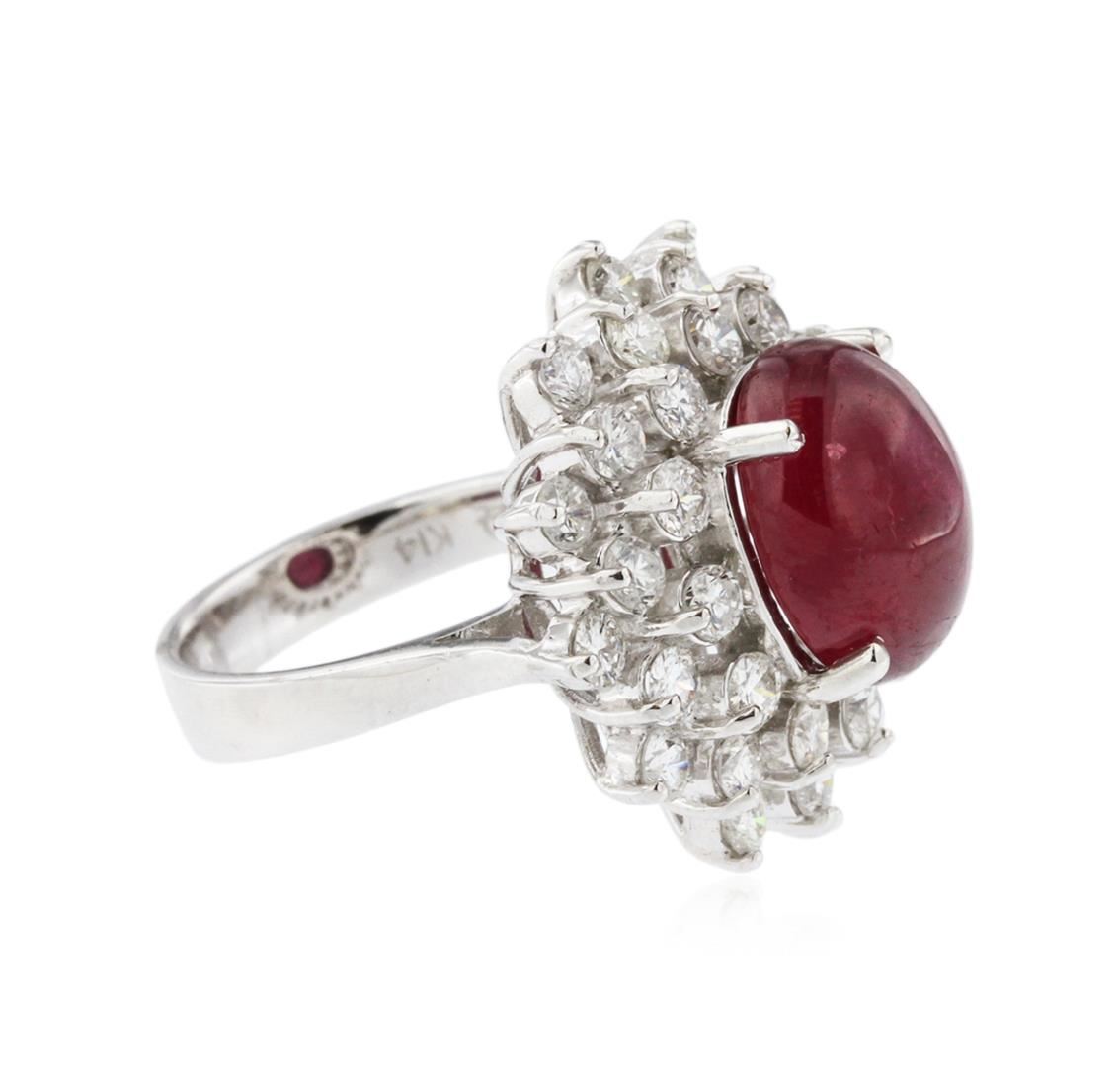 One electronically tested 14KT white gold ladies cast ruby and diamond ring with a bright polish finish. Identified with markings of "14K". Condition is new. Containing: One prong set oval cabochon cut natural ruby, measuring 12.70 x 10.60 x 5.90mm, approximate weight of 8.69ct., clarity is heavily included, medium, moderately strong, strongly purplish red color, (GIA stpR 5/4), cut is good. Thirty-Seven prong set round brilliant cut diamonds, measuring 2.80 - 2.80 x 1.68mm (depth est.) approximate total weight of 37 Stones = 2.97ct. Clarity: SI-1 to SI-2. Color: J - K, Cut is Good. Colored gemstones are presumed to have been subjected to commonly used enhancement processes, All diamonds and colored gemstones are graded in the mounting, unless otherwise stated. Total Weight of Colored Stones 8.69ct. Total Weight of Diamonds 2.97ct. Total Weight of Ring 11.30 grams. GGL Appraised at $7,690.00.