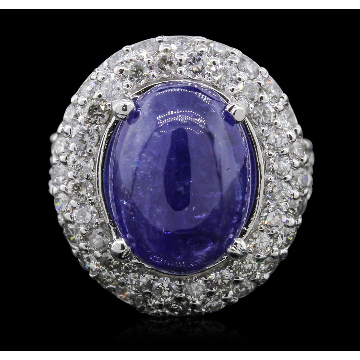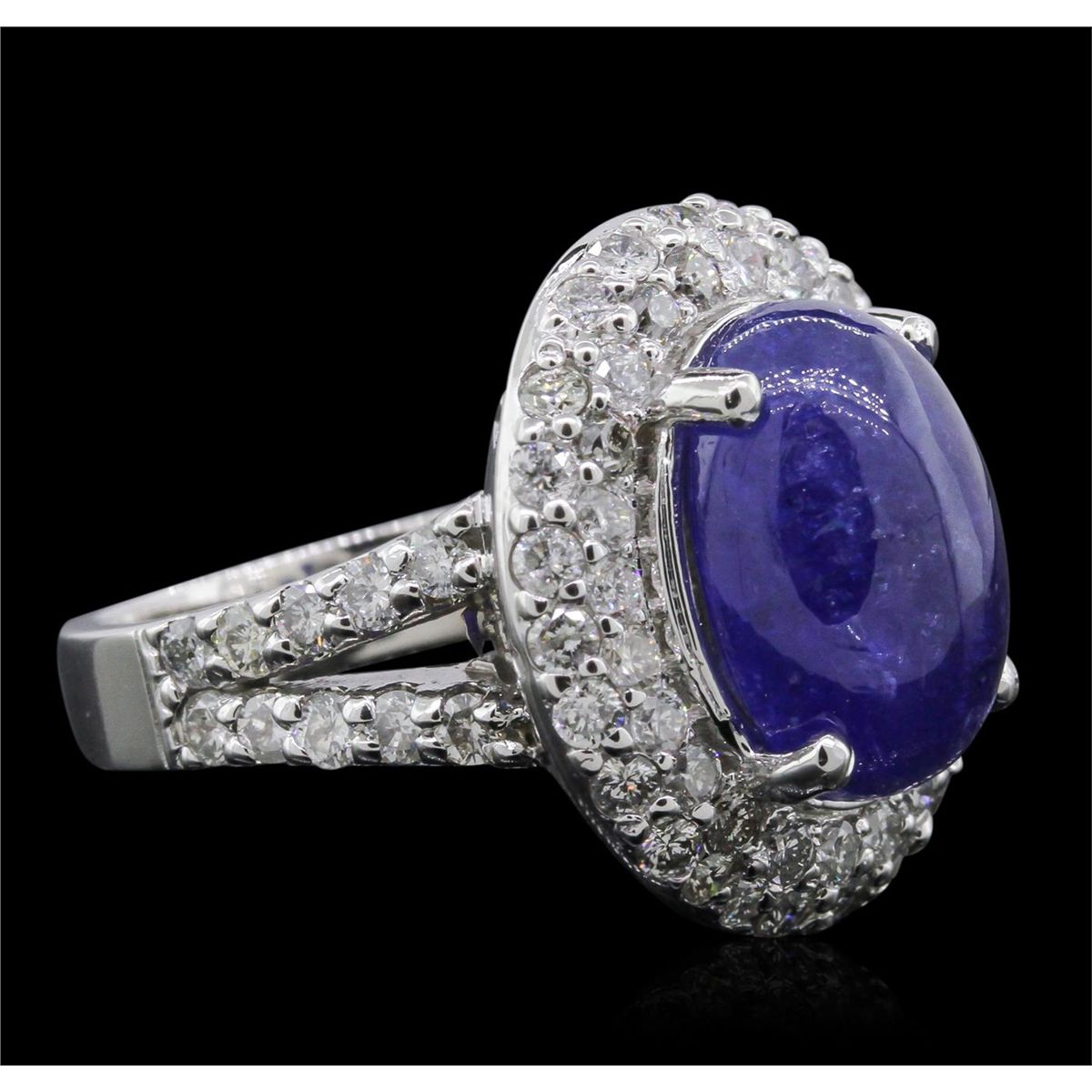 One electronically tested 14KT white gold ladies cast tanzanite and diamond ring with a bright polish finish. The featured tanzanite is set within two tiered diamond bezels supported by a diamond accented under gallery and diamond set split shoulders, completed by a three and one-half millimeter wide band. Identified with markings of "14K". Condition is new, good workmanship. Containing: One prong set oval cabochon cut natural tanzanite, measuring 14.30 x 10.65 x 5.50mm, 15%. bulge factor, approximate weight of 8.71ct., clarity is moderately included, type I, medium dark, moderately strong, bluish violet color, (GIA bV 6/4), cut is good. Transmitting light somewhat diffusely, transparent to translucent. Naturally occurring internal & external characteristics are present. Colored Stone Grading Report attached. Graded in the setting. Tanzanite is a very rare gemstone that is only found in the country of Tanzania. Originally discovered in 1967. Tiffany & Company, named the stone Tanzanite. It is found in the Usumburu Mountains that border the Umba Valley of northern Tanzania. Tanzanite occurs in gray, brown, violet, blue, reddish-purple, & green. The gem is interesting because of its exceptional pleochroism. Rotated in different directions a tanzanite will exhibit multiple changes of color. Tanzanite has a low tolerance to ultrasonic cleaning, and should not be cleaned using this method. Eighty-Two prong set round brilliant cut diamonds, measuring 2.10 - 2.00 x 1.23mm (depth est.) approximate. Total Weight of 82 Stones = 2.60ct. Graded in the setting. Clarity: SI-1 to I-1. Color: H - J. Total Weight of Colored Stones 8.71ct. Total Weight of Diamonds 2.60ct. AIG Appraised at $15,485.00.