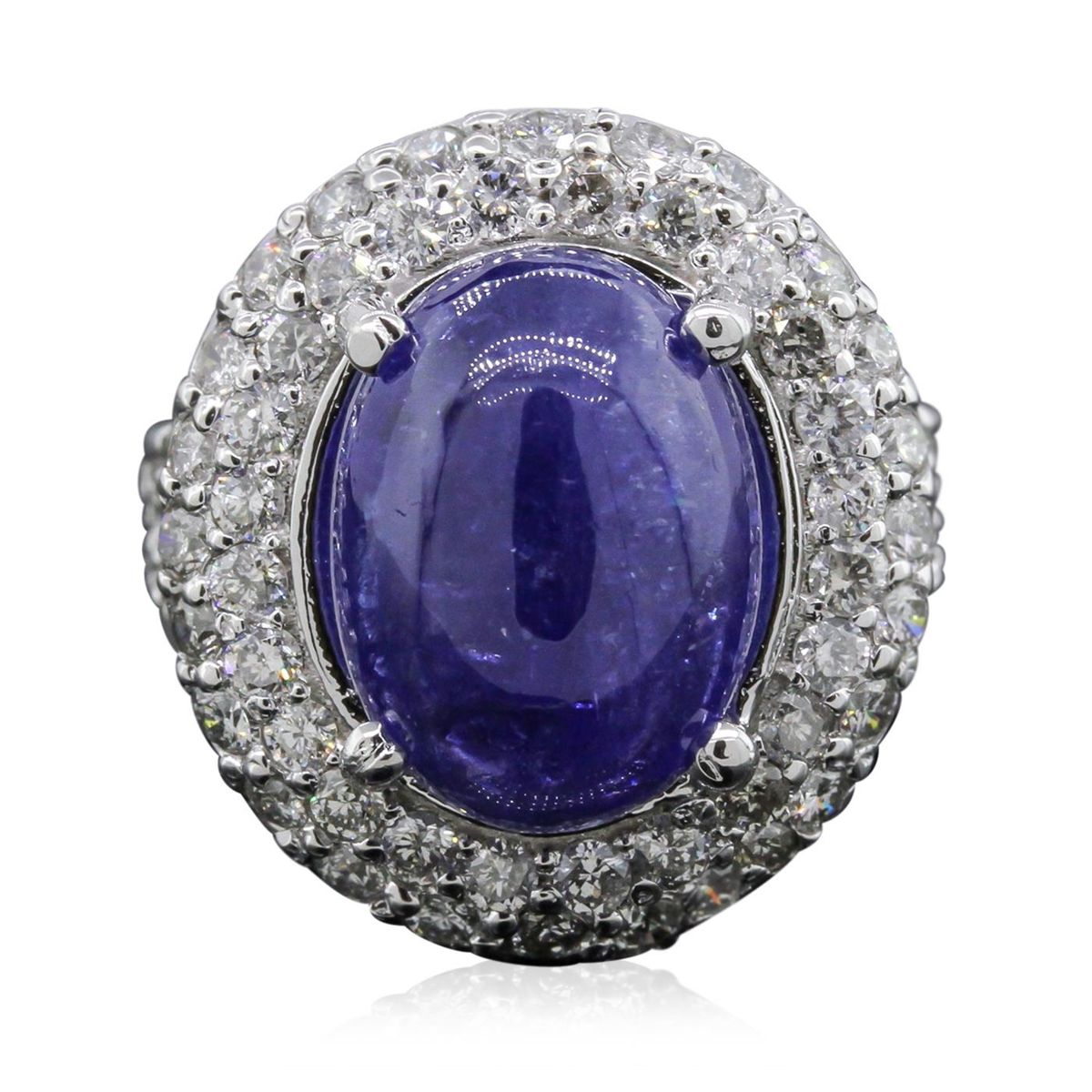One electronically tested 14KT white gold ladies cast tanzanite and diamond ring with a bright polish finish. The featured tanzanite is set within two tiered diamond bezels supported by a diamond accented under gallery and diamond set split shoulders, completed by a three and one-half millimeter wide band. Identified with markings of "14K". Condition is new, good workmanship. Containing: One prong set oval cabochon cut natural tanzanite, measuring 14.30 x 10.65 x 5.50mm, 15%. bulge factor, approximate weight of 8.71ct., clarity is moderately included, type I, medium dark, moderately strong, bluish violet color, (GIA bV 6/4), cut is good. Transmitting light somewhat diffusely, transparent to translucent. Naturally occurring internal & external characteristics are present. Colored Stone Grading Report attached. Graded in the setting. Tanzanite is a very rare gemstone that is only found in the country of Tanzania. Originally discovered in 1967. Tiffany & Company, named the stone Tanzanite. It is found in the Usumburu Mountains that border the Umba Valley of northern Tanzania. Tanzanite occurs in gray, brown, violet, blue, reddish-purple, & green. The gem is interesting because of its exceptional pleochroism. Rotated in different directions a tanzanite will exhibit multiple changes of color. Tanzanite has a low tolerance to ultrasonic cleaning, and should not be cleaned using this method. Eighty-Two prong set round brilliant cut diamonds, measuring 2.10 - 2.00 x 1.23mm (depth est.) approximate. Total Weight of 82 Stones = 2.60ct. Graded in the setting. Clarity: SI-1 to I-1. Color: H - J. Total Weight of Colored Stones 8.71ct. Total Weight of Diamonds 2.60ct. AIG Appraised at $15,485.00.