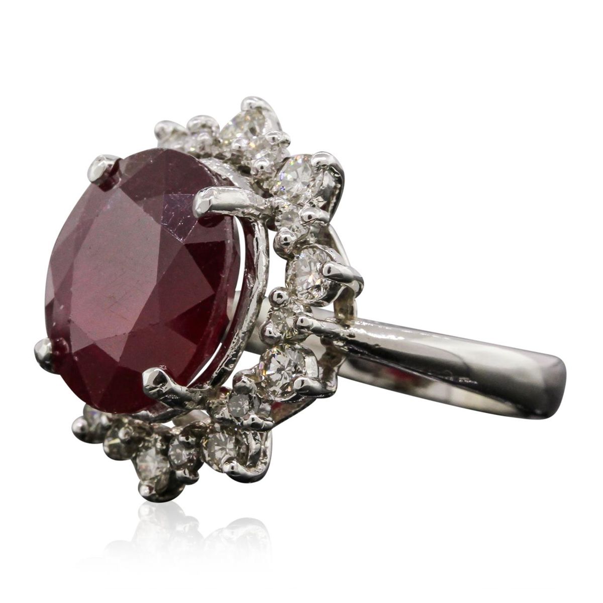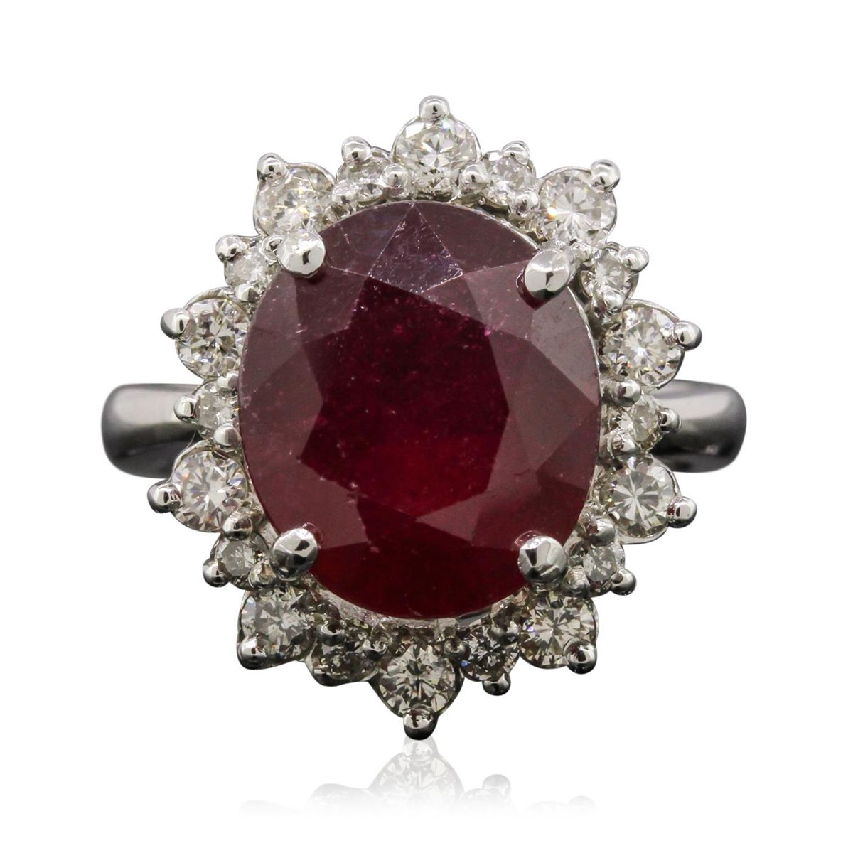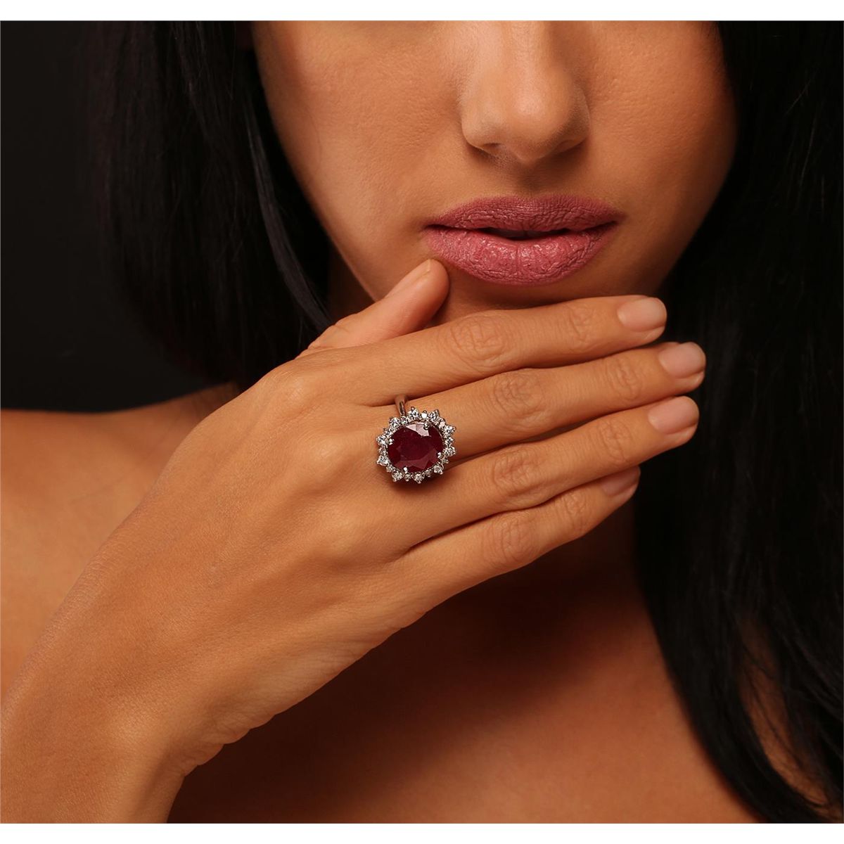One electronically tested 14KT white gold Ladies combination cast & assembled ring with a bright polish finish. Condition is new. Identified with markings of "K14". Containing: One prong set oval modified brilliant cut natural ruby, measuring 13.34 x 11.57 x 7.10mm, approximate weight of 8.81ct., clarity is heavily included, type II, medium dark, moderately strong, strongly purplish red color, (GIA stpR 6/4), cut is good. Colored gemstones are presumed to have been subjected to commonly used color/clarity enhancement processes. Ten prong set round brilliant cut diamonds, measuring 2.80 - 2.80 x 1.68mm (depth est.) approximate. Total Weight of 10 Stones = 0.80ct. Clarity: I-1 to I-2. Color: J - K, Cut is Good. Ten prong set round brilliant cut diamonds, measuring 1.50 - 1.50 x 0.90mm (depth est.) approximate. Total Weight of 10 Stones = 0.12ct. Clarity: I-1 to I-2. Color: J - K, Cut is Good. Total Weight of Colored Stones 8.81ct. Total Weight of Diamonds 0.93ct. Total Weight of Ring 7.80 grams. GGL Appraised at $5,465.00.