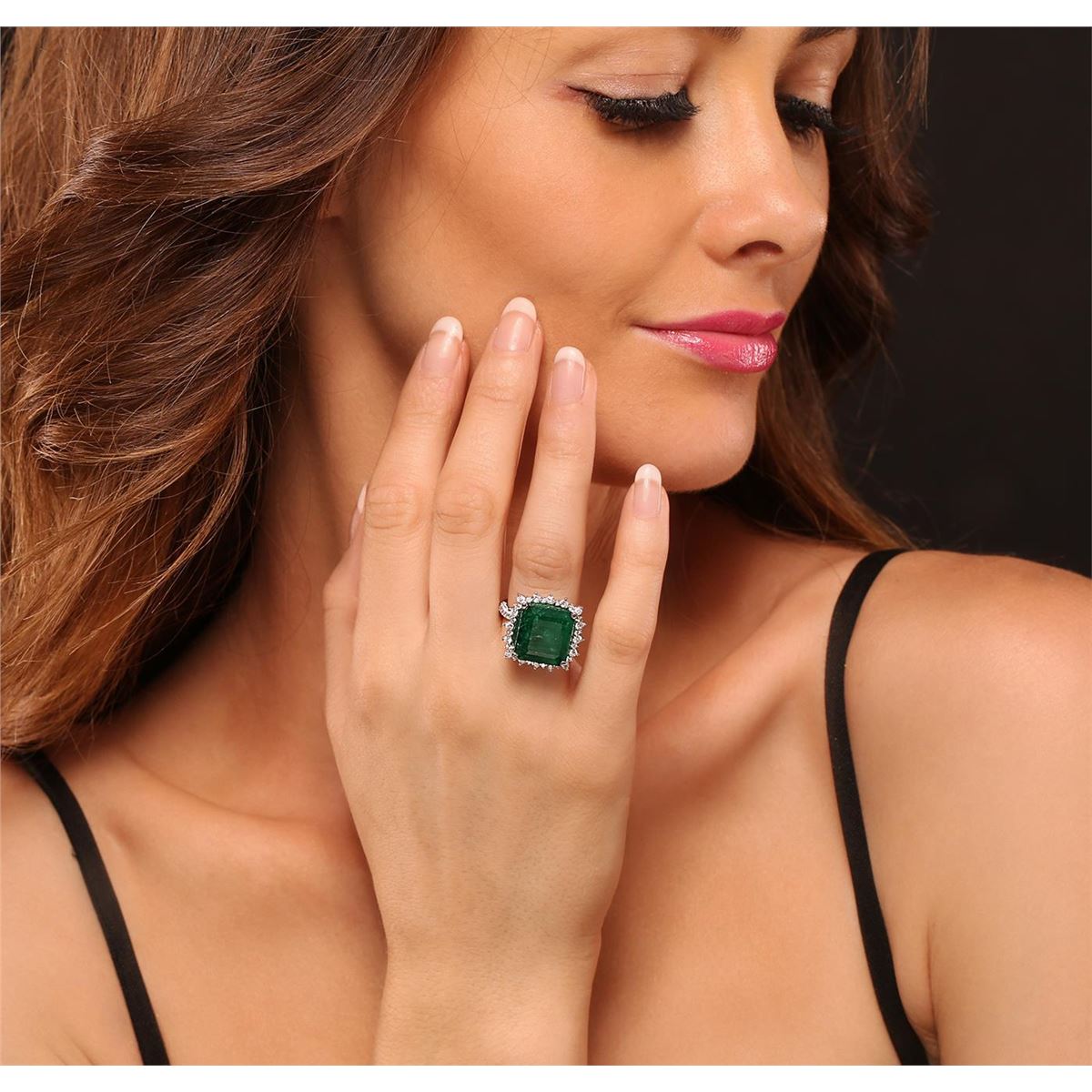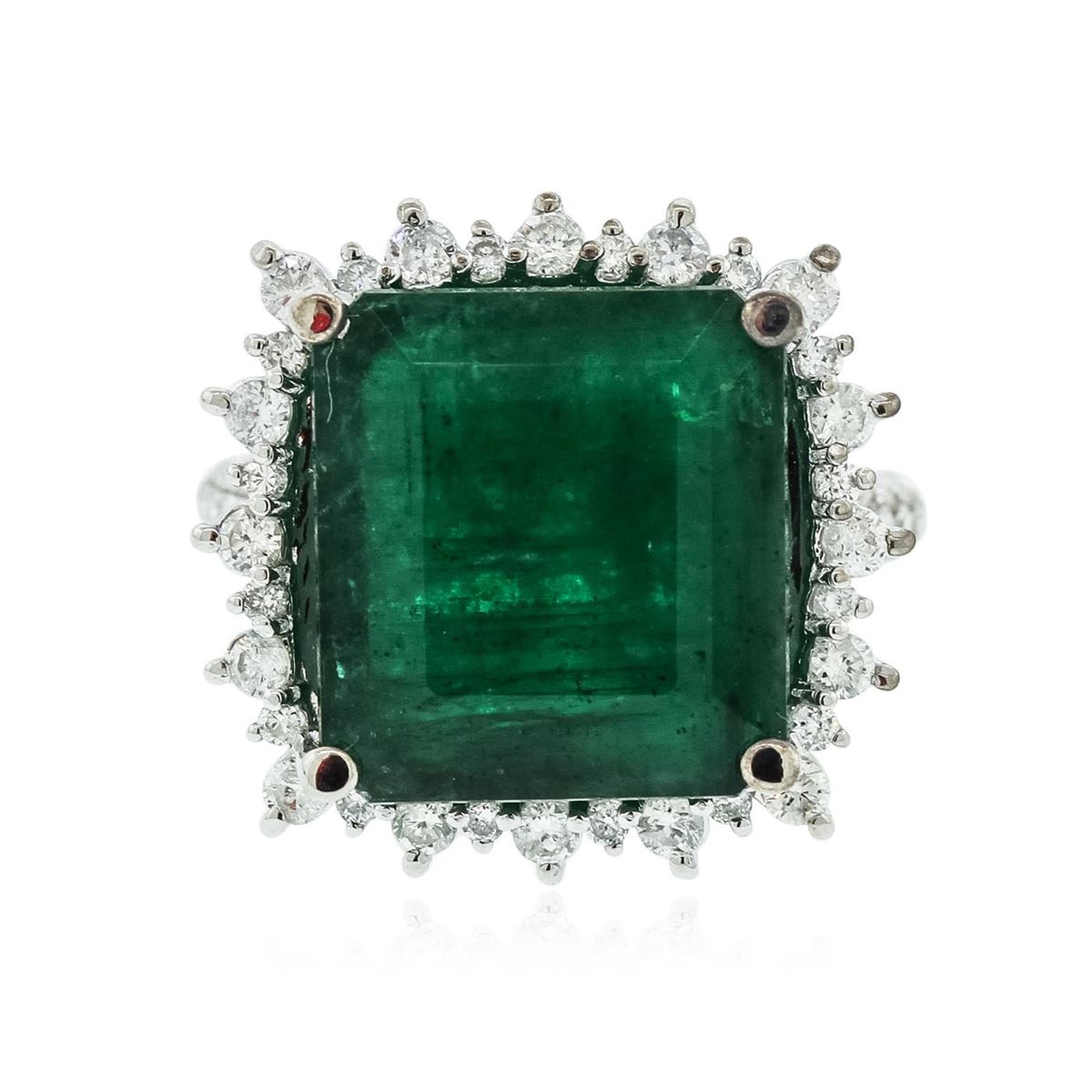 One electronically tested 14KT white gold Ladies combination cast & assembled ring with a bright polish finish. Condition is new. Identified with markings of "14K". Containing: One prong set emerald standard step cut natural emerald, measuring 14.00 x 13.00 x 6.60mm, approximate weight of 8.82ct., clarity is heavily included, type III, medium dark, moderately strong, green color, (GIA G 6/4), cut is good. Colored gemstones are presumed to have been subjected to commonly used and possible undetectable color/clarity enhancement processes. Sixteen prong set round brilliant cut diamonds, measuring 1.80 - 1.80 x 1.08mm (depth est.) approximate total weight of 16 Stones = 0.34ct. Clarity of I-1, Color of I - J, Cut is Good. Sixty prong set round brilliant cut diamonds, measuring 1.20 - 1.00 x 0.66mm (depth est.) approximate total weight of 60 Stones = 0.29ct. Clarity of SI-2 to I-1, Color of G - I, Cut is Very Good. Total Weight of Colored Stones 8.82ct. Total Weight of Diamonds 0.63ct. Total Weight of Ring 7.00gm. GGL Appraised at $17,650.00.