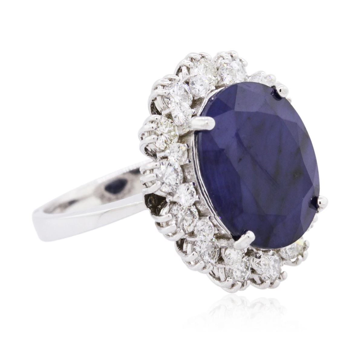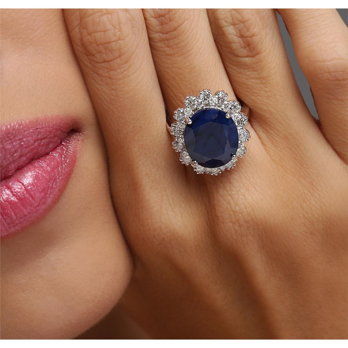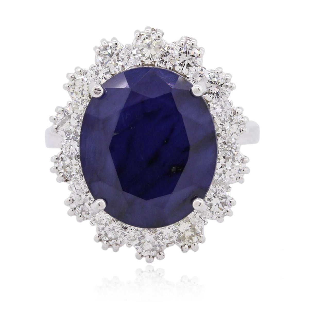 One electronically tested 14KT white gold ladies combination cast & assembled sapphire and diamond ring with a bright polish finish. Identified with markings of "K14". Condition is new. Containing: One prong set oval modified brilliant cut natural blue sapphire, measuring 14.28 x 12.16 x 6.06mm, approximate weight of 8.84ct., clarity is heavily included, type II, medium dark, strong, blue color, (GIA B 6/5), cut is good. Twenty-Eight prong set round brilliant cut diamonds, measuring 2.50 - 1.60 x 1.23mm (depth est.) approximate total weight of 28 Stones = 0.88ct. Clarity: SI-2 to I-1. Color: I - J, Cut is Good. Colored gemstones are presumed to have been subjected to commonly used enhancement processes. All diamonds and colored gemstones are graded in the mounting, unless otherwise stated. Total Weight of Colored Stones 8.84ct. Total Weight of Diamonds 0.88ct. Total Weight of Ring 7.40 grams. GGL Appraised at $5,495.00.