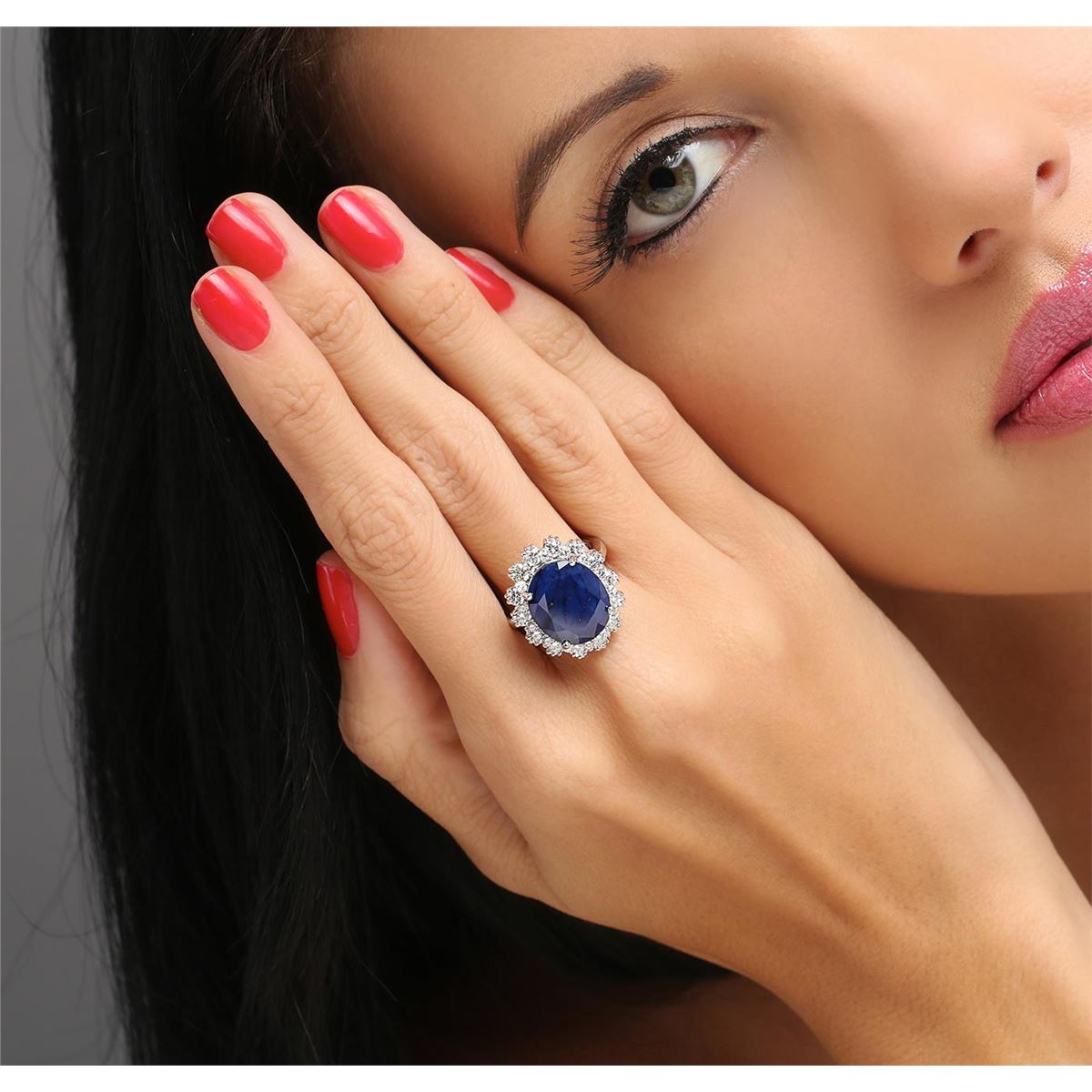 One electronically tested 14KT white gold ladies combination cast & assembled sapphire and diamond ring with a bright polish finish. Identified with markings of "K14". Condition is new. Containing: One prong set oval modified brilliant cut natural blue sapphire, measuring 14.28 x 12.16 x 6.06mm, approximate weight of 8.84ct., clarity is heavily included, type II, medium dark, strong, blue color, (GIA B 6/5), cut is good. Twenty-Eight prong set round brilliant cut diamonds, measuring 2.50 - 1.60 x 1.23mm (depth est.) approximate total weight of 28 Stones = 0.88ct. Clarity: SI-2 to I-1. Color: I - J, Cut is Good. Colored gemstones are presumed to have been subjected to commonly used enhancement processes. All diamonds and colored gemstones are graded in the mounting, unless otherwise stated. Total Weight of Colored Stones 8.84ct. Total Weight of Diamonds 0.88ct. Total Weight of Ring 7.40 grams. GGL Appraised at $5,495.00.