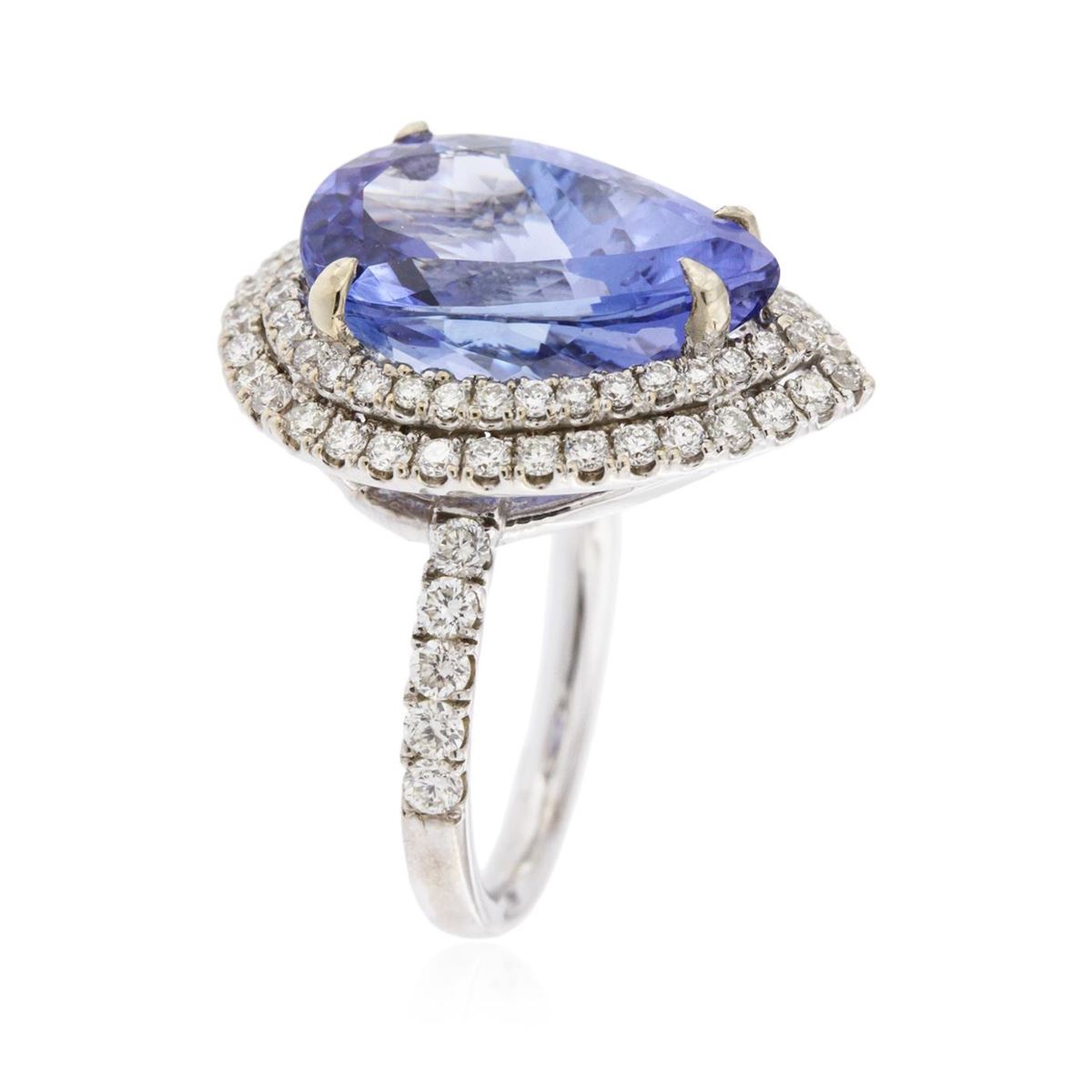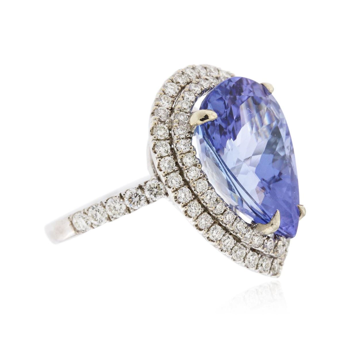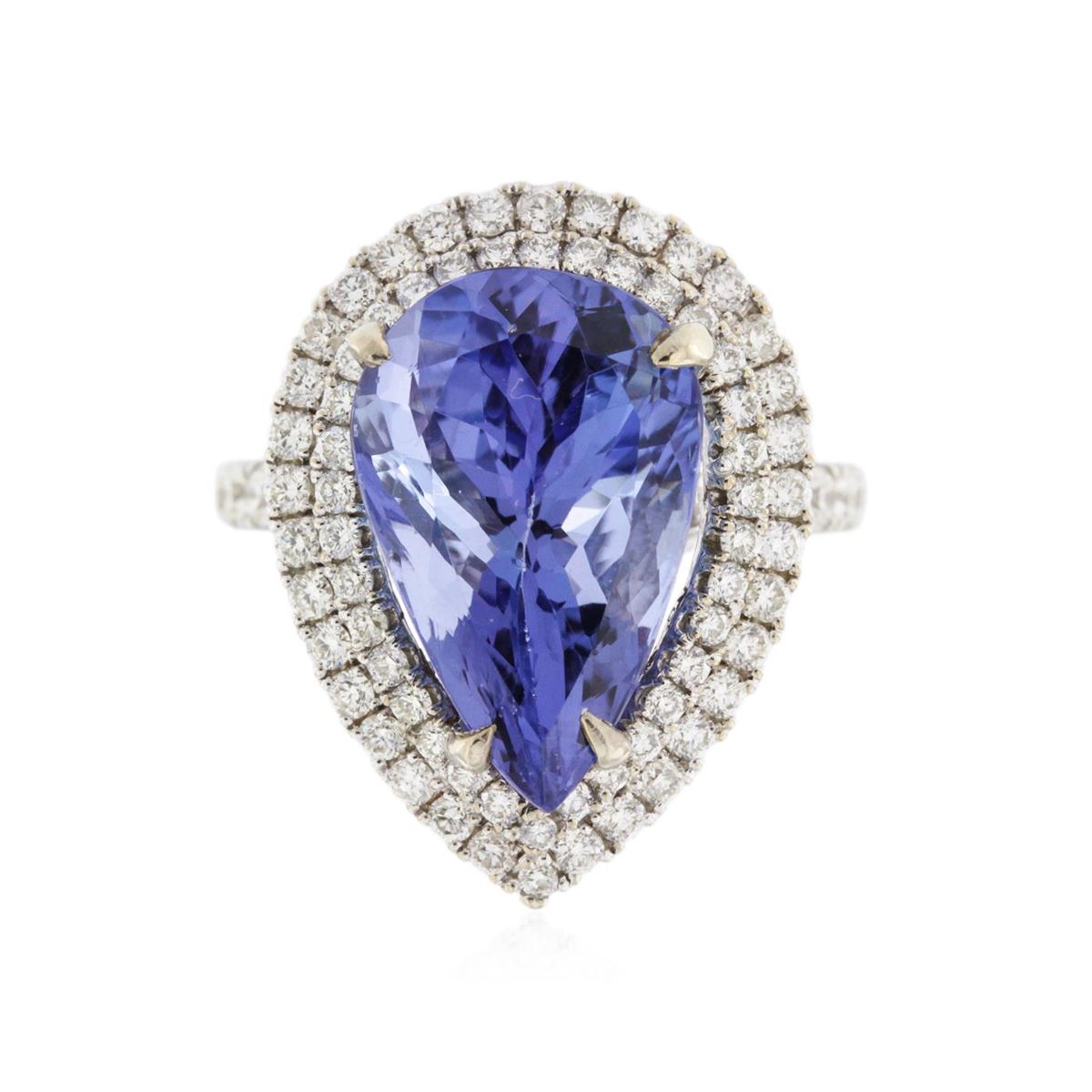 14KT white gold 8.89ct Tanzanite and Diamond Ring A6672. One electronically tested 14KT white gold ladies cast tanzanite and diamond ring with a bright polish finish. The featured tanzanite is set within a two tiered diamond bezel, supported by diamond set shoulders and completed by a two millimeter wide band. Identified with markings of "14K". Condition is new, good workmanship. Containing: One prong set pear mixed cut natural tanzanite, measuring 16.60 x 10.70 x 8.70mm, exact weight 8.89ct., clarity is eye clean, type I, medium light, very slightly grayish, violet color, (GIA V 4/3), cut is good. Transmitting light with no distortion, transparent. Colored Stone Grading Report attached. Graded in the setting.Tanzanite is a very rare gemstone that is only found in the country of Tanzania. Originally discovered in 1967. Tiffany & Company, named the stone Tanzanite. It is found in the Usumburu Mountains that border the Umba Valley of northern Tanzania. Tanzanite occurs in gray, brown, violet, blue, reddish-purple, & green. The gem is interesting because of its exceptional pleochroism. Rotated in different directions a tanzanite will exhibit multiple changes of color. Tanzanite has a low tolerance to ultrasonic cleaning, and should not be cleaned using this method.Eighty prong set round brilliant cut diamonds, measuring 1.60 - 1.40 x 0.90mm (depth est.) approximate. Total Weight of 80 Stones = 1.21ct. Graded in the setting. Clarity: SI-1 to I-1. Color: H - I. Total Weight of Colored Stones 8.89ct. Total Weight of Diamonds 1.21ct. AIG Appraised at $14,680.00.