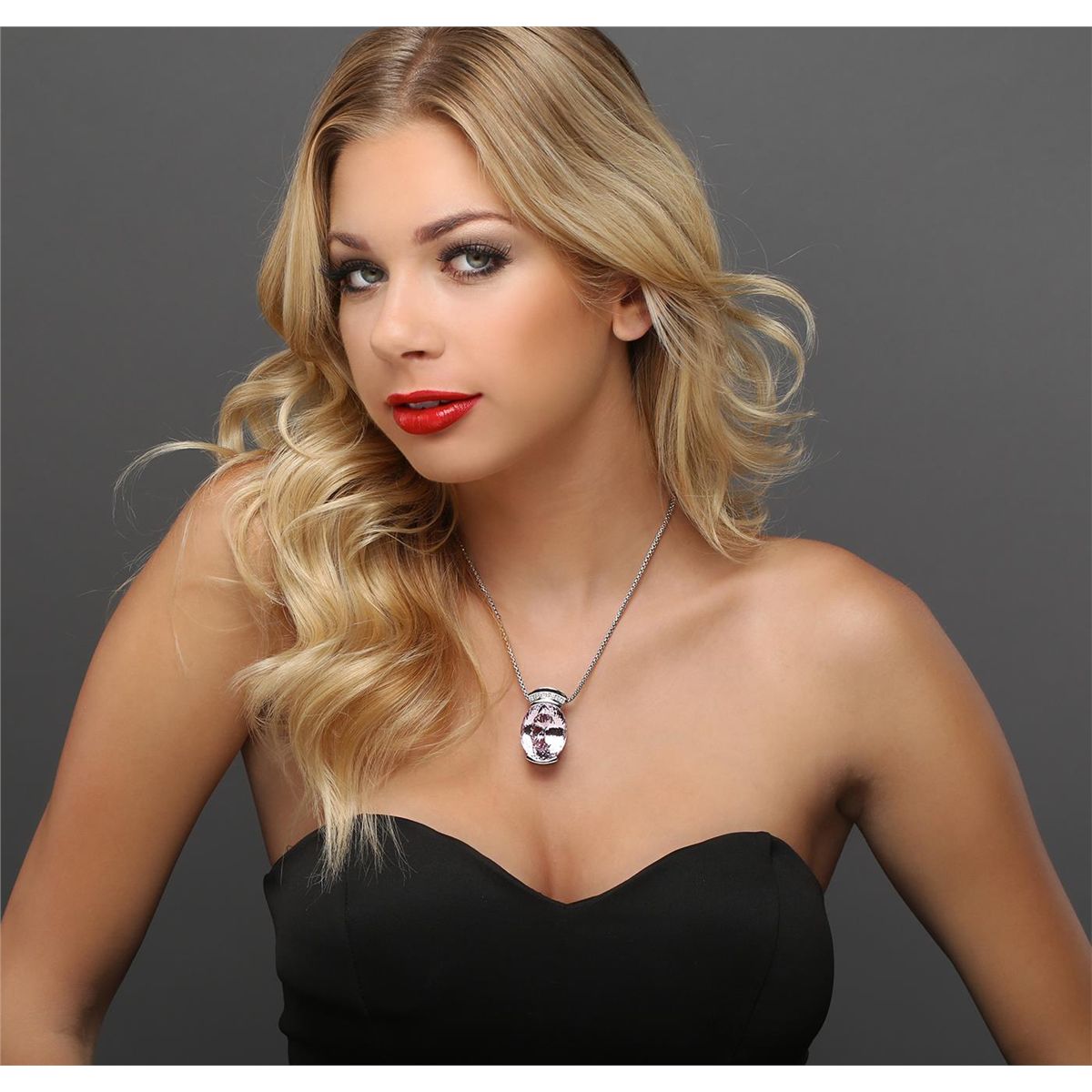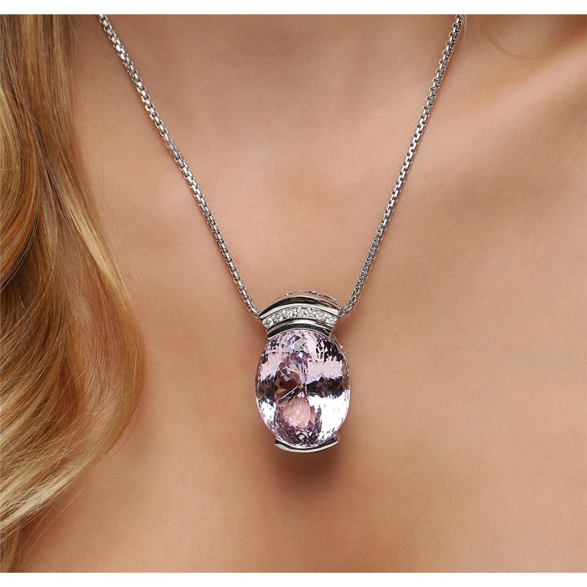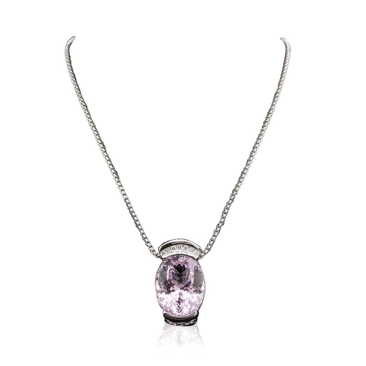One electronically tested 14KT white gold ladies cast & assembled kunzite spodumene and diamond pendant with chain. Condition is new, good workmanship. The slide pendant features a kunzite spodumene completed by a diamond set bail. The pendant is supported by a 14KT white gold designer style chain terminating in a lobster claw clasp. Identified with markings of "14K". Containing: One channel set oval mixed cut natural kunzite, measuring 29.00 x 23.50 x 17.00mm, 8%. bulge factor, approximate weight of 80.22ct., clarity is eye clean, type I, medium light, very slightly brownish, strongly purplish red color, (GIA stpR 4/3), cut is good. Transmitting light with no distortion, transparent. Colored Stone Grading Report attached. Graded in the setting. Seven channel set round brilliant cut diamonds, measuring 2.60 - 2.60 x 1.56mm (depth est.) approximate. Total Weight of 7 Stones = 0.46ct. Graded in the setting. Clarity: SI-2 to I-1. Color: F - G. Total Weight of Colored Stones 80.22ct. Total Weight of Diamonds 0.46ct. Total Weight of Pendant With Chain 35.80 grams. AIG Appraised at $36,455.00.