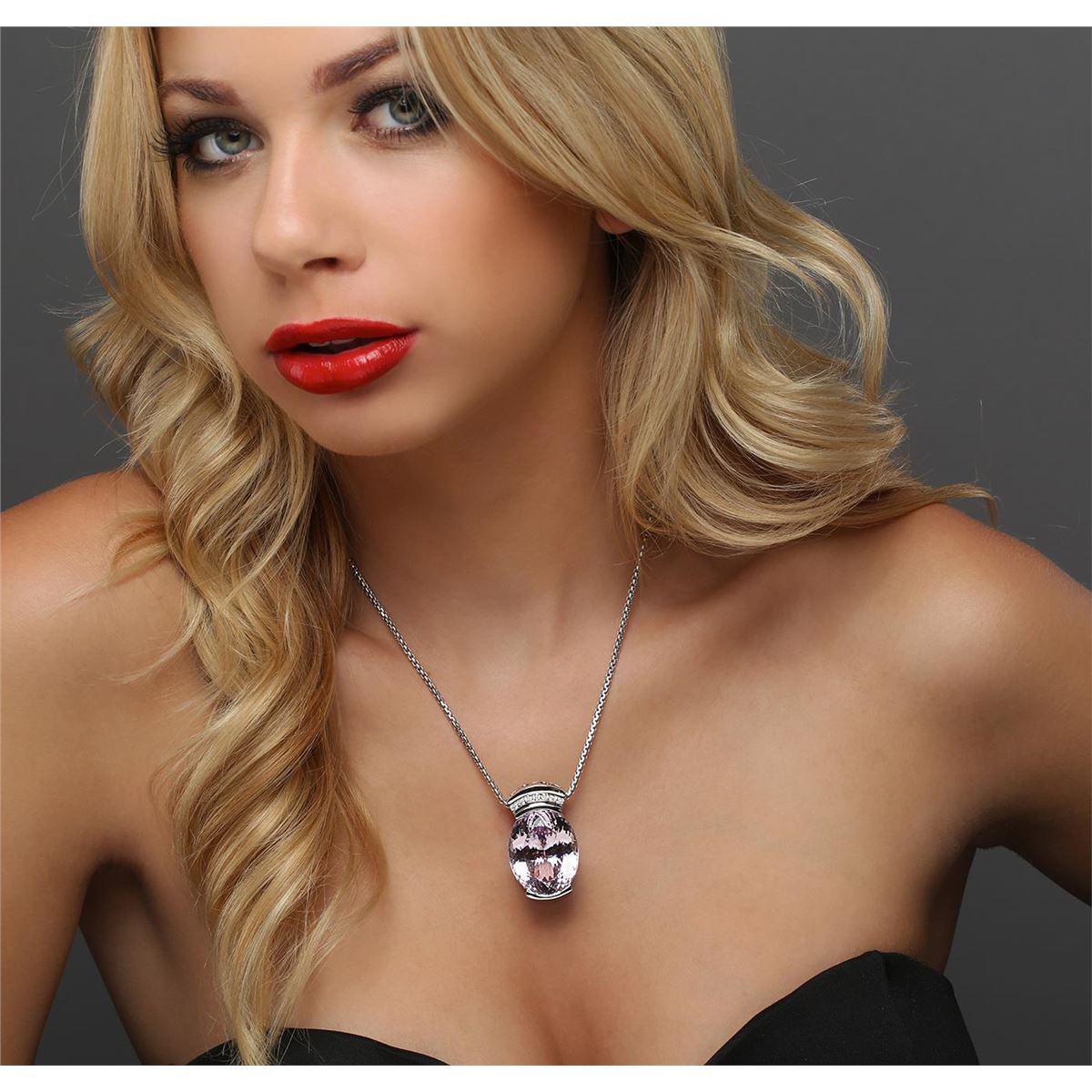 One electronically tested 14KT white gold ladies cast & assembled kunzite spodumene and diamond pendant with chain. Condition is new, good workmanship. The slide pendant features a kunzite spodumene completed by a diamond set bail. The pendant is supported by a 14KT white gold designer style chain terminating in a lobster claw clasp. Identified with markings of "14K". Containing: One channel set oval mixed cut natural kunzite, measuring 29.00 x 23.50 x 17.00mm, 8%. bulge factor, approximate weight of 80.22ct., clarity is eye clean, type I, medium light, very slightly brownish, strongly purplish red color, (GIA stpR 4/3), cut is good. Transmitting light with no distortion, transparent. Colored Stone Grading Report attached. Graded in the setting. Seven channel set round brilliant cut diamonds, measuring 2.60 - 2.60 x 1.56mm (depth est.) approximate. Total Weight of 7 Stones = 0.46ct. Graded in the setting. Clarity: SI-2 to I-1. Color: F - G. Total Weight of Colored Stones 80.22ct. Total Weight of Diamonds 0.46ct. Total Weight of Pendant With Chain 35.80 grams. AIG Appraised at $36,455.00.