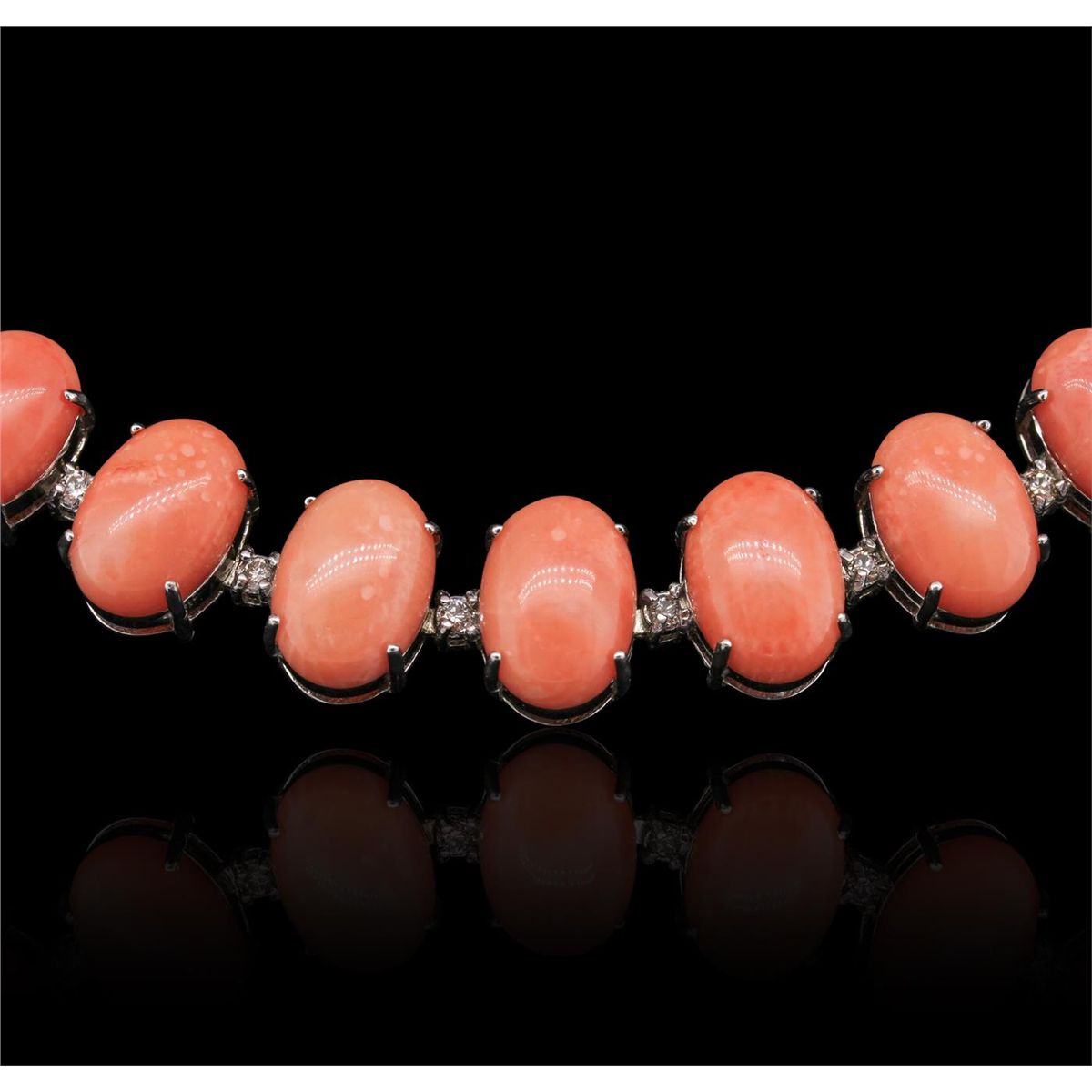 One electronically tested 14KT white gold ladies cast & assembled coral and diamond necklace. Condition is new, good workmanship. Eighteen inch length necklace features a flexible tapering coral and diamond ribbon, terminating in a concealed clasp with safety. Bright polish finish. Identified with markings of ""14K"". Containing: Seven prong set oval cabochon cut natural salmon corals, measuring 14.00 x 10.00 x 4.50mm, 5% bulge factor, approximate total weight of 33.21ct., clarity is severely included, medium dark, very slightly brownish, reddish orange color, (GIA rO 6/3), cut is good. Transmitting light very diffusely, opaque. Naturally occurring internal & external characteristics are present. Measurements & the color grade are an average for the group. Graded in the setting. Fourteen prong set oval cabochon cut natural salmon corals, measuring 10.00 x 7.80 x 3.50mm, 5% bulge factor, approximate total weight of 28.70ct., clarity is severely included, medium dark, very slightly brownish, reddish orange color, (GIA rO 6/3), cut is good. Transmitting light very diffusely, opaque. Naturally occurring internal & external characteristics are present. Measurements & the color grade are an average for the group. Graded in the setting. Twenty-two prong set oval cabochon cut natural salmon corals, measuring 7.50 x 6.00 x 2.60mm, 5% bulge factor, approximate total weight of 19.36ct., clarity is severely included, medium dark, very slightly brownish, reddish orange color, (GIA rO 6/3), cut is good. Transmitting light very diffusely, opaque. Naturally occurring internal & external characteristics are present. Measurements & the color grade are an average for the group. Graded in the setting. Salmon Coral is formed undersea by microscopic animals called coral polyps. These tiny, creatures form minute, hard shells. As a colony grows, it takes on complex branching, tree-like forms which allows the maximum number of polyps to be fed by the nutrients in the water. It grows about one quarter inch per year. This color of coral is commonly treated to improve or change the color and stability. Evidence that may confirm this is typically lacking. Forty-Two prong set round brilliant cut diamonds, measuring 2.50 - 2.40 x 1.47mm (depth est.) approximate total weight of 42 Stones = 2.36ct. Graded in the setting. Clarity SI-2 to I-2 Color G - I Total Weight of Colored Stones 81.27 ct. Total Weight of Diamonds 2.36 ct. Total Weight of Necklace 64.44 grams AIG Appraised at $38,655.00.