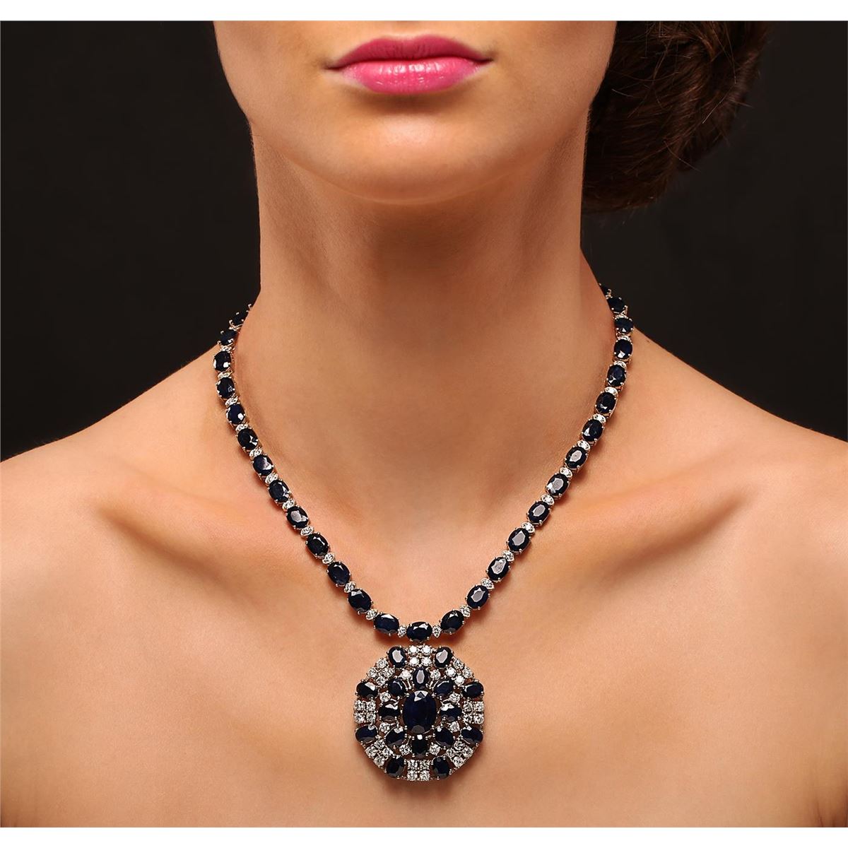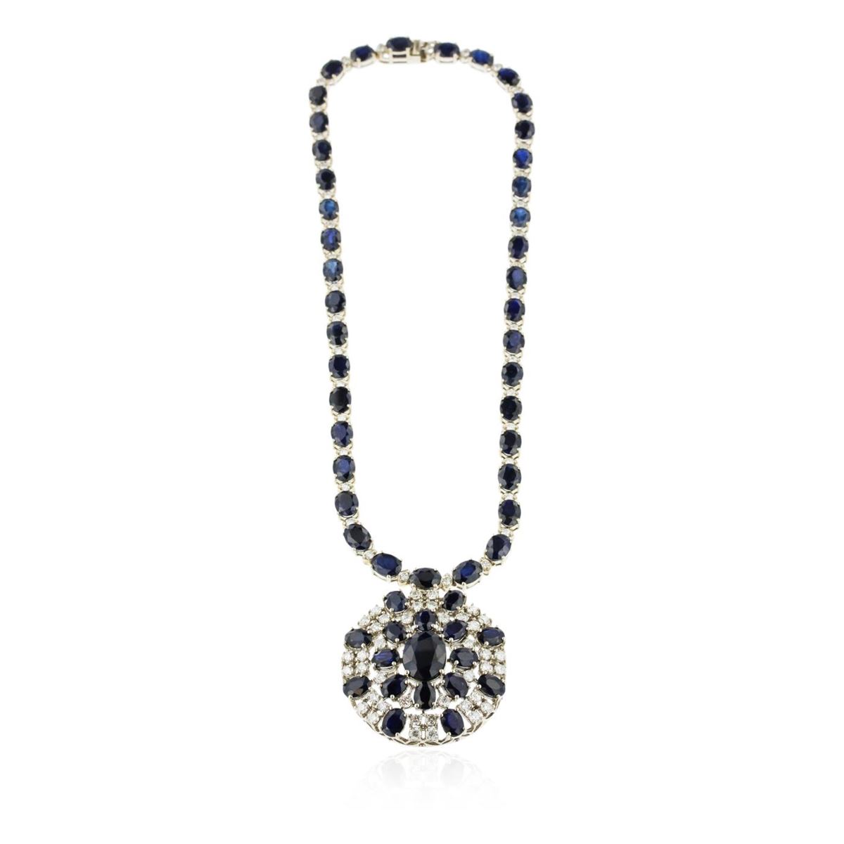 One electronically tested 14KT gold ladies cast & assembled sapphire and diamond necklace with a bright polish finish. The seventeen inch length necklace features a pendant consisting of a sapphire set within a sapphire and diamond lattice supported by a sapphire and diamond ribbon, terminating in a concealed clasp with safety. Identified with markings of "14K". Condition is new, good workmanship. Containing: One prong set oval mixed cut natural blue sapphire, measuring 12.80 x 10.05 x 6.00mm, 8% bulge factor, approximate weight of 6.77ct, clarity is severely included, type II, medium dark, very slightly grayish, violetish blue color, (GIA vB 6/3), cut is good. Transmitting light very diffusely, opaque. Naturally occurring internal & external characteristics are present. Indications of multiple laboratory enhancements, including high temperature heat treatment. Colored Stone Grading Report attached. Graded in the setting. Thirty-nine prong set oval mixed cut natural blue sapphires, measuring 8.00 x 6.00 x 3.70mm, 8% bulge factor, approximate. Total Weight of 61.23ct, clarity is heavily included, type II, dark, very slightly grayish, violetish blue color, (GIA vB 7/3), cut is good. Transmitting light somewhat diffusely, transparent to translucent. Naturally occurring internal & external characteristics are present. Indications of multiple laboratory enhancements, including high temperature diffusion treatment. Measurements & the color grade are an average for the group. Graded in the setting. Sixteen prong set oval mixed cut natural blue sapphires, measuring 7.00 x 5.20 x 3.38mm, 10% bulge factor, approximate. Total Weight of 17.76ct, clarity is heavily included, type II, dark, very slightly grayish, violetish blue color, (GIA vB 7/3), cut is good. Transmitting light somewhat diffusely, transparent to translucent. Naturally occurring internal & external characteristics are present. Indications of multiple laboratory enhancements, including high temperature diffusion treatment. Measurements & the color grade are an average for the group. Graded in the setting. Forty prong set round brilliant cut diamonds, measuring 3.10 - 3.00 x 1.83mm (depth est.) approximate. Total Weight of 40 Stones = 4.25ct. Graded in the setting. Clarity: SI-2 to I-2. Color: G - I Thirty-Nine bead set round brilliant cut diamonds, measuring 2.60 - 2.50 x 1.53mm (depth est.) approximate. Total Weight of 39 Stones = 2.46ct. Graded in the setting. Clarity: SI-2 to I-2. Color: H - J. Total Weight of Colored Stones 85.76ct. Total Weight of Diamonds 6.71ct. Total Weight of Necklace 55.80 grams. AIG Appraised at $40,345.00.
