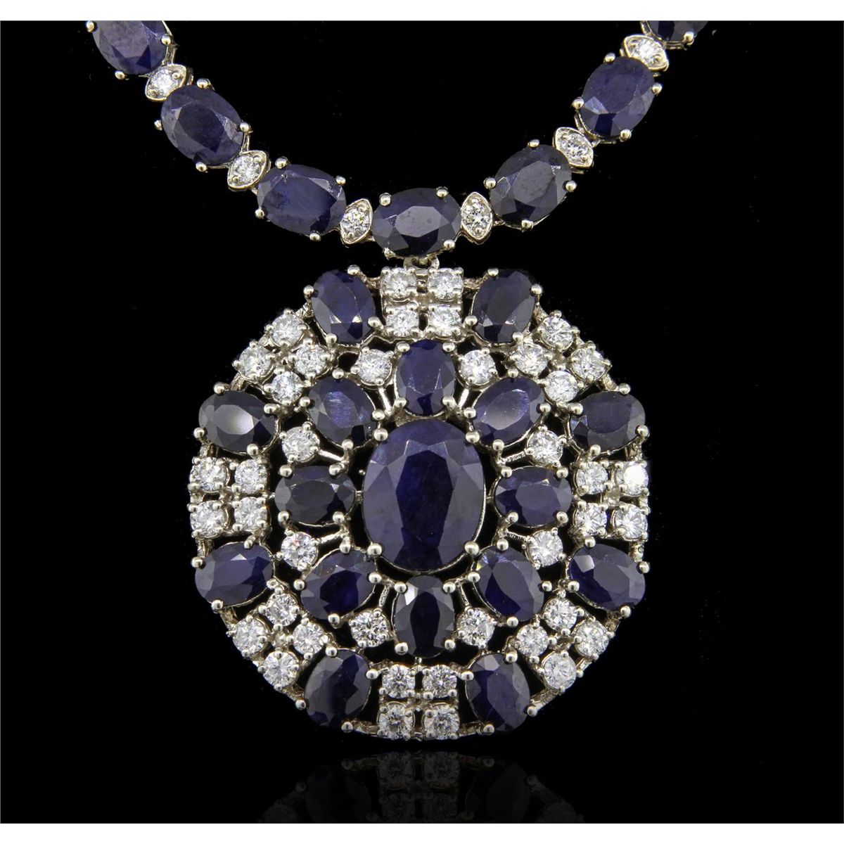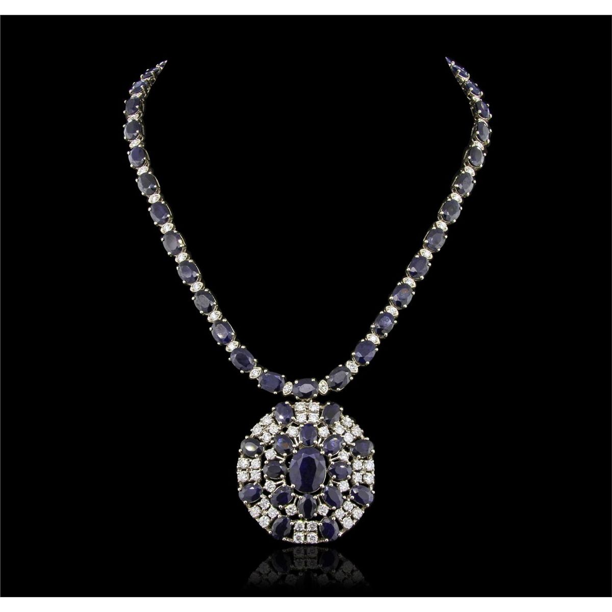 One electronically tested 14KT gold ladies cast & assembled sapphire and diamond necklace with a bright polish finish. The seventeen inch length necklace features a pendant consisting of a sapphire set within a sapphire and diamond lattice supported by a sapphire and diamond ribbon, terminating in a concealed clasp with safety. Identified with markings of "14K". Condition is new, good workmanship. Containing: One prong set oval mixed cut natural blue sapphire, measuring 12.80 x 10.05 x 6.00mm, 8% bulge factor, approximate weight of 6.77ct, clarity is severely included, type II, medium dark, very slightly grayish, violetish blue color, (GIA vB 6/3), cut is good. Transmitting light very diffusely, opaque. Naturally occurring internal & external characteristics are present. Indications of multiple laboratory enhancements, including high temperature heat treatment. Colored Stone Grading Report attached. Graded in the setting. Thirty-nine prong set oval mixed cut natural blue sapphires, measuring 8.00 x 6.00 x 3.70mm, 8% bulge factor, approximate. Total Weight of 61.23ct, clarity is heavily included, type II, dark, very slightly grayish, violetish blue color, (GIA vB 7/3), cut is good. Transmitting light somewhat diffusely, transparent to translucent. Naturally occurring internal & external characteristics are present. Indications of multiple laboratory enhancements, including high temperature diffusion treatment. Measurements & the color grade are an average for the group. Graded in the setting. Sixteen prong set oval mixed cut natural blue sapphires, measuring 7.00 x 5.20 x 3.38mm, 10% bulge factor, approximate. Total Weight of 17.76ct, clarity is heavily included, type II, dark, very slightly grayish, violetish blue color, (GIA vB 7/3), cut is good. Transmitting light somewhat diffusely, transparent to translucent. Naturally occurring internal & external characteristics are present. Indications of multiple laboratory enhancements, including high temperature diffusion treatment. Measurements & the color grade are an average for the group. Graded in the setting. Forty prong set round brilliant cut diamonds, measuring 3.10 - 3.00 x 1.83mm (depth est.) approximate. Total Weight of 40 Stones = 4.25ct. Graded in the setting. Clarity: SI-2 to I-2. Color: G - I Thirty-Nine bead set round brilliant cut diamonds, measuring 2.60 - 2.50 x 1.53mm (depth est.) approximate. Total Weight of 39 Stones = 2.46ct. Graded in the setting. Clarity: SI-2 to I-2. Color: H - J. Total Weight of Colored Stones 85.76ct. Total Weight of Diamonds 6.71ct. Total Weight of Necklace 55.80 grams. AIG Appraised at $40,345.00.