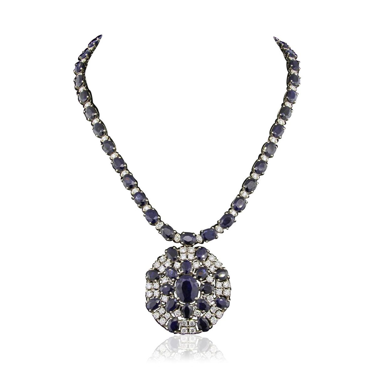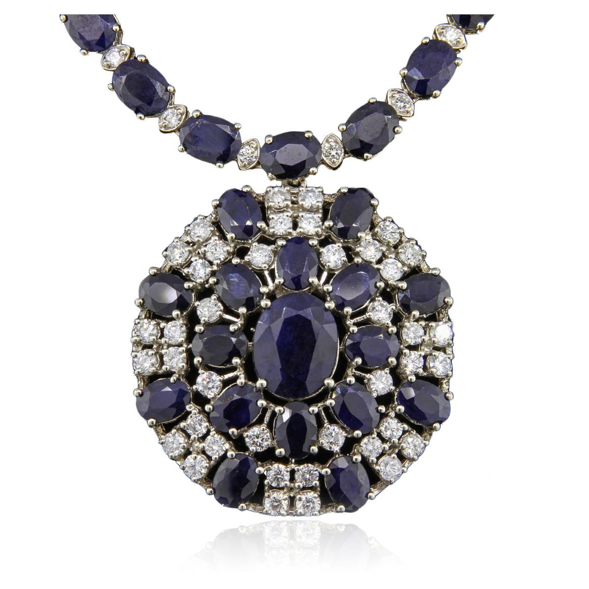 One electronically tested 14KT gold ladies cast & assembled sapphire and diamond necklace with a bright polish finish. The seventeen inch length necklace features a pendant consisting of a sapphire set within a sapphire and diamond lattice supported by a sapphire and diamond ribbon, terminating in a concealed clasp with safety. Identified with markings of "14K". Condition is new, good workmanship. Containing: One prong set oval mixed cut natural blue sapphire, measuring 12.80 x 10.05 x 6.00mm, 8% bulge factor, approximate weight of 6.77ct, clarity is severely included, type II, medium dark, very slightly grayish, violetish blue color, (GIA vB 6/3), cut is good. Transmitting light very diffusely, opaque. Naturally occurring internal & external characteristics are present. Indications of multiple laboratory enhancements, including high temperature heat treatment. Colored Stone Grading Report attached. Graded in the setting. Thirty-nine prong set oval mixed cut natural blue sapphires, measuring 8.00 x 6.00 x 3.70mm, 8% bulge factor, approximate. Total Weight of 61.23ct, clarity is heavily included, type II, dark, very slightly grayish, violetish blue color, (GIA vB 7/3), cut is good. Transmitting light somewhat diffusely, transparent to translucent. Naturally occurring internal & external characteristics are present. Indications of multiple laboratory enhancements, including high temperature diffusion treatment. Measurements & the color grade are an average for the group. Graded in the setting. Sixteen prong set oval mixed cut natural blue sapphires, measuring 7.00 x 5.20 x 3.38mm, 10% bulge factor, approximate. Total Weight of 17.76ct, clarity is heavily included, type II, dark, very slightly grayish, violetish blue color, (GIA vB 7/3), cut is good. Transmitting light somewhat diffusely, transparent to translucent. Naturally occurring internal & external characteristics are present. Indications of multiple laboratory enhancements, including high temperature diffusion treatment. Measurements & the color grade are an average for the group. Graded in the setting. Forty prong set round brilliant cut diamonds, measuring 3.10 - 3.00 x 1.83mm (depth est.) approximate. Total Weight of 40 Stones = 4.25ct. Graded in the setting. Clarity: SI-2 to I-2. Color: G - I Thirty-Nine bead set round brilliant cut diamonds, measuring 2.60 - 2.50 x 1.53mm (depth est.) approximate. Total Weight of 39 Stones = 2.46ct. Graded in the setting. Clarity: SI-2 to I-2. Color: H - J. Total Weight of Colored Stones 85.76ct. Total Weight of Diamonds 6.71ct. Total Weight of Necklace 55.80 grams. AIG Appraised at $40,345.00.