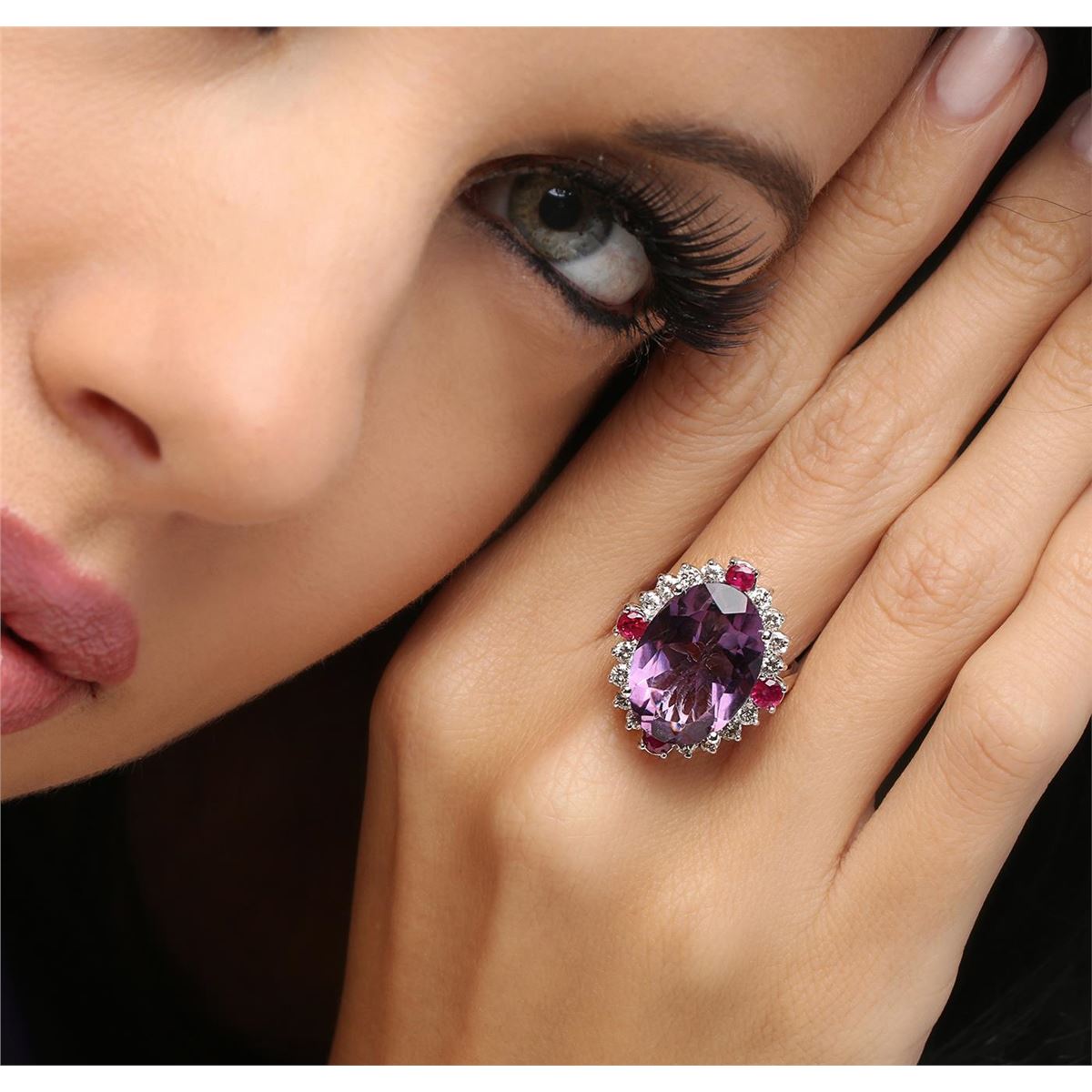 One electronically tested 14KT white gold ladies cast amethyst, ruby and diamond ring with a bright polish finish. The featured amethyst is set within a ruby and diamond bezel, completed by a two and one-half millimeter wide band. Identified with markings of "K14". Condition is new, good workmanship. Containing: One prong set oval mixed cut natural amethyst, measuring 17.90 x 12.00 x 7.15mm, 6% bulge factor, approximate weight of 9.01ct., clarity is slightly included, type II, medium dark, very slightly grayish, purple color, (GIA P 6/3), cut is good. Transmitting light with a minimum of distortion, transparent. Naturally occurring internal & external characteristics are present. Colored Stone Grading Report attached. Graded in the setting. Four prong set round mixed cut natural rubies, measuring 3.20 - 3.20 x 2.08 mm, approximate total weight of 0.68ct., clarity is moderately included, type II, medium dark, moderately strong, slightly purplish red color, (GIA slpR 6/4), cut is good. Transmitting light with a minimum of distortion, transparent. Naturally occurring internal & external characteristics are present. Color grade is an average for the group. Graded in the setting. Sixteen prong set round brilliant cut diamonds, measuring 2.40 - 2.30 x 1.41mm (depth est.) approximate total weight of 16 Stones = 0.86ct. Graded in the setting. Clarity: I-1 to I-2. Color: I - K. Total Weight of Colored Stones 9.69ct. Total Weight of Diamonds 0.86ct. Total Weight of Ring 8.80 grams. AIG Appraised at $3,660.00.