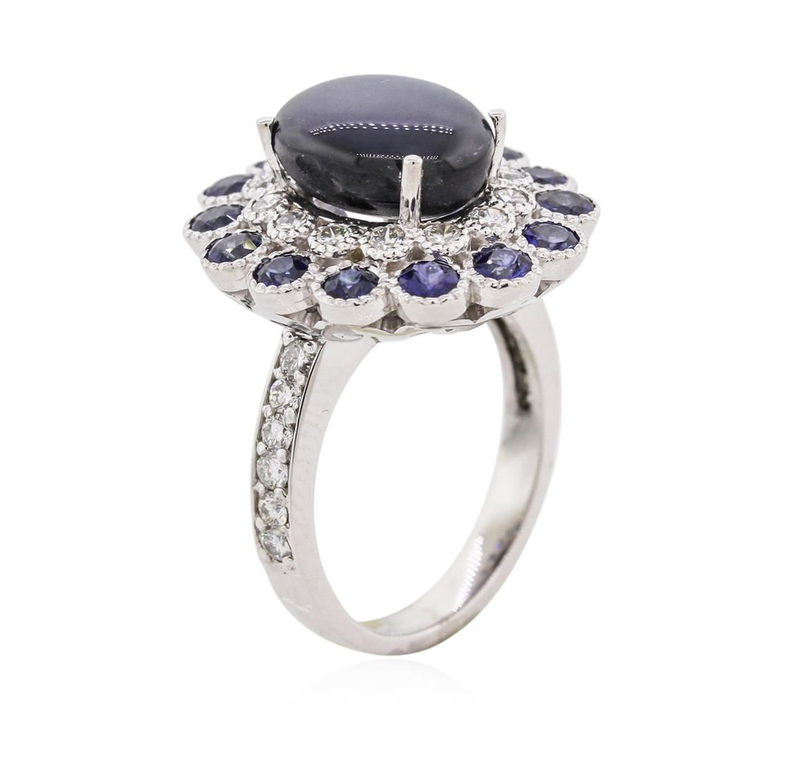 One electronically tested 14KT white gold ladies cast sapphire and diamond ring with a bright polish finish. Identified with markings of "14K". Condition is new. Containing: One prong set oval cabochon cut natural blue star sapphire, measuring 12.00. x 8.50 x 6.50mm, approximate weight of 7.16ct., clarity is moderately included, medium, moderately strong, blue color, (GIA B 5/4), cut is good. This stone has a incomplete six ray star with medium intensity and fair movement. Fourteen gypsy set round modified brilliant cut natural blue sapphires, measuring 3.00. - 3.00. x 1.95 mm, approximate total weight of 1.96ct., clarity is heavily included, type II, medium, moderately strong, blue color, (GIA B 5/4), cut is good. Twenty-Six prong set round brilliant cut diamonds, measuring 1.80 - 1.80 x 1.08mm (depth est.) approximate total weight of 26 Stones = 0.55ct. Clarity: SI-1 to I-1. Color: I - J, Cut is Good. Colored gemstones are presumed to have been subjected to commonly used enhancement processes. All diamonds and colored gemstones are graded in the mounting, unless otherwise stated. Total Weight of Colored Stones 9.12ct. Total Weight of Diamonds 0.55ct. Total Weight of Ring 9.60 grams. GGL Appraised at $4,790.00.